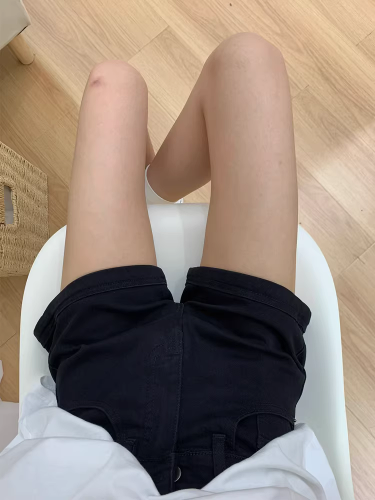 - Quần short denim đen nữ mùa hè 2025, size lớn, cạp cao, co giãn, che hông, tôn dáng, kiểu dáng chữ A ôm hông