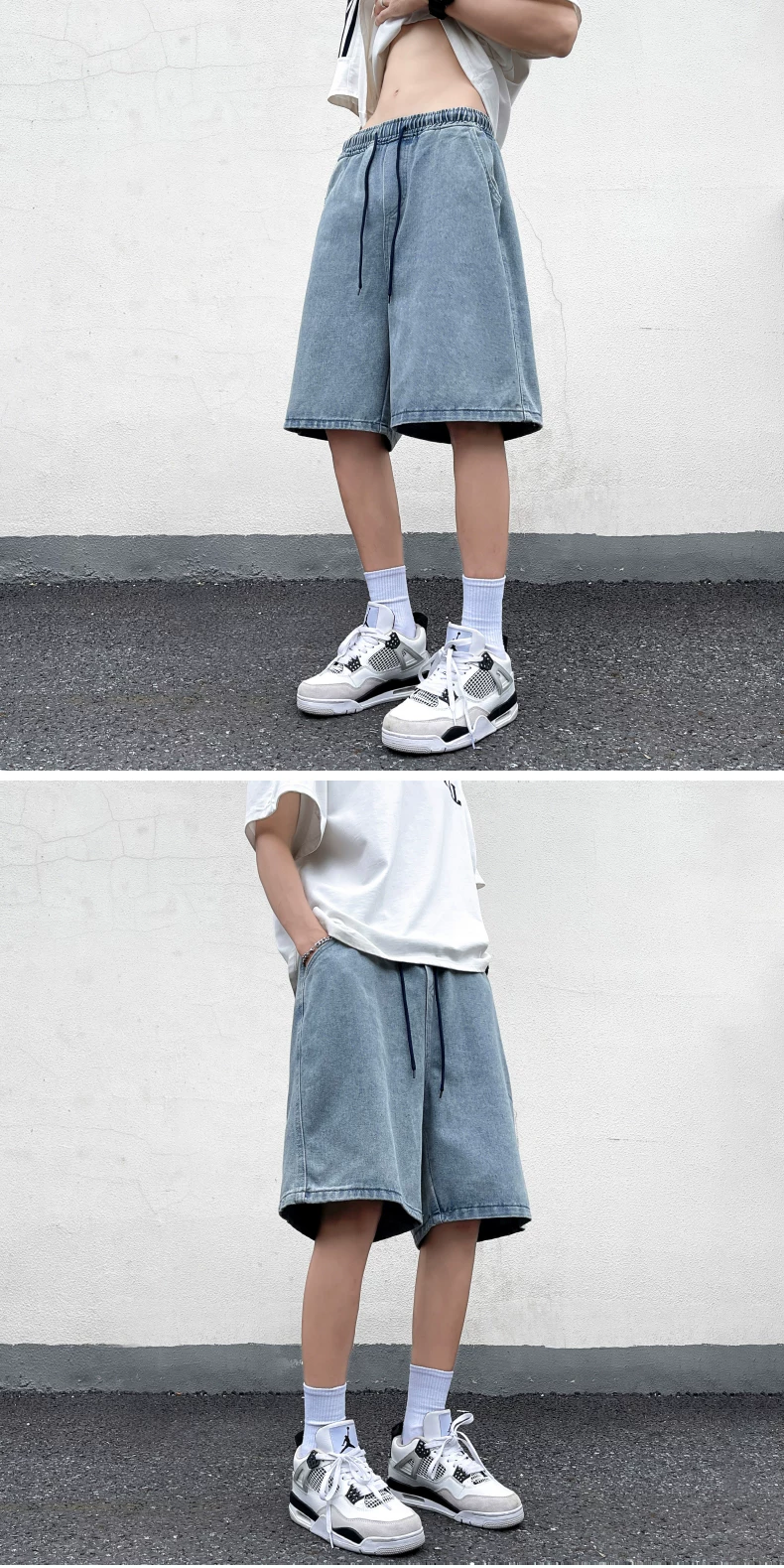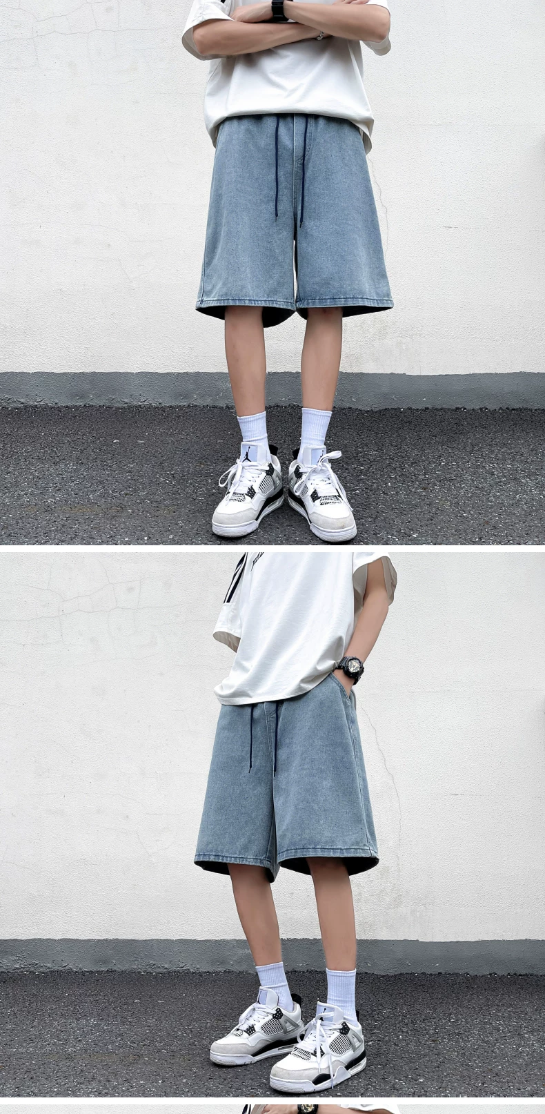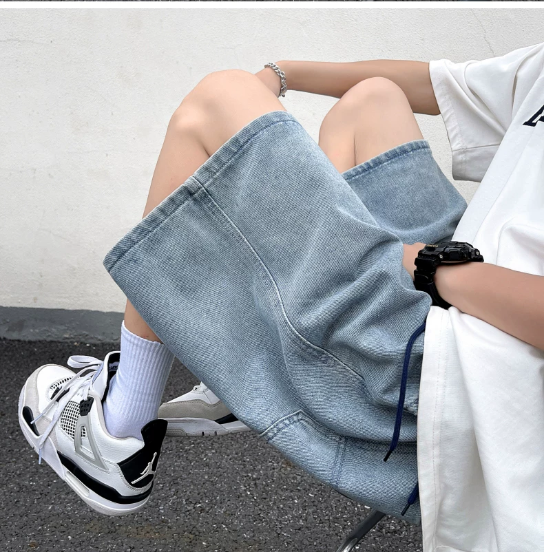 Quần short denim kiểu Mỹ mùa hè dành cho nam, thương hiệu thời trang Nhật Bản, quần ống rộng dáng thẳng năm phần, quần dài vừa ống rộng phong cách cá tính.