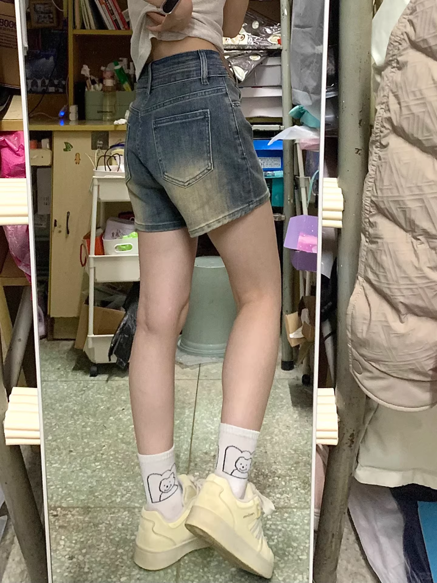 - Quần short denim màu xanh cổ điển dành cho nữ, kiểu dáng mỏng mùa hè, cỡ lớn, lưng cao, co giãn, che hông, quần ống rộng chữ A tôn dáng.