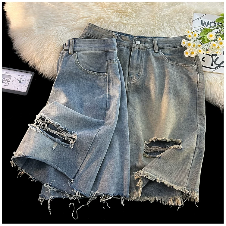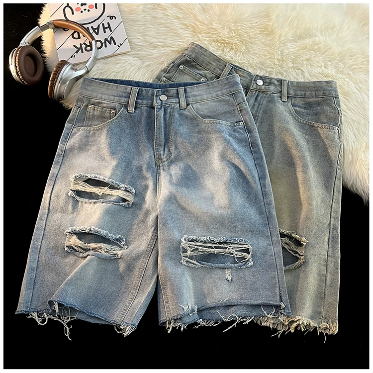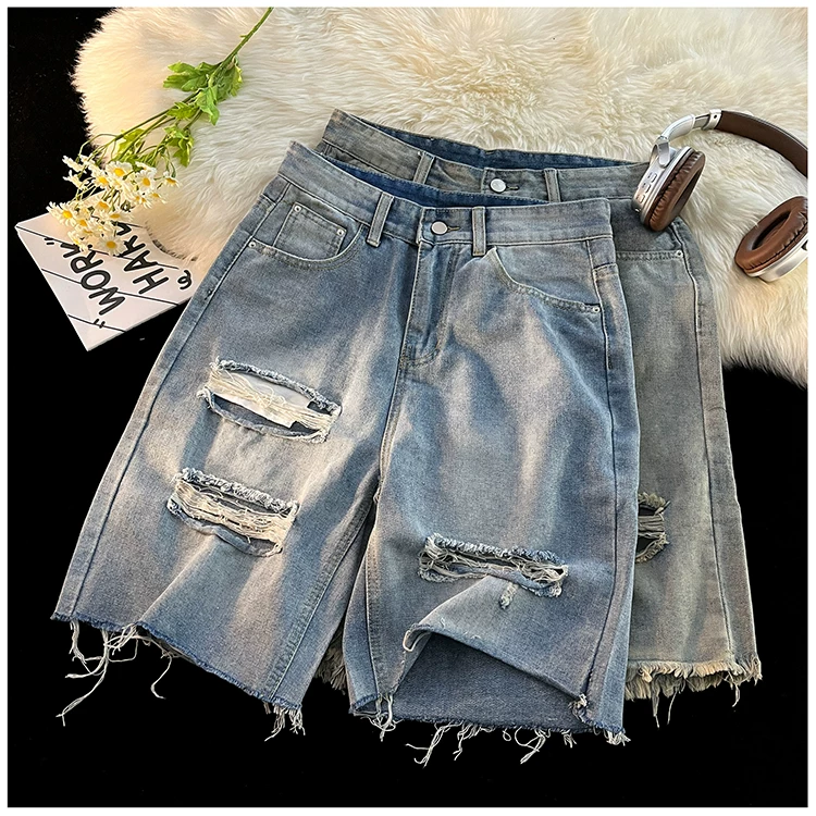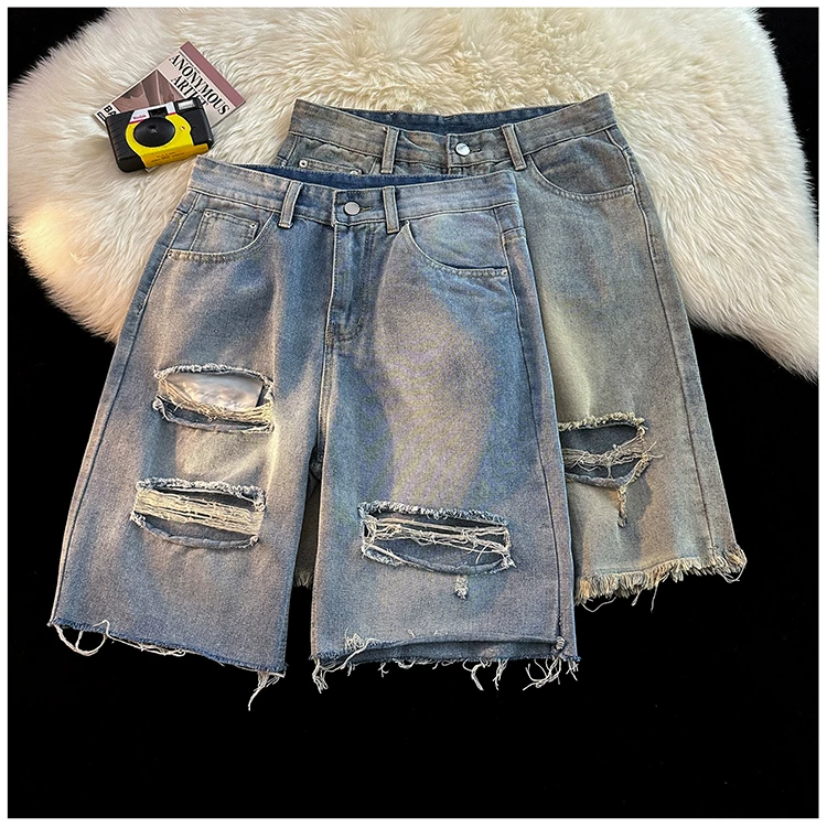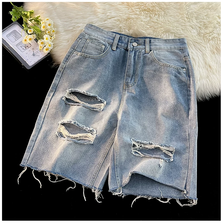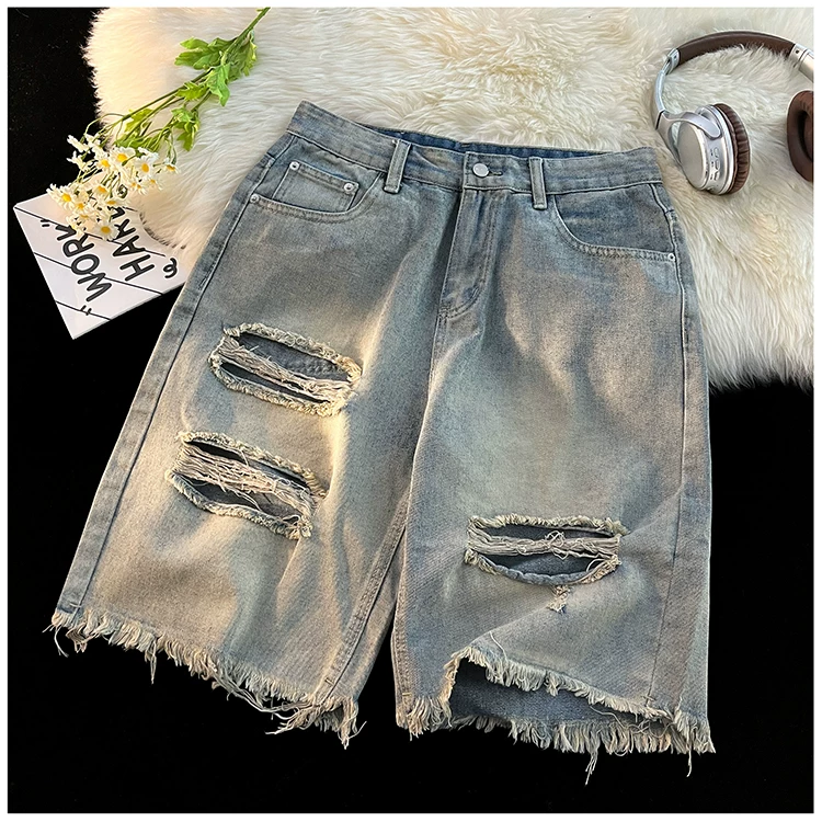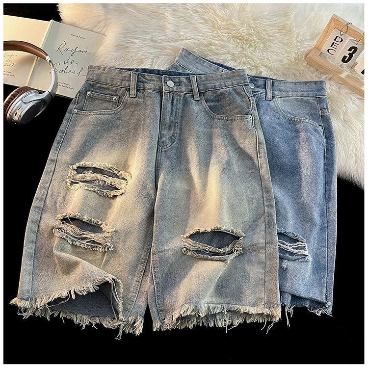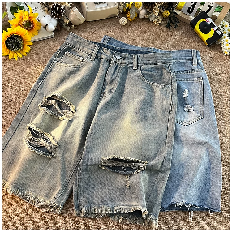 Quần short denim rách cho nam, phong cách Mỹ thời thượng, quần đã qua xử lý giặt mềm, dáng rộng mùa hè, quần short năm phần cá tính và sành điệu.