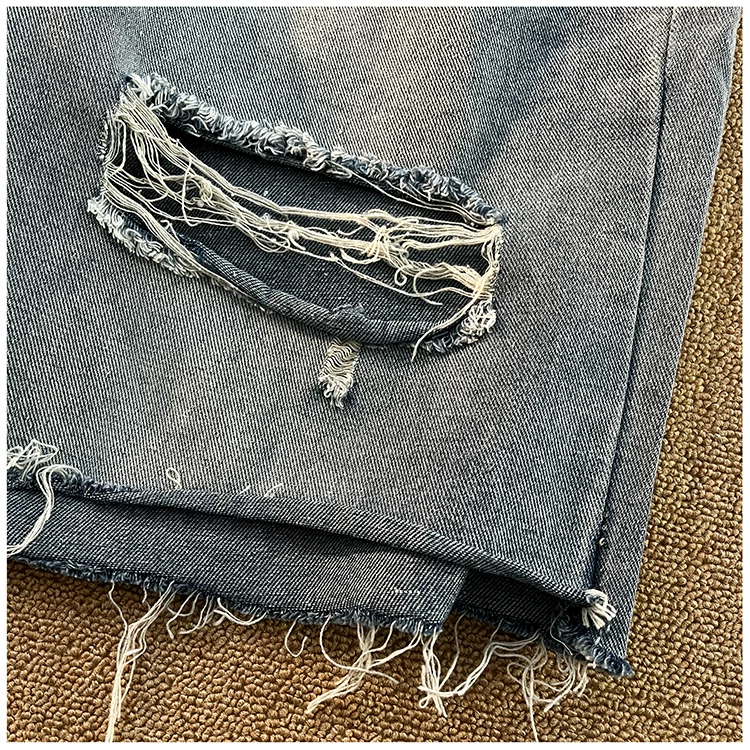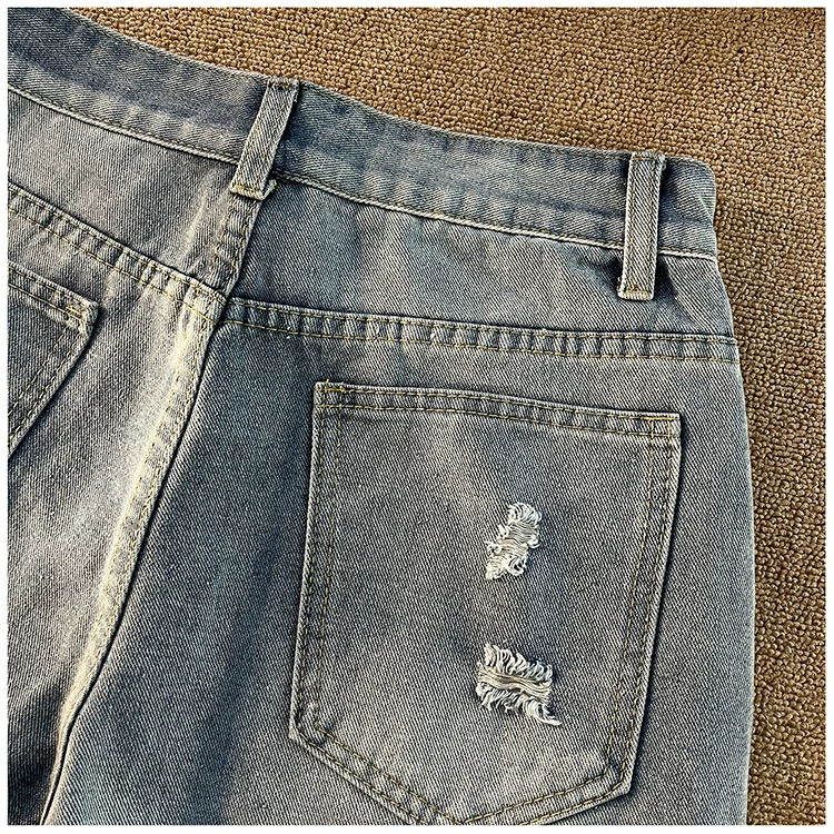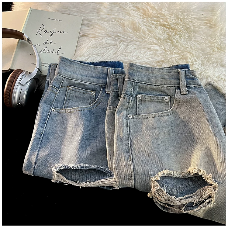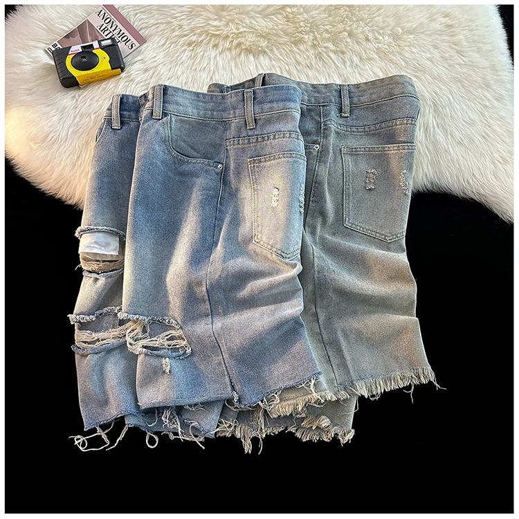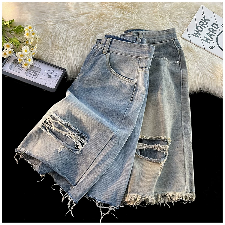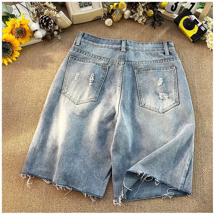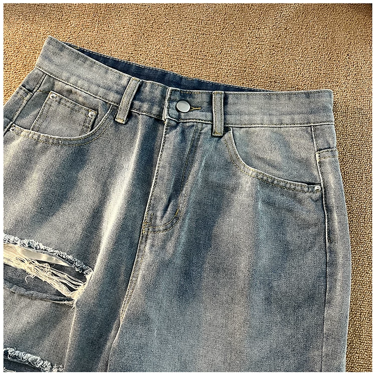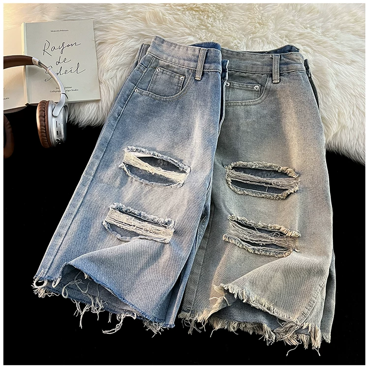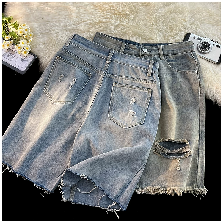 Quần short denim rách cho nam, phong cách Mỹ thời thượng, quần đã qua xử lý giặt mềm, dáng rộng mùa hè, quần short năm phần cá tính và sành điệu.