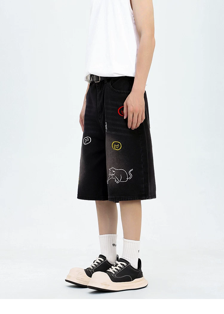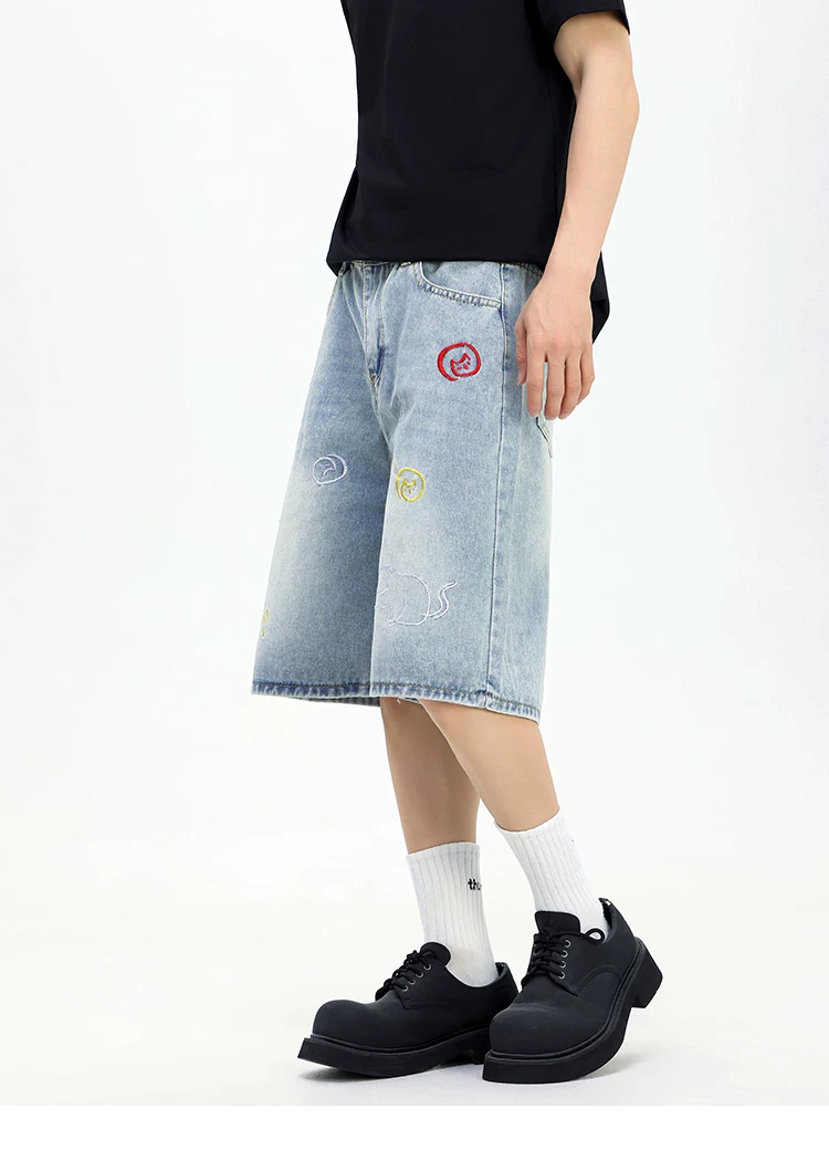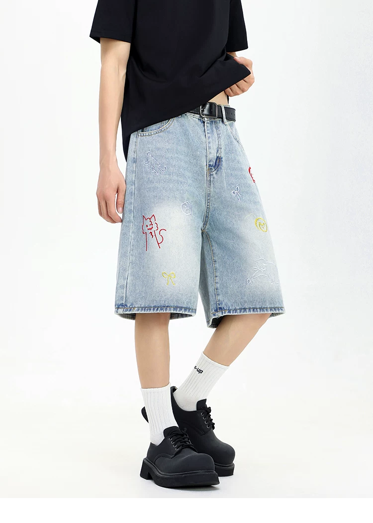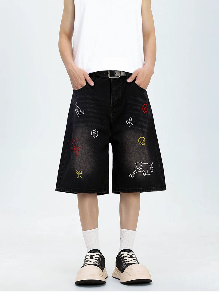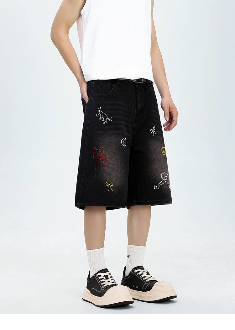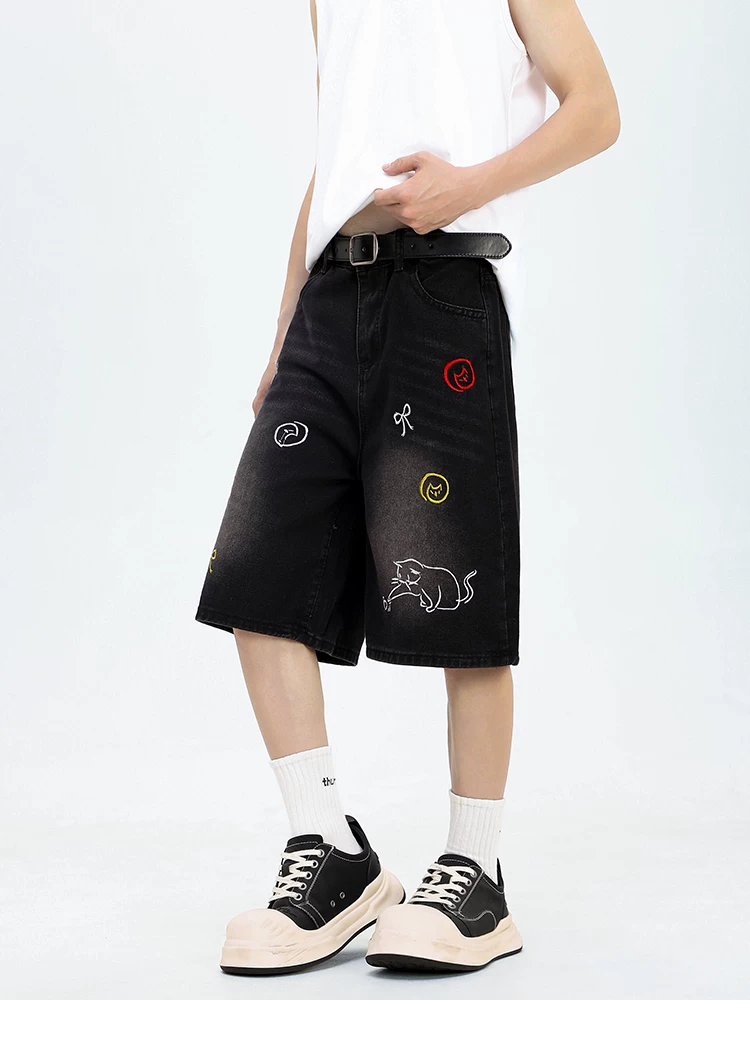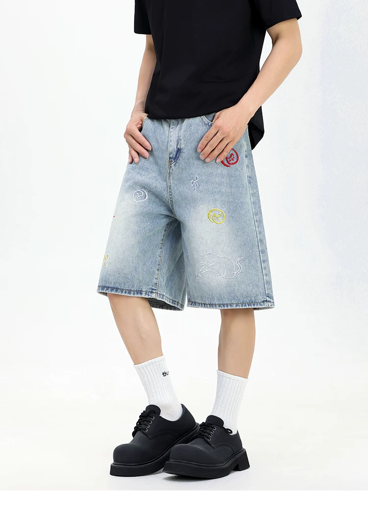 Quần short denim retro kiểu Mỹ dành cho nam, quần ống rộng dáng xuông thời thượng phong cách ins, quần cao cấp đơn giản mùa hè.