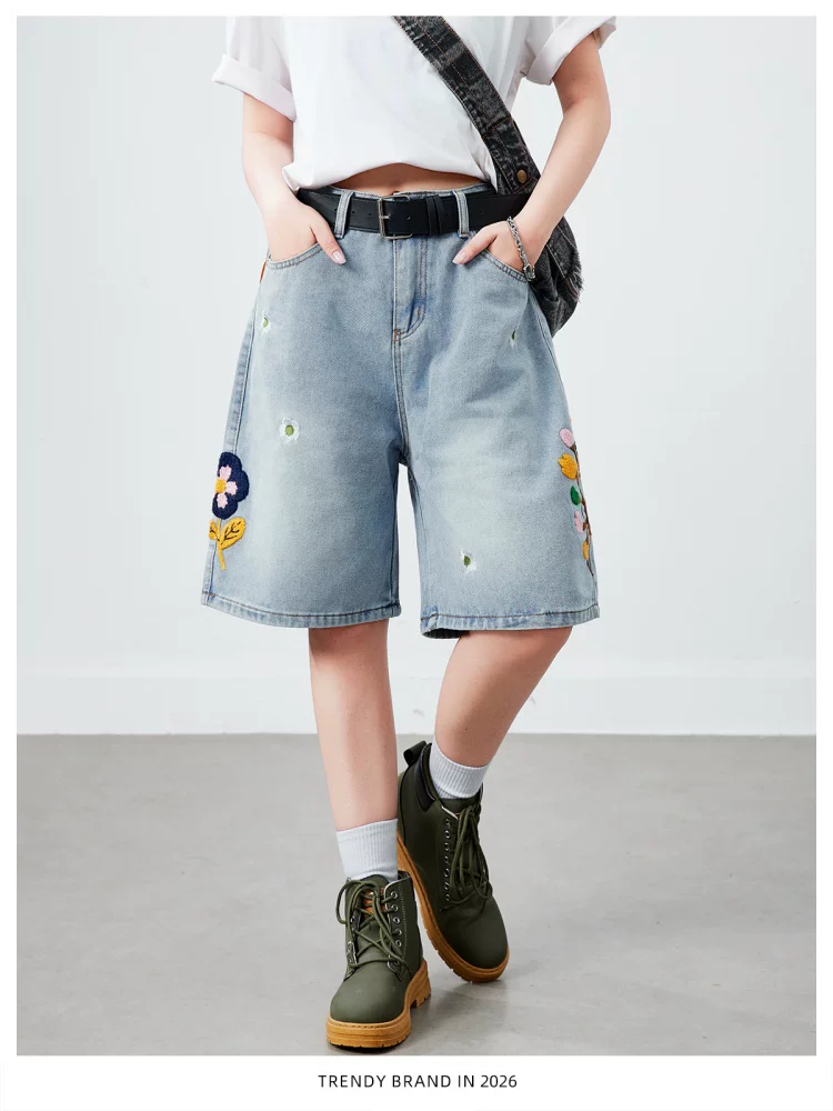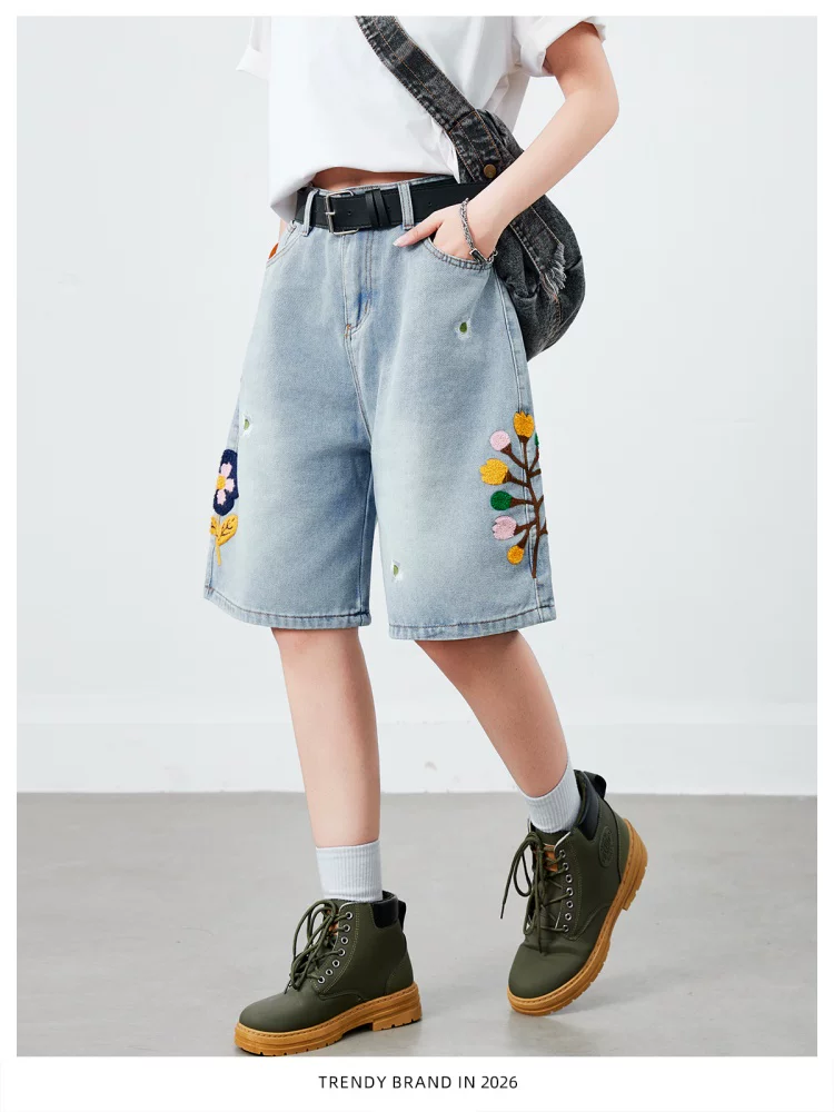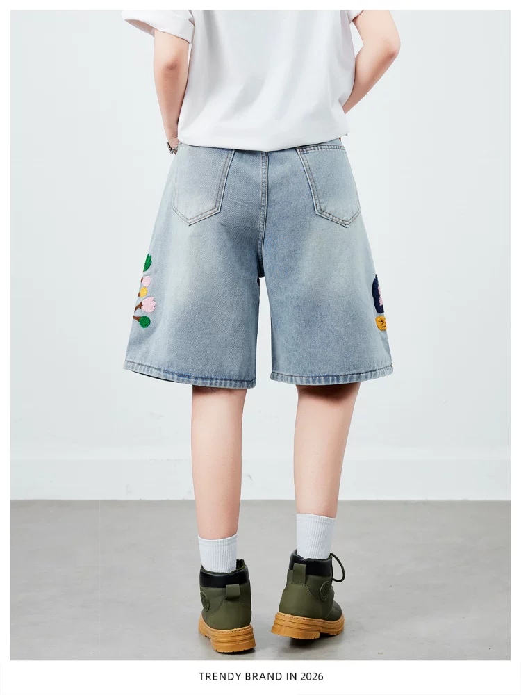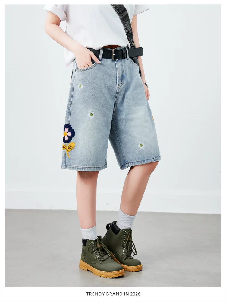 Quần short denim thêu hoa phong cách Mỹ dành cho nam, thương hiệu thời thượng, dáng rộng, phong cách cặp đôi giản dị mùa hè, quần short ống thẳng.
