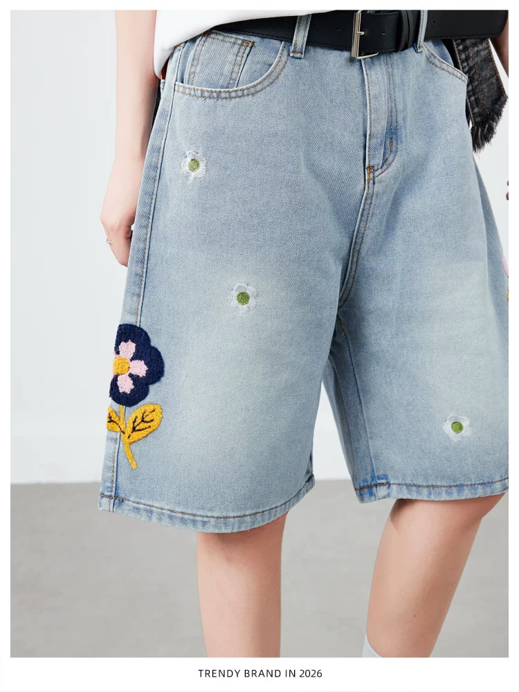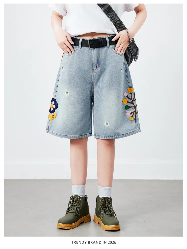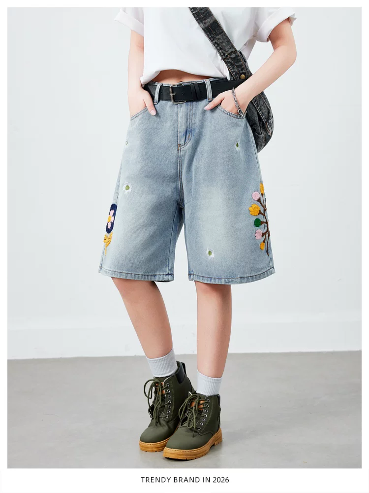- Quần short denim thêu hoa phong cách Mỹ dành cho nam, thương hiệu thời thượng, dáng rộng, phong cách cặp đôi giản dị mùa hè, quần short ống thẳng.