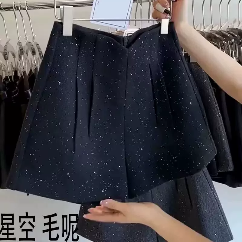 Quần short len bóng dáng rộng dành cho nữ, quần ống rộng cạp cao phong cách Chanel mùa thu đông, quần short đính sequin dáng chữ A dày dặn.