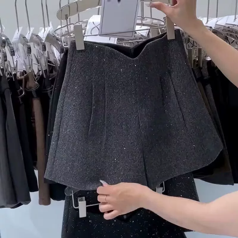- Quần short len bóng dáng rộng dành cho nữ, quần ống rộng cạp cao phong cách Chanel mùa thu đông, quần short đính sequin dáng chữ A dày dặn.