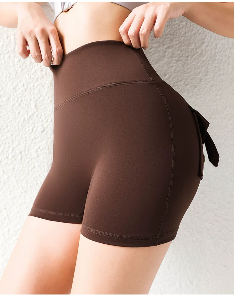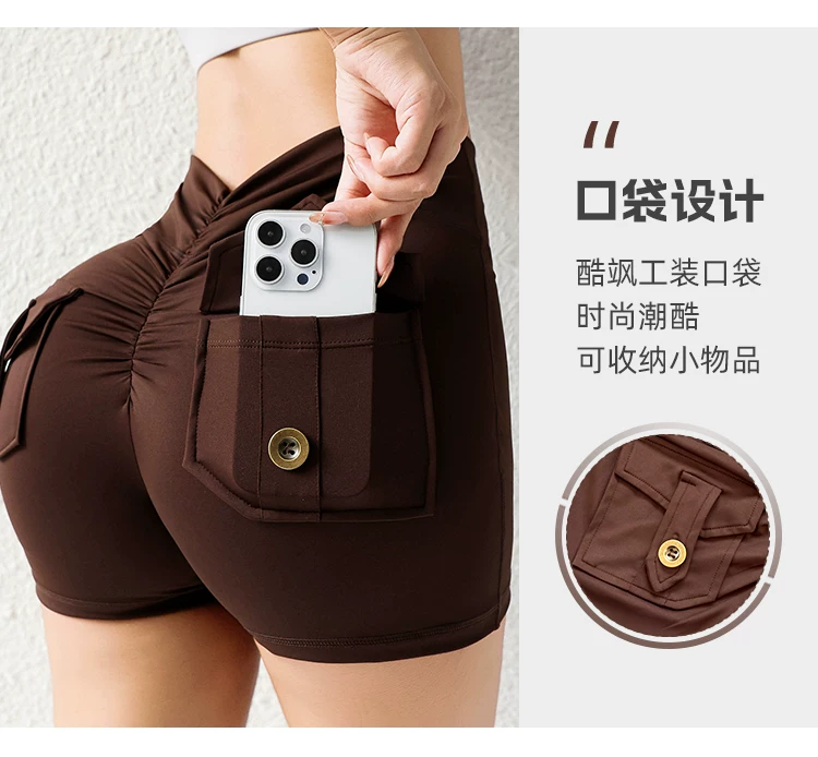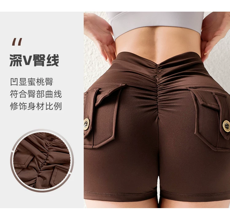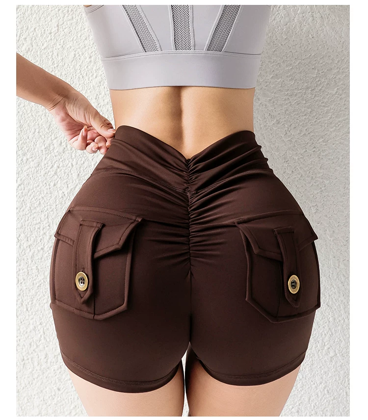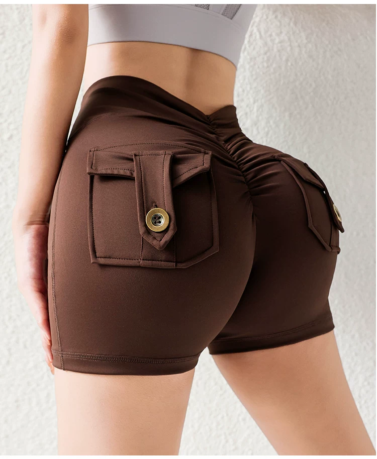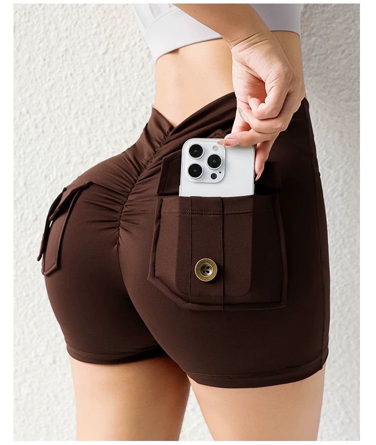 Quần short mông đào thời thượng với chất liệu vải mềm mại như không, có túi cargo, cạp cao, nâng mông, co giãn, mềm mại và thoải mái.