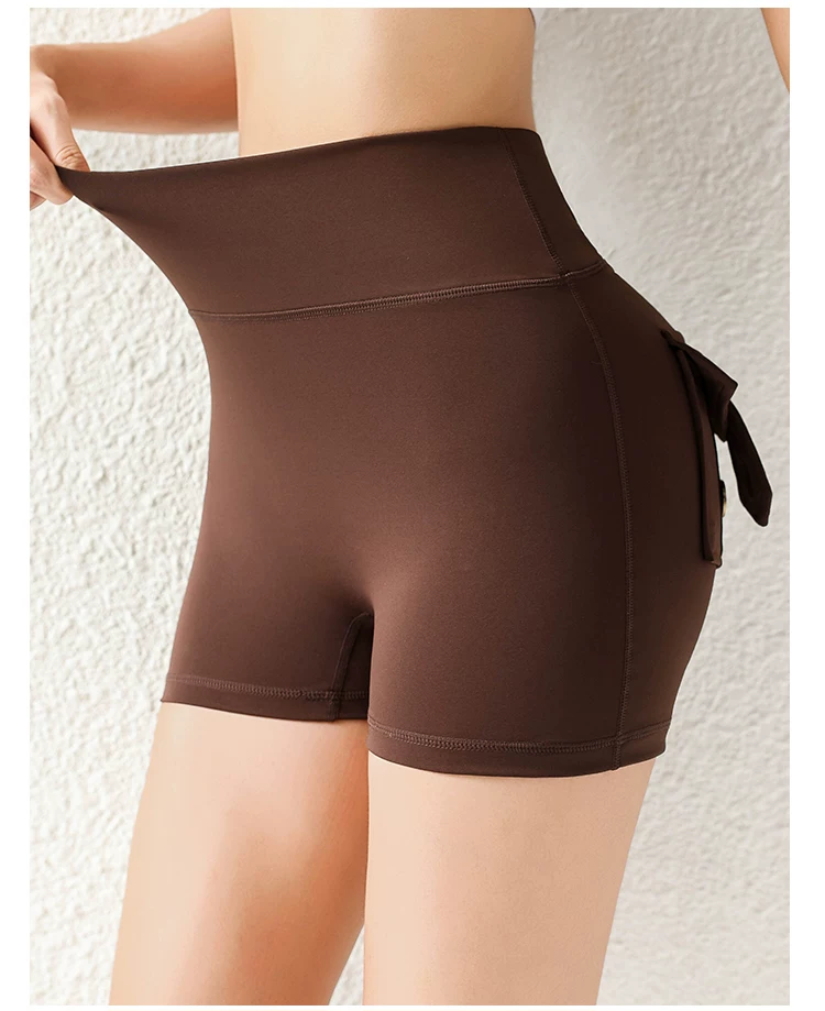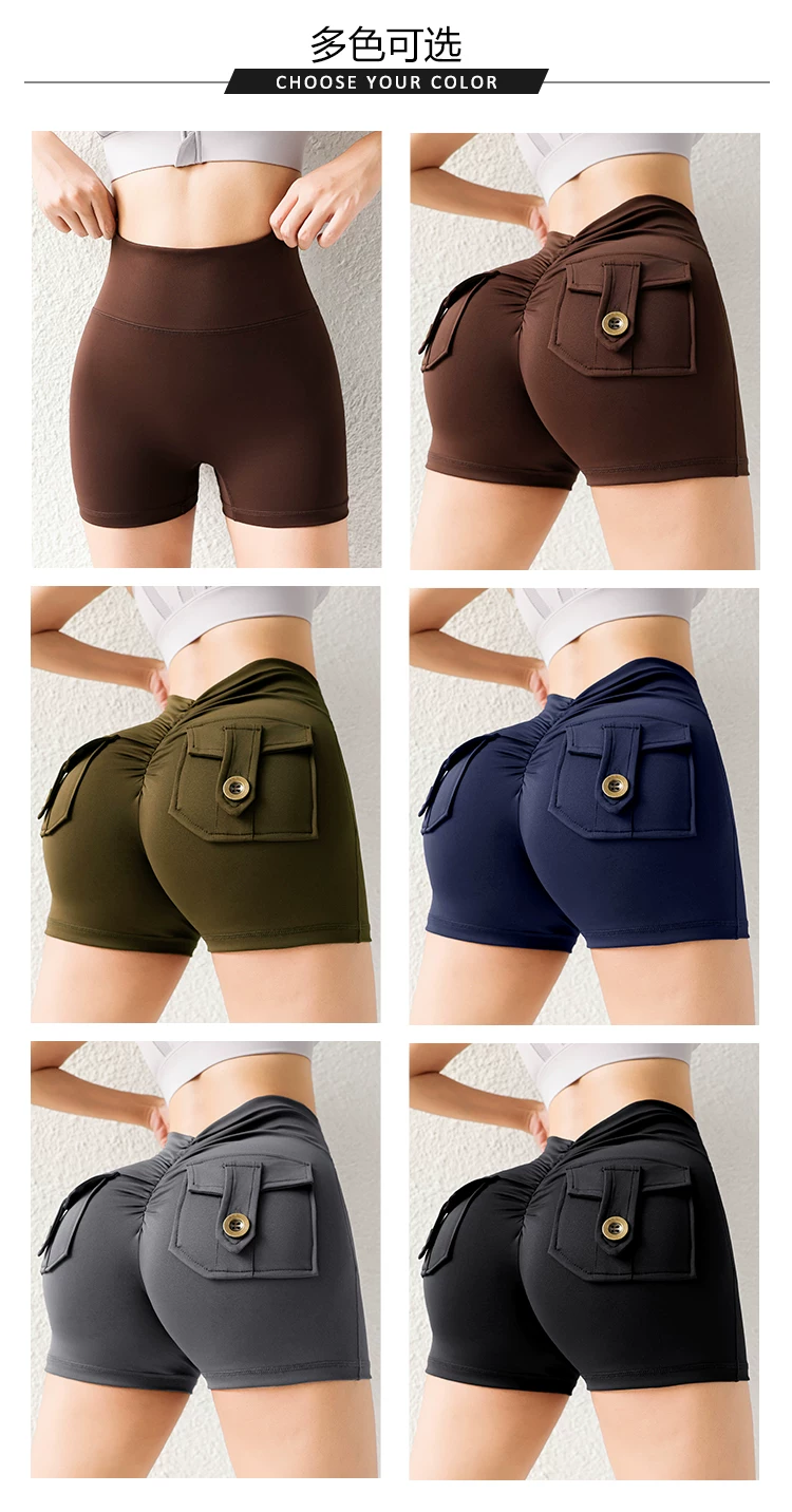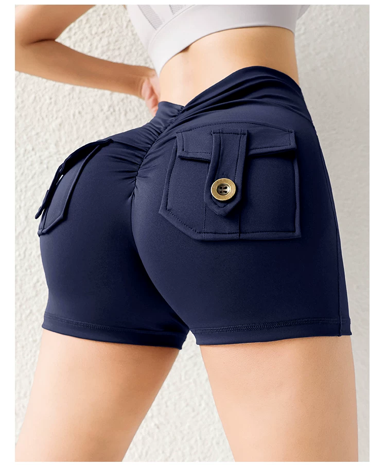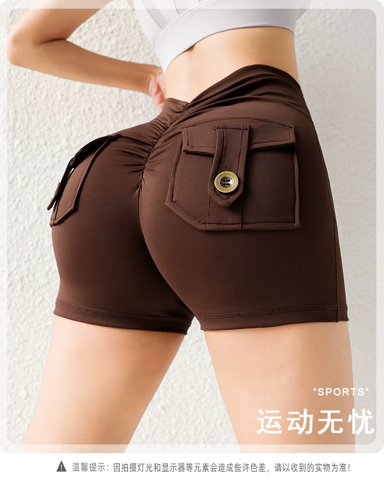 Quần short mông đào thời thượng với chất liệu vải mềm mại như không, có túi cargo, cạp cao, nâng mông, co giãn, mềm mại và thoải mái.