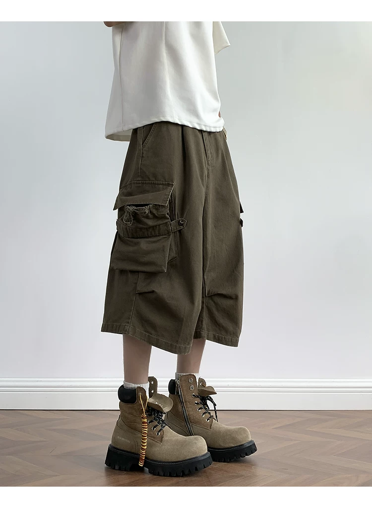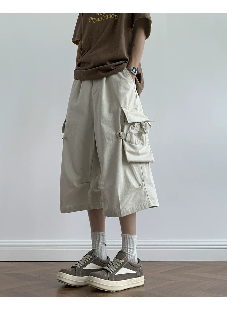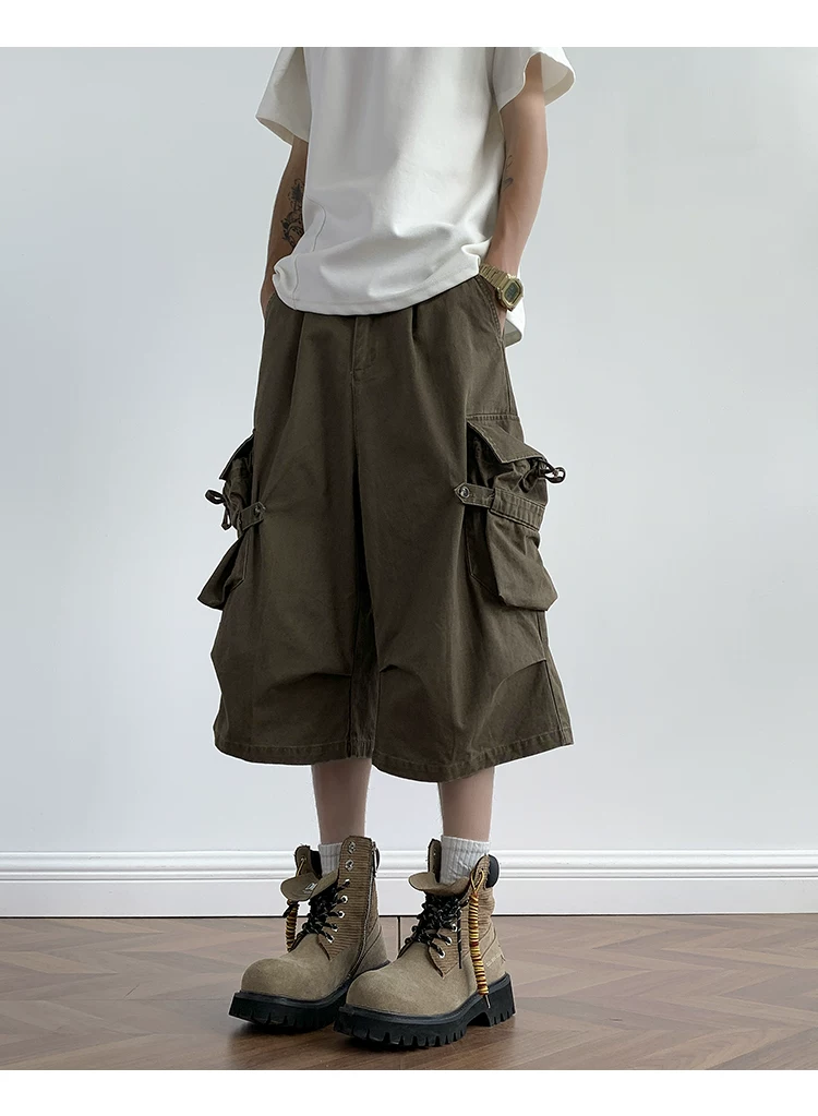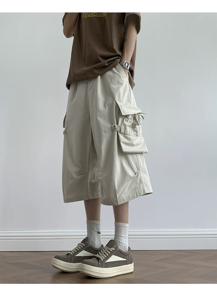 - Quần short nam mùa hè thời trang, dáng rộng, ống thẳng, kiểu cargo, có túi lớn, phong cách retro Mỹ.