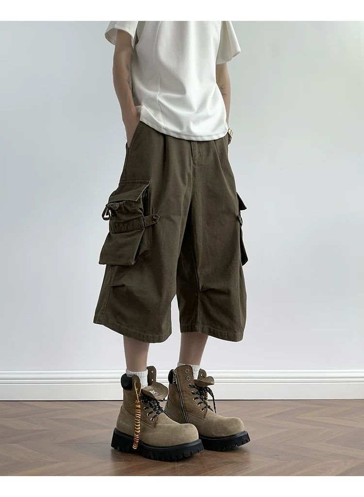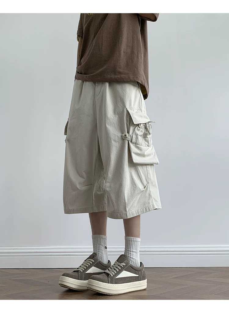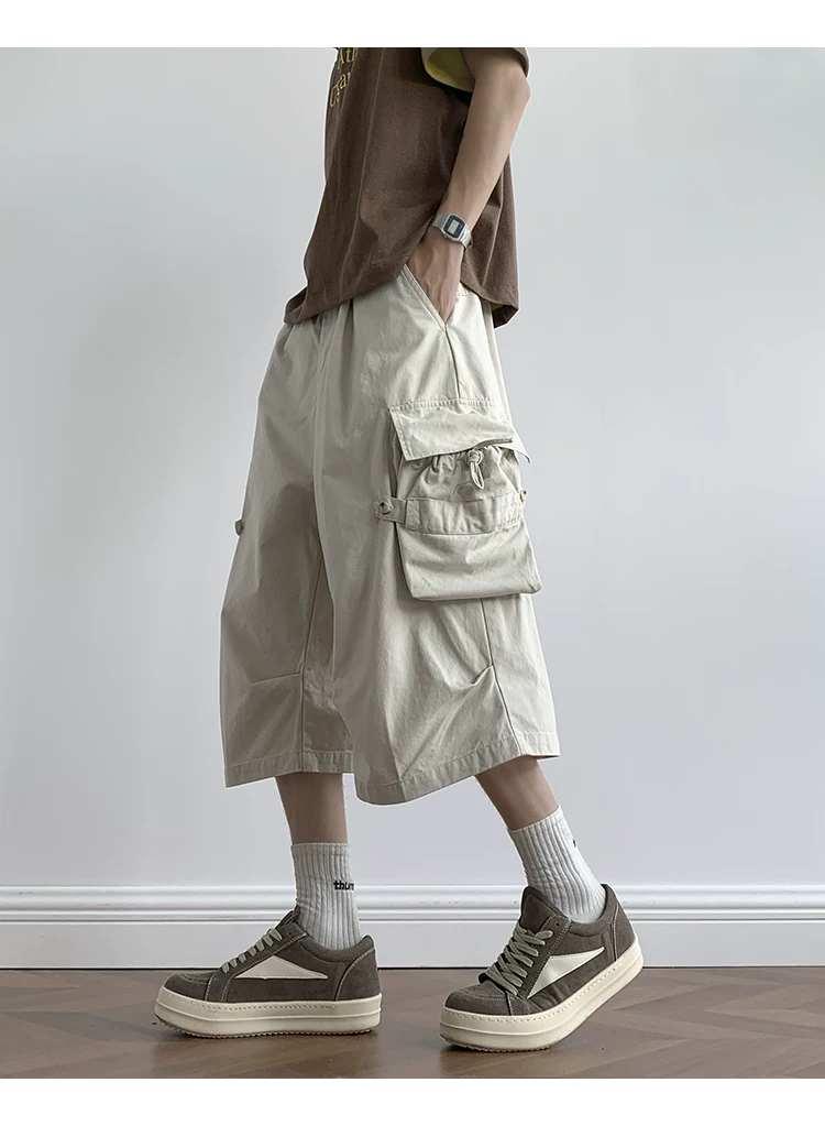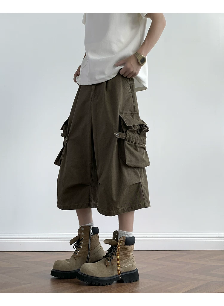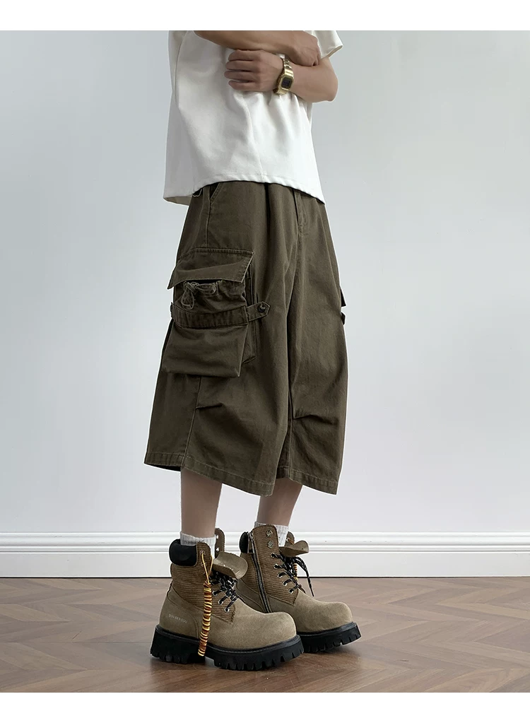 - Quần short nam mùa hè thời trang, dáng rộng, ống thẳng, kiểu cargo, có túi lớn, phong cách retro Mỹ.