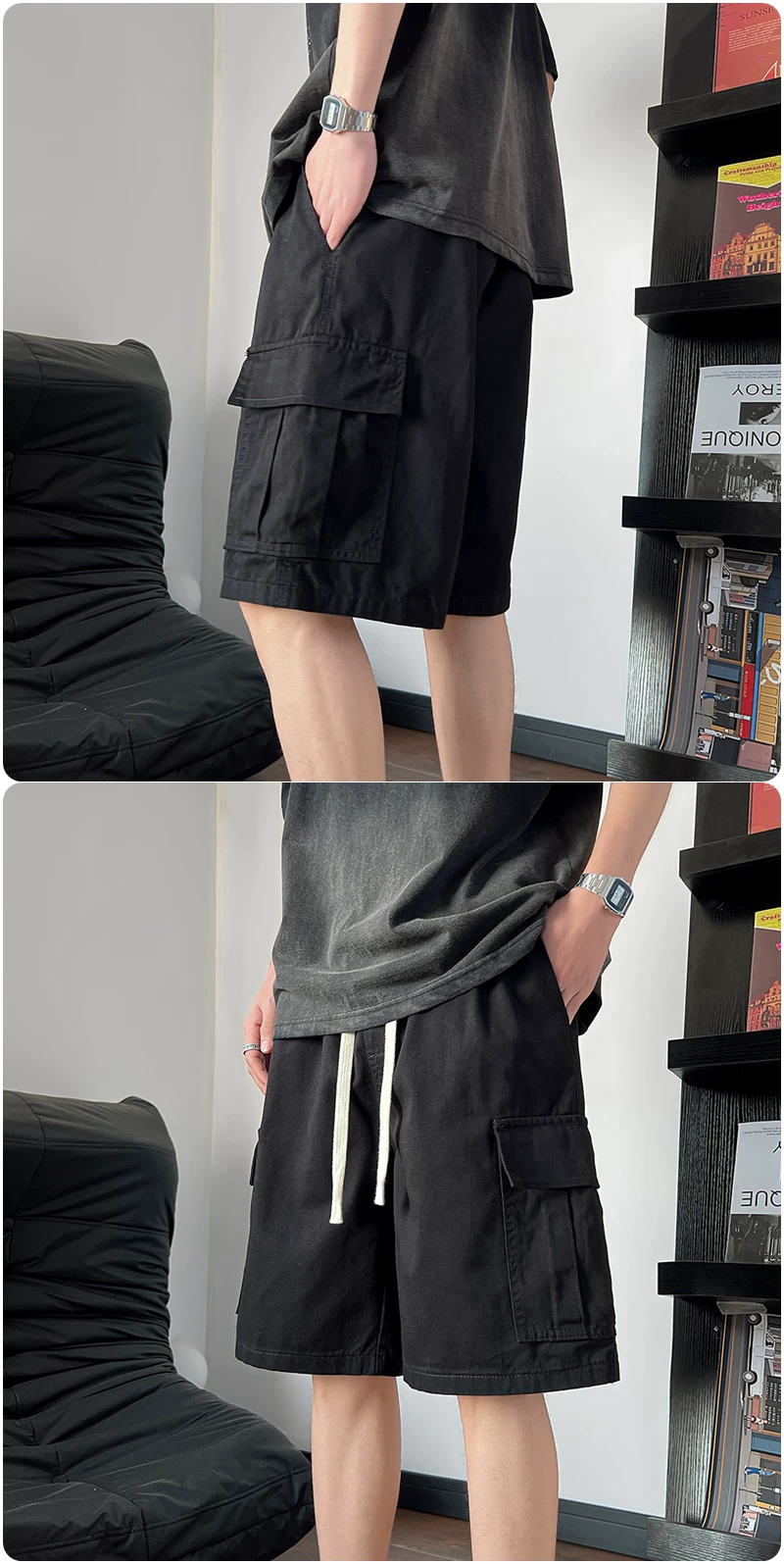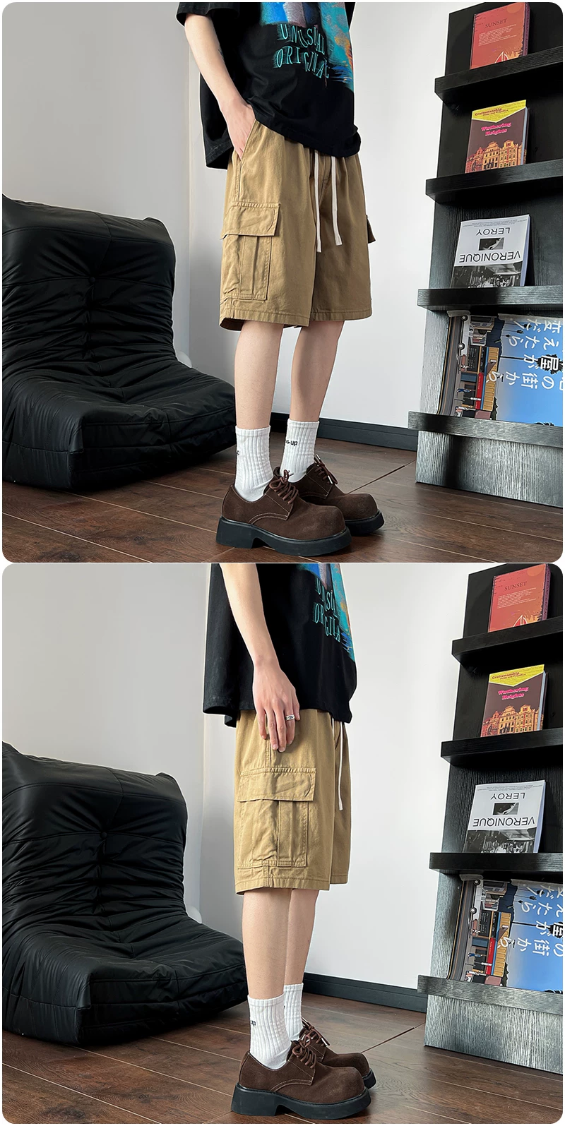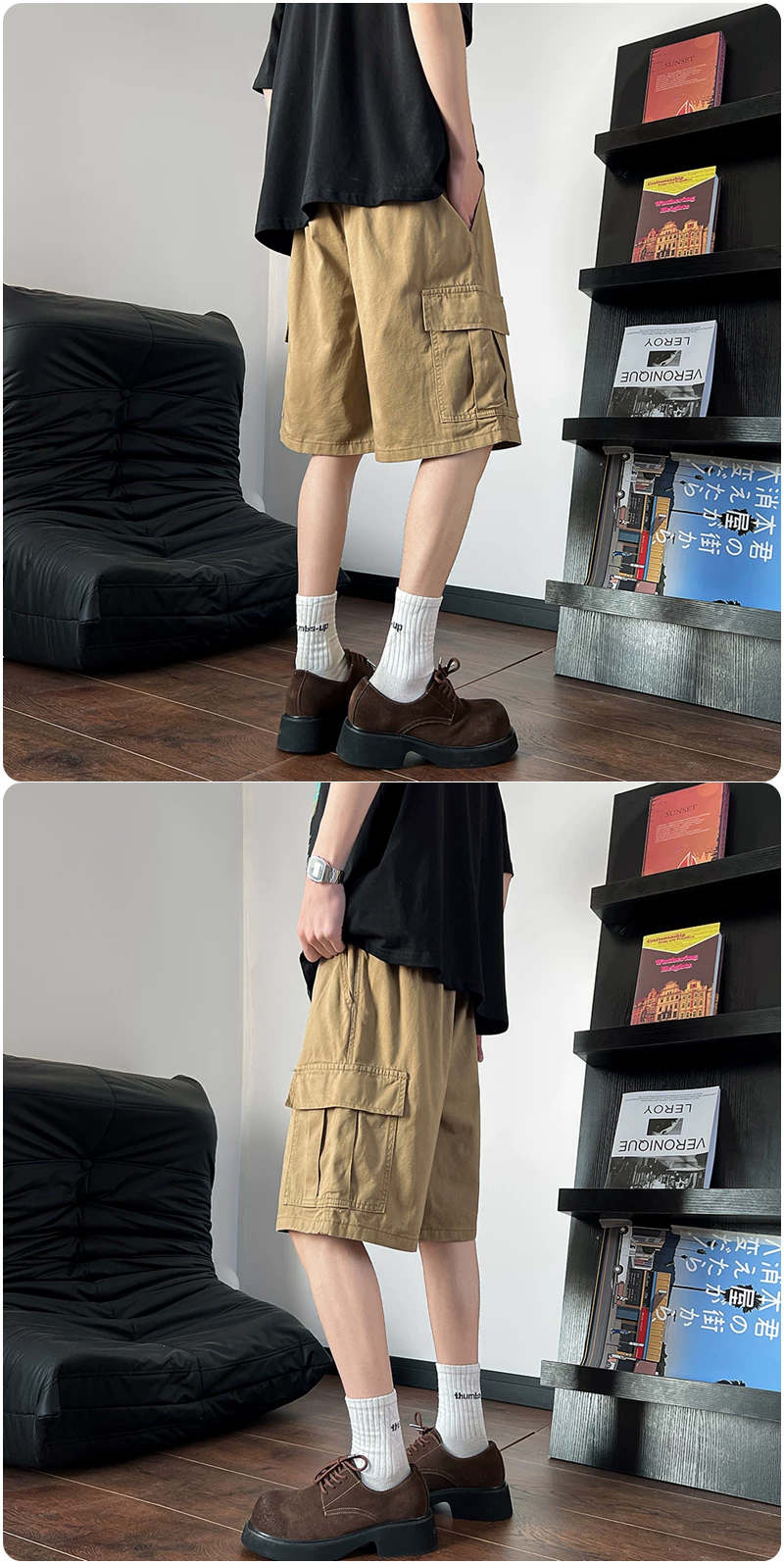 Quần short nam nhiều túi đã qua giặt, quần lửng đa năng mùa hè, quần short ống rộng dáng lửng phong cách Nhật Bản thời thượng.