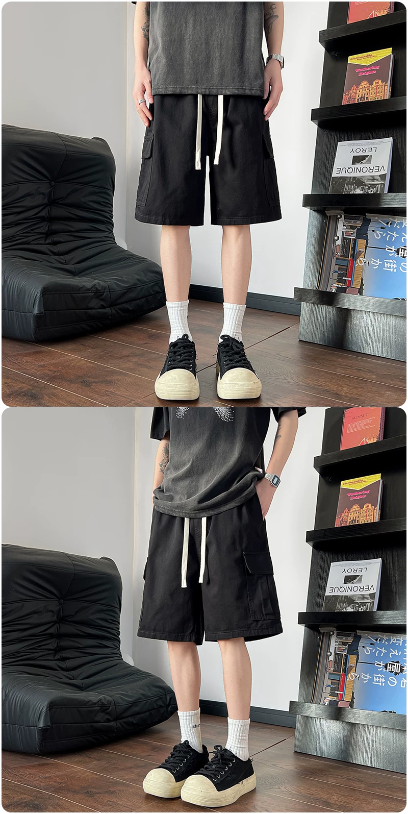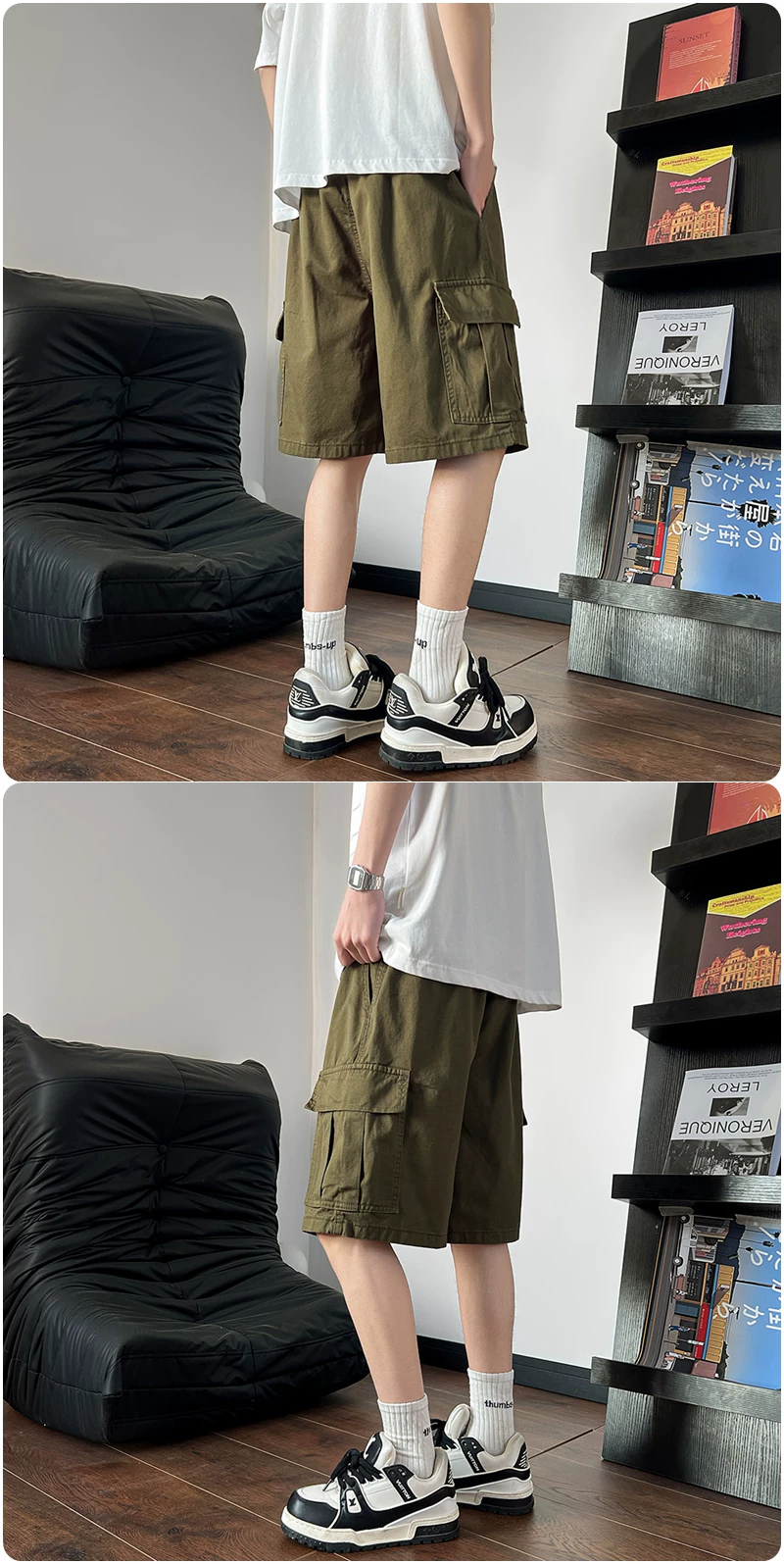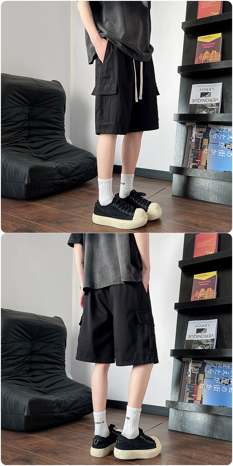 Quần short nam nhiều túi đã qua giặt, quần lửng đa năng mùa hè, quần short ống rộng dáng lửng phong cách Nhật Bản thời thượng.