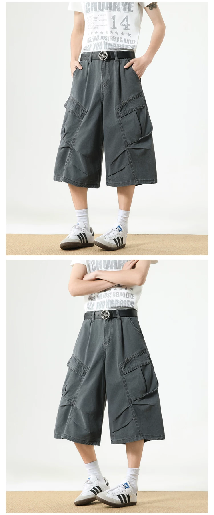 Quần short nam nhiều túi, thương hiệu thời thượng, dáng rộng, thiết kế xếp ly, quần ống đứng, quần short ống rộng mùa hè.