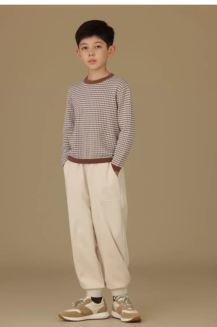 Quần thể thao bé trai bé gái chất liệu dày màu be đậm, túi lớn, dáng rộng, mặc được cả bố mẹ và con, đa năng, phong cách thể thao, dài.