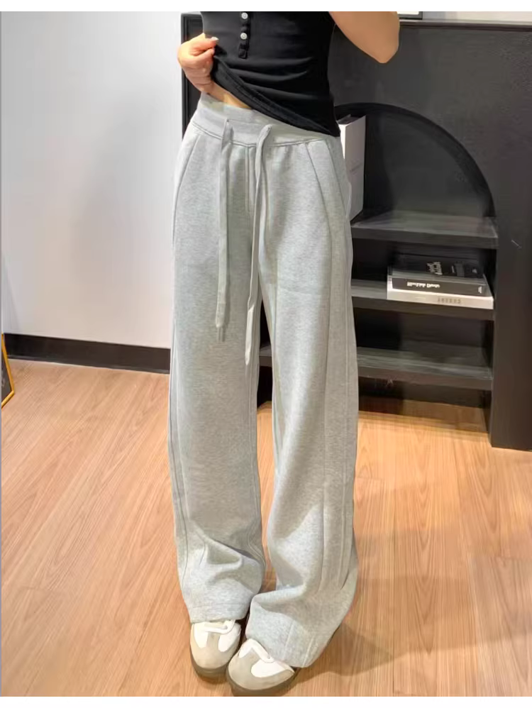 Quần thể thao ôm dáng màu xám lulu dành cho nữ, mùa thu đông, cỡ lớn, lót lông cừu, cạp cao, tôn dáng, quần ống rộng dáng thẳng, phong cách thường ngày