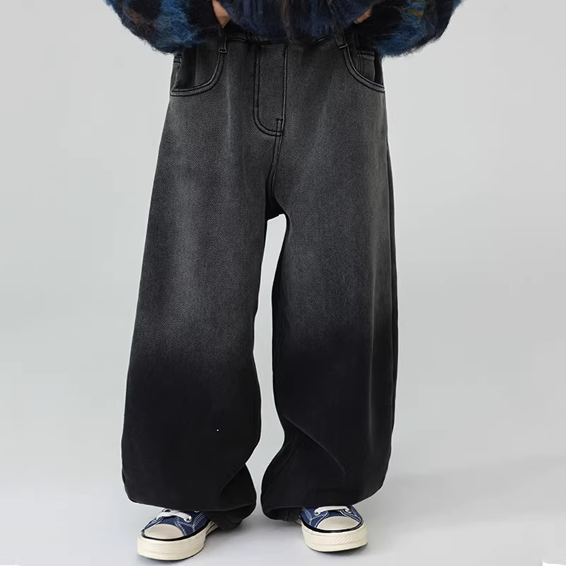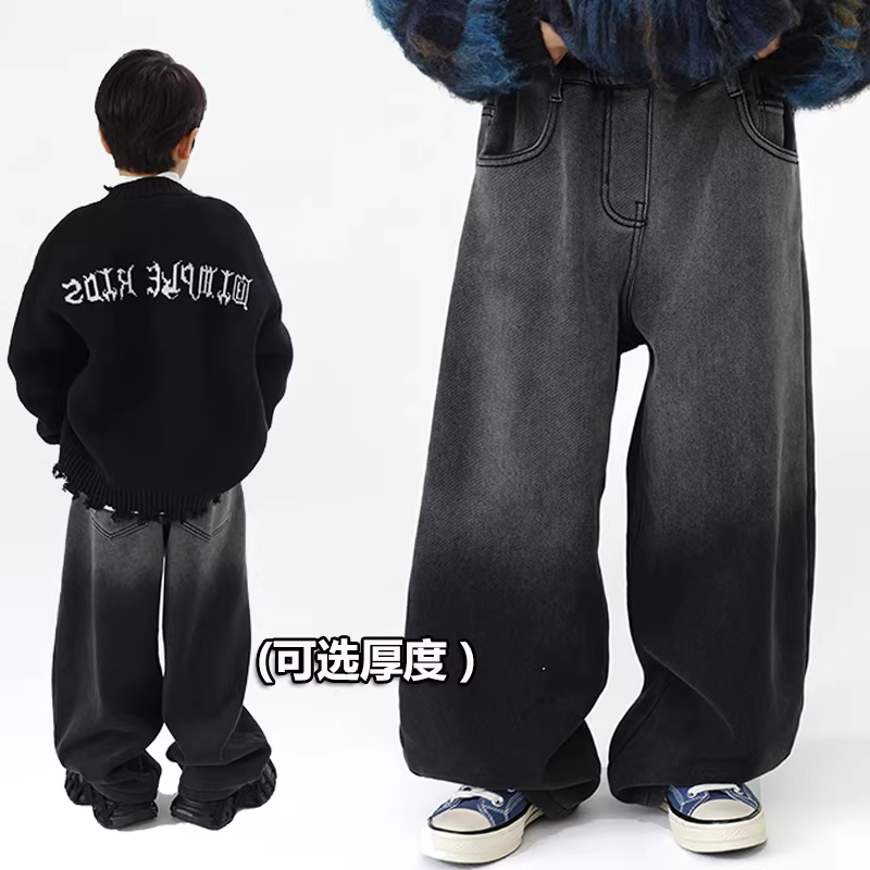 Quần thường ngày đa năng cho trẻ em, quần jean đen và xám cho bé trai, quần thẳng lót lông cừu mùa xuân, mùa thu và mùa đông cho trẻ em cỡ vừa và lớn, trang phục dành cho cha mẹ và con cái