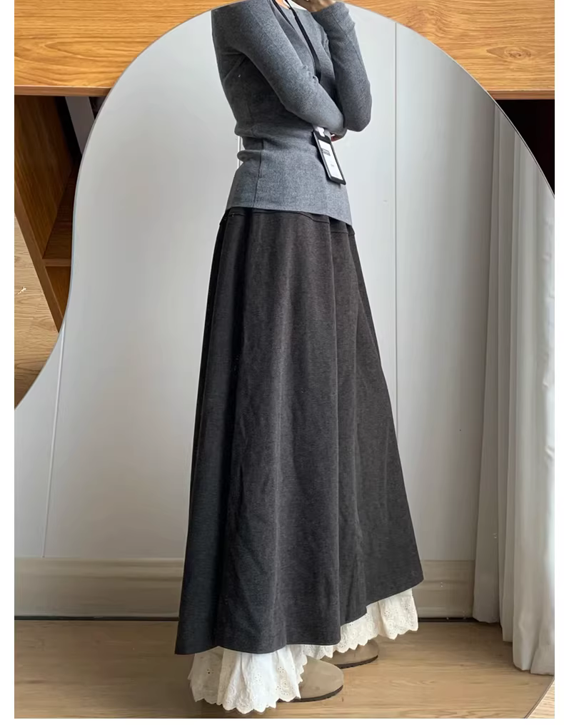 - Quần váy cây dương hợp thời trang năm nay dành cho nữ trong mùa thu, cỡ lớn, giả hai mảnh, phong cách lười biếng, phối ren, quần váy ống rộng bằng len.