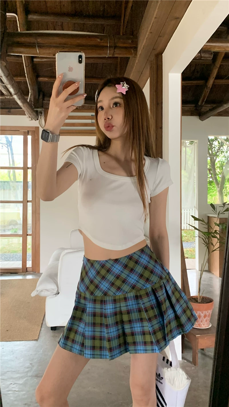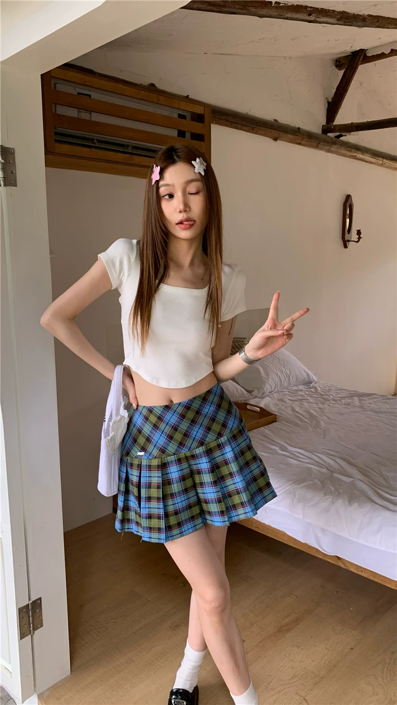 - Quần váy kẻ sọc cổ điển kiểu Mỹ cỡ lớn dành cho nữ, váy ngắn chữ A ôm hông lưng cao mùa hè có xẻ tà và xếp ly.