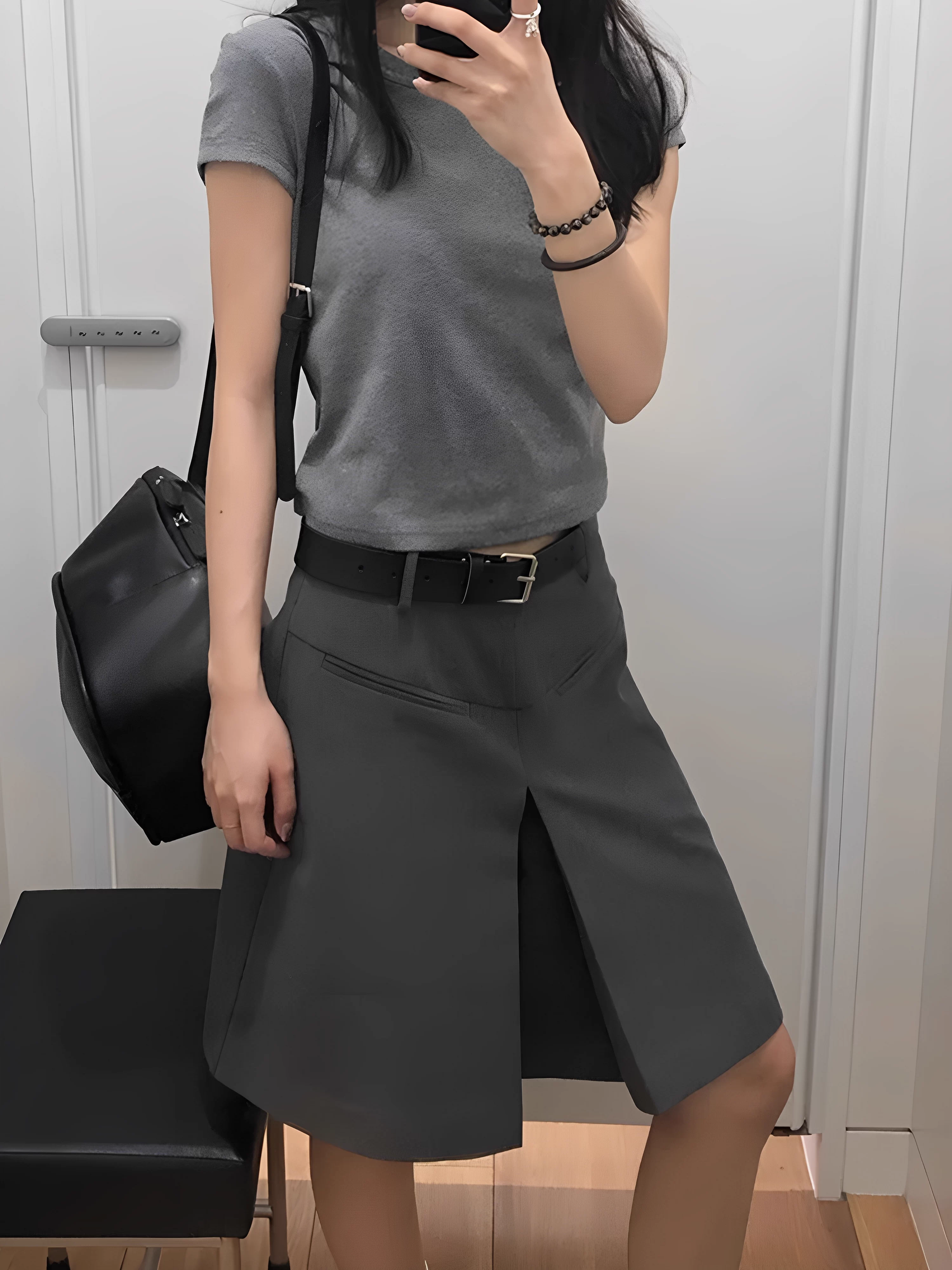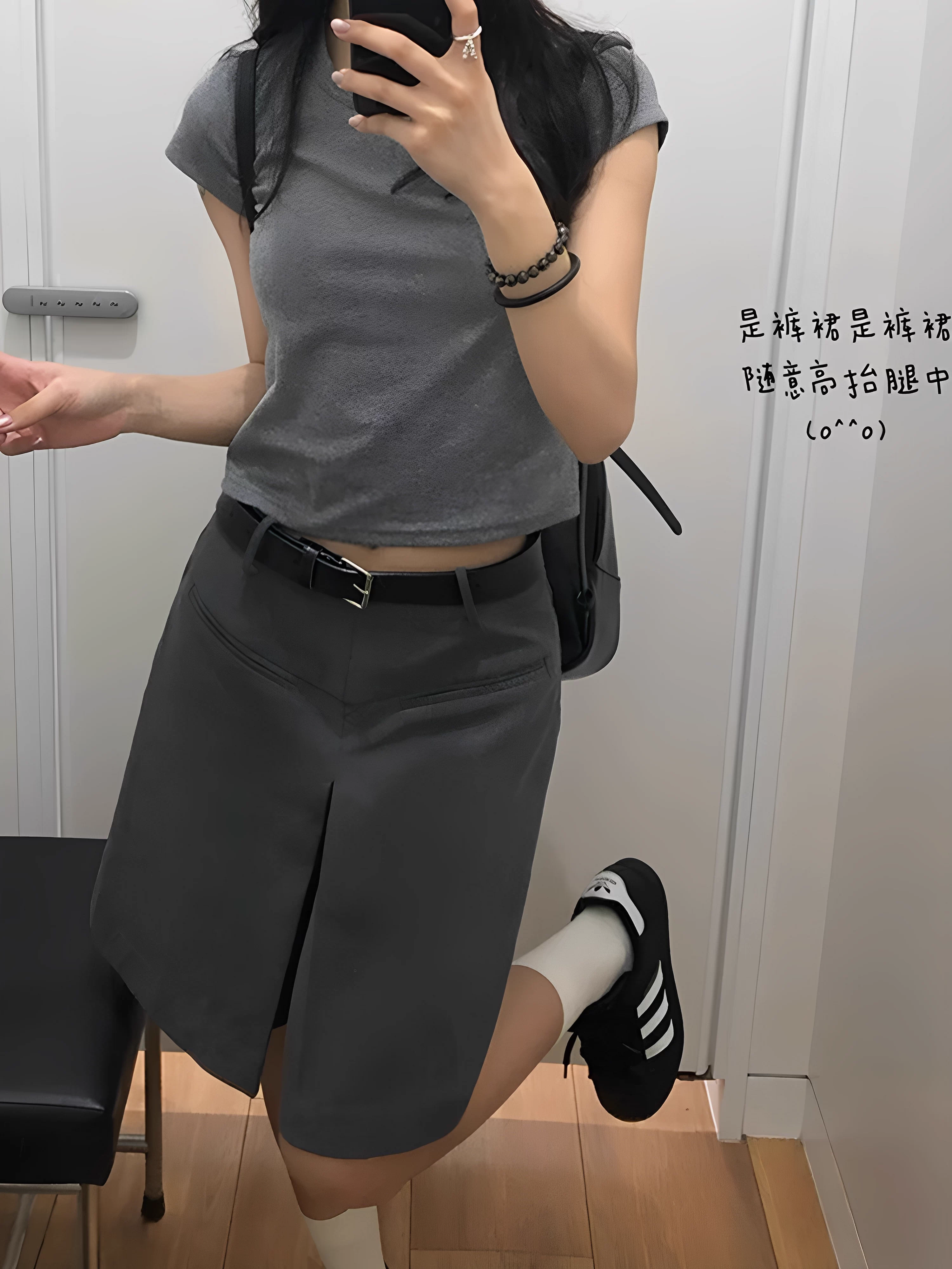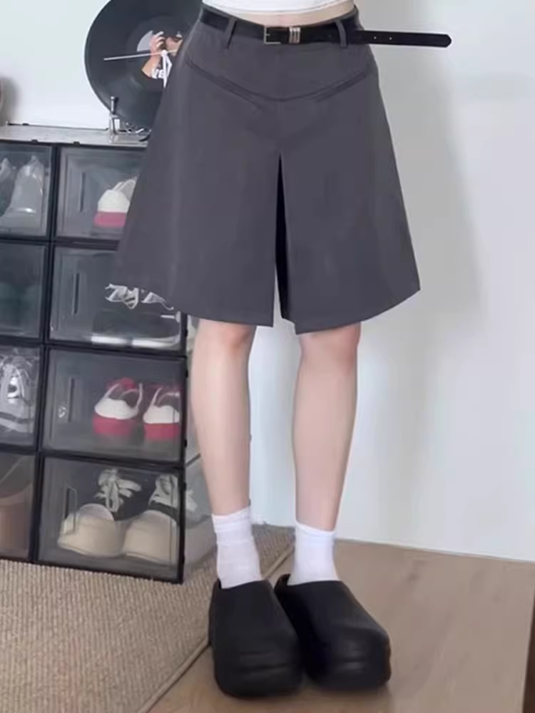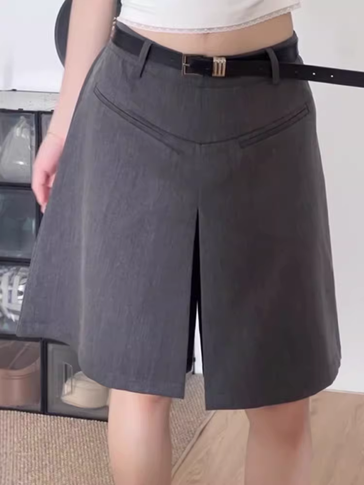Quần váy ngắn kiểu vest màu xám dành cho nữ, mùa hè, cỡ lớn, lưng cao, dáng rộng, thon gọn, nhỏ nhắn, xếp ly, giản dị, quần dài vừa phải.