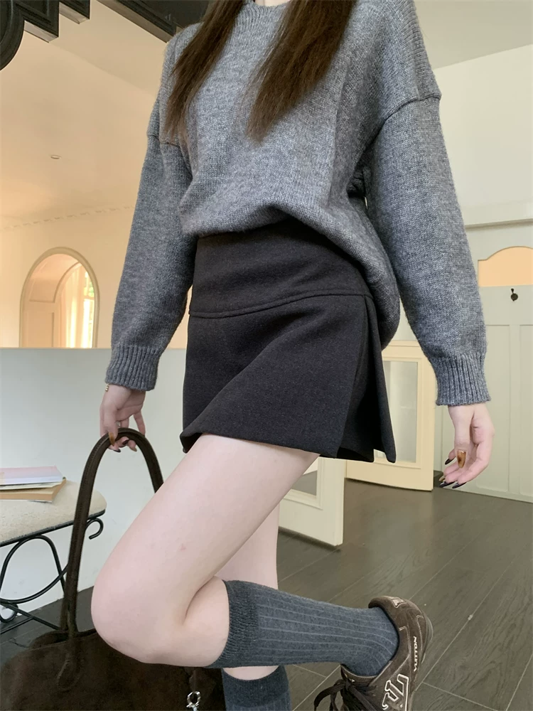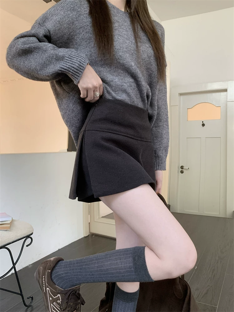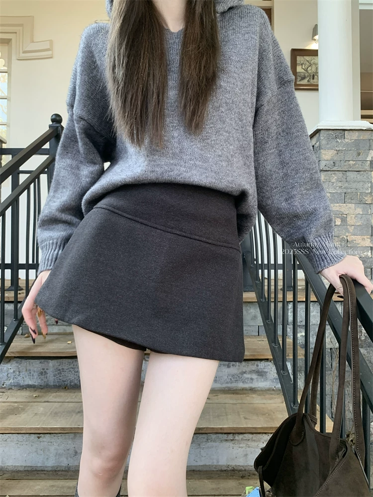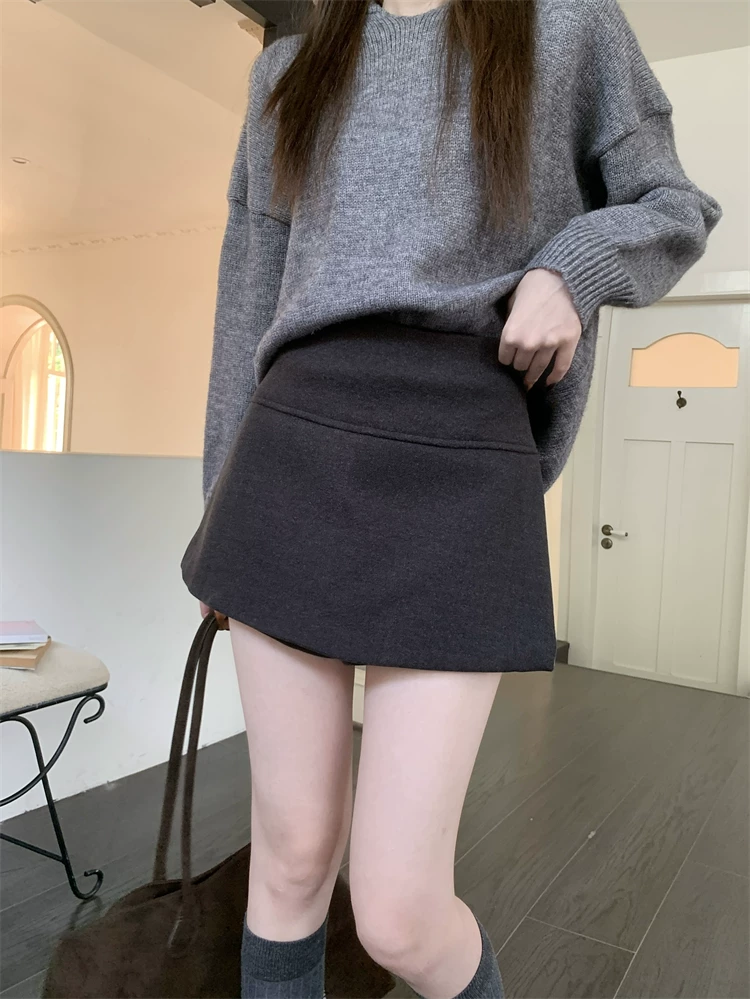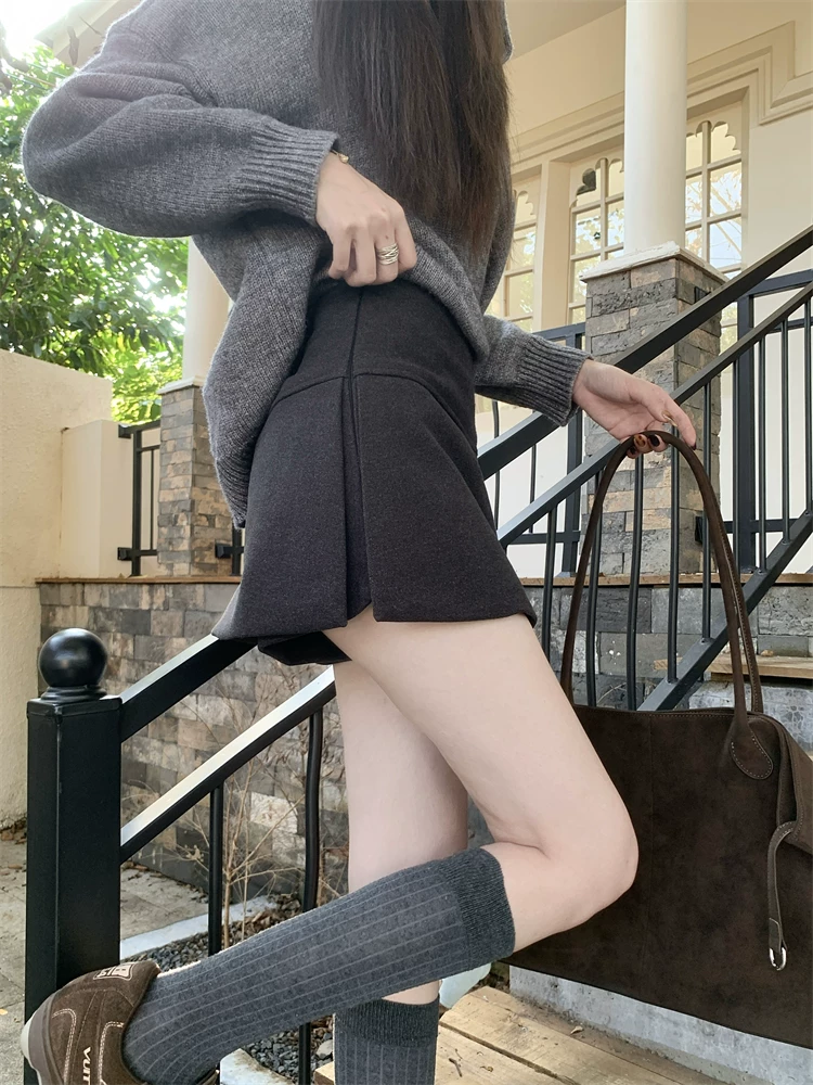 - Quần váy xẻ tà màu xám cỡ lớn dành cho nữ, mùa thu đông, quần short giảm béo lưng cao, váy ngắn chữ A, quần váy len.