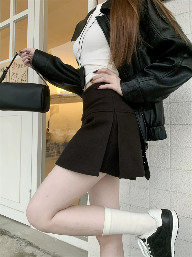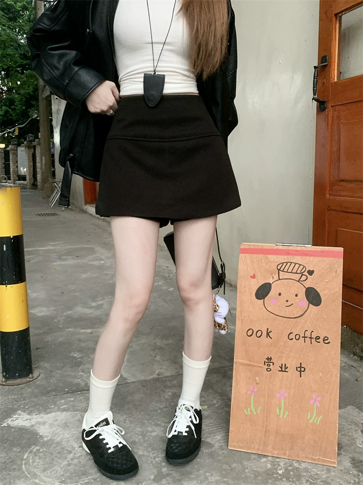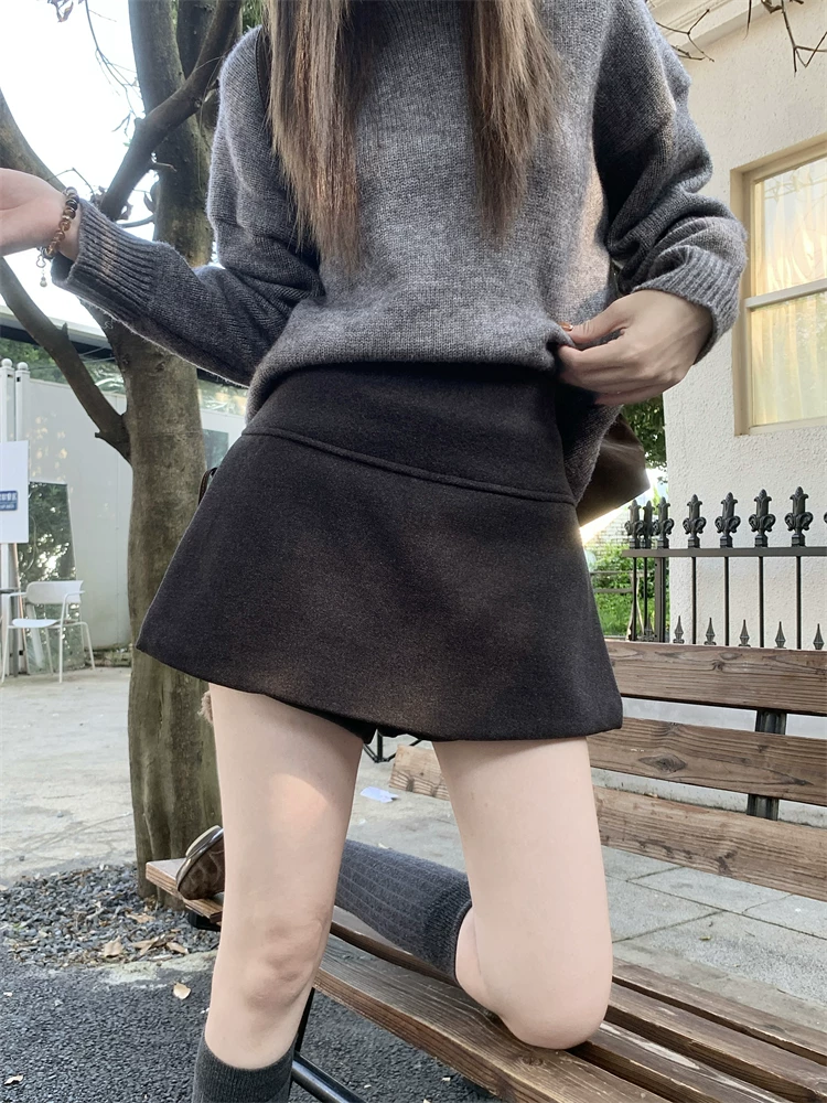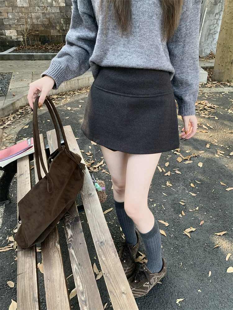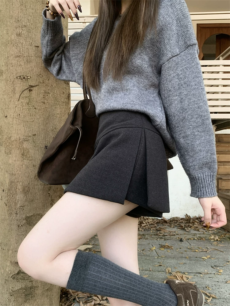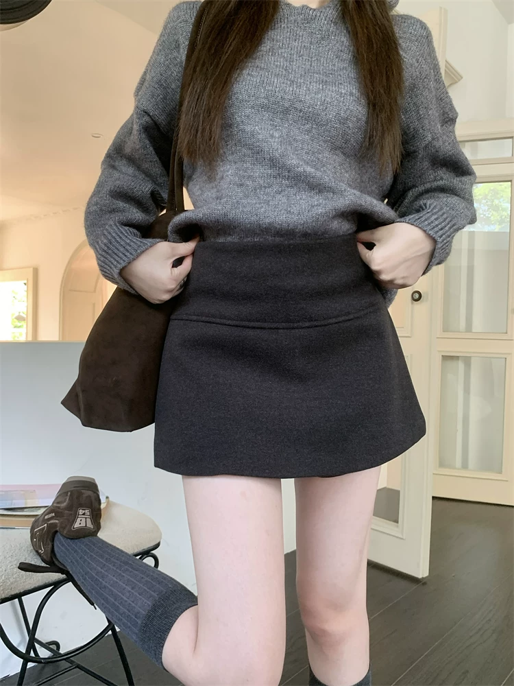 - Quần váy xẻ tà màu xám cỡ lớn dành cho nữ, mùa thu đông, quần short giảm béo lưng cao, váy ngắn chữ A, quần váy len.
