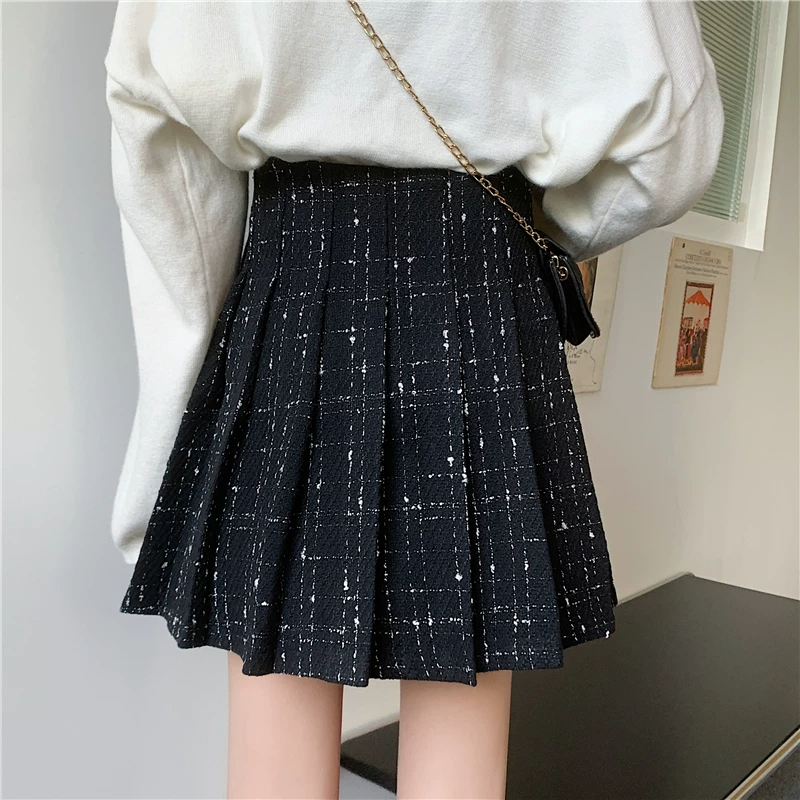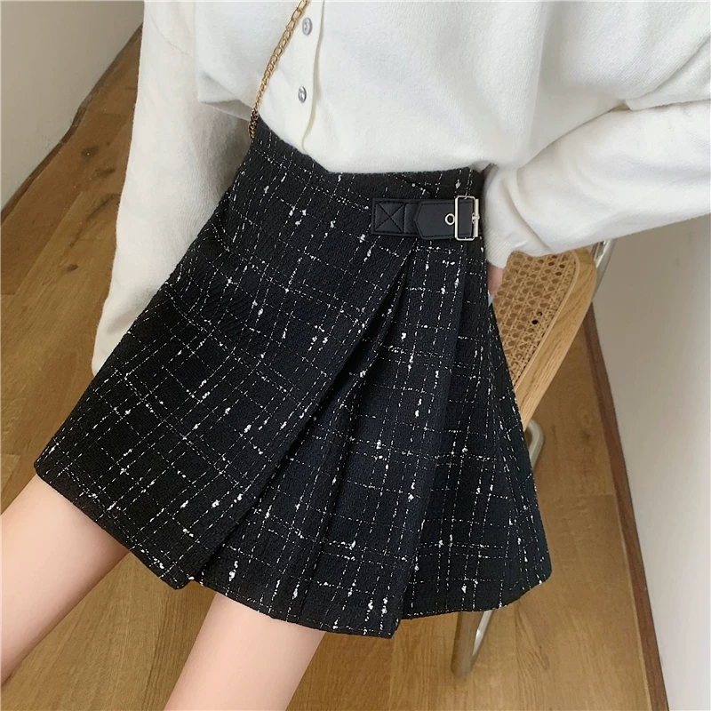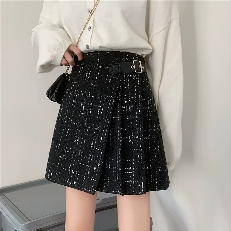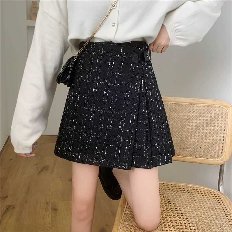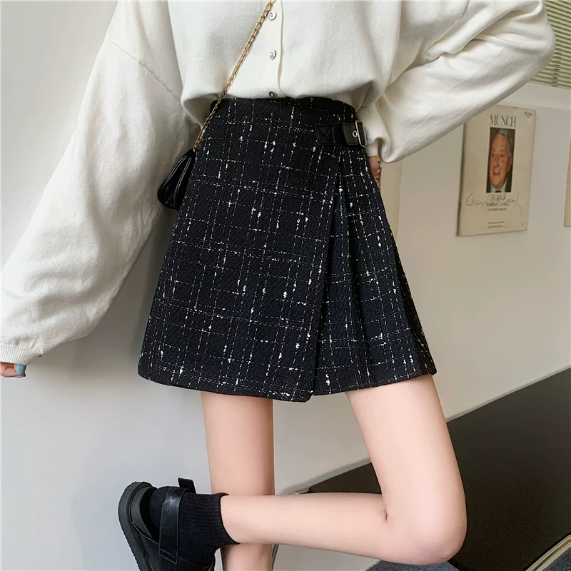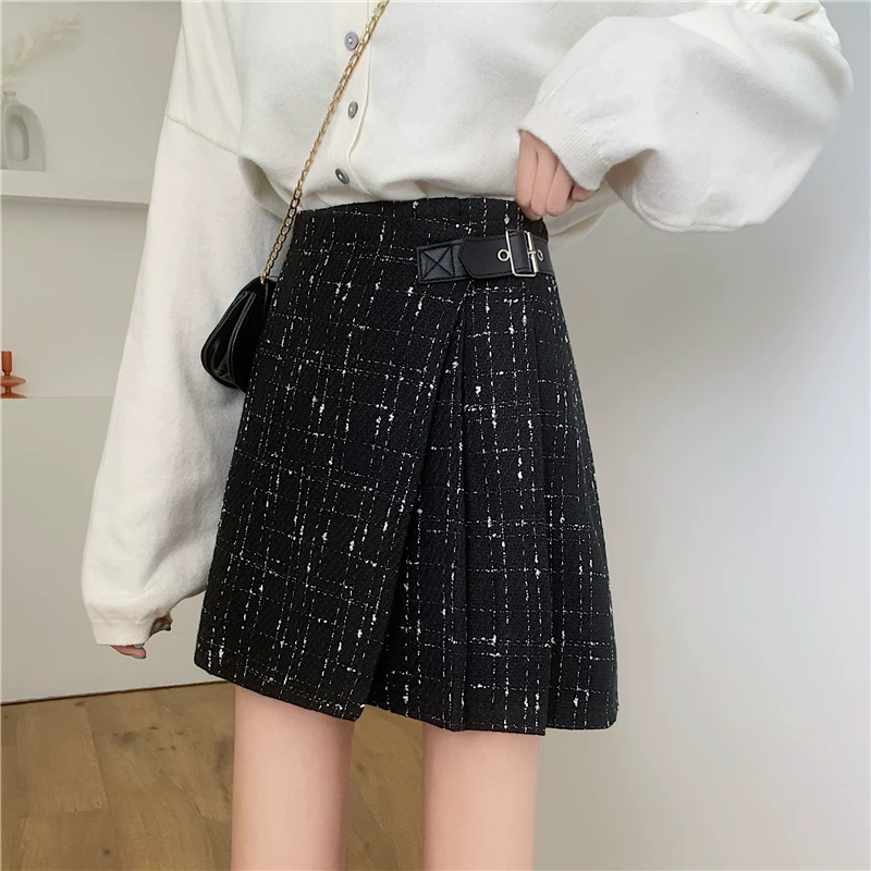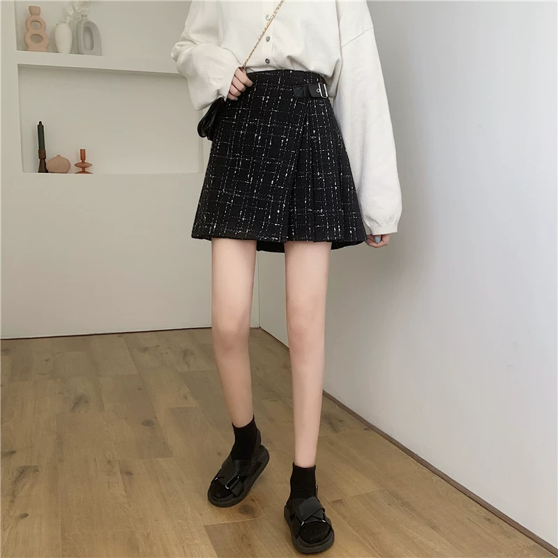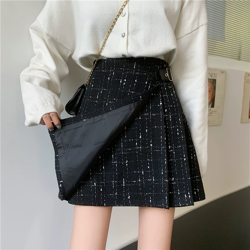 - Quần váy xếp ly không đều màu đen bằng len cỡ lớn dành cho nữ, váy chữ A ôm hông lưng cao, váy ngắn mùa thu đông.