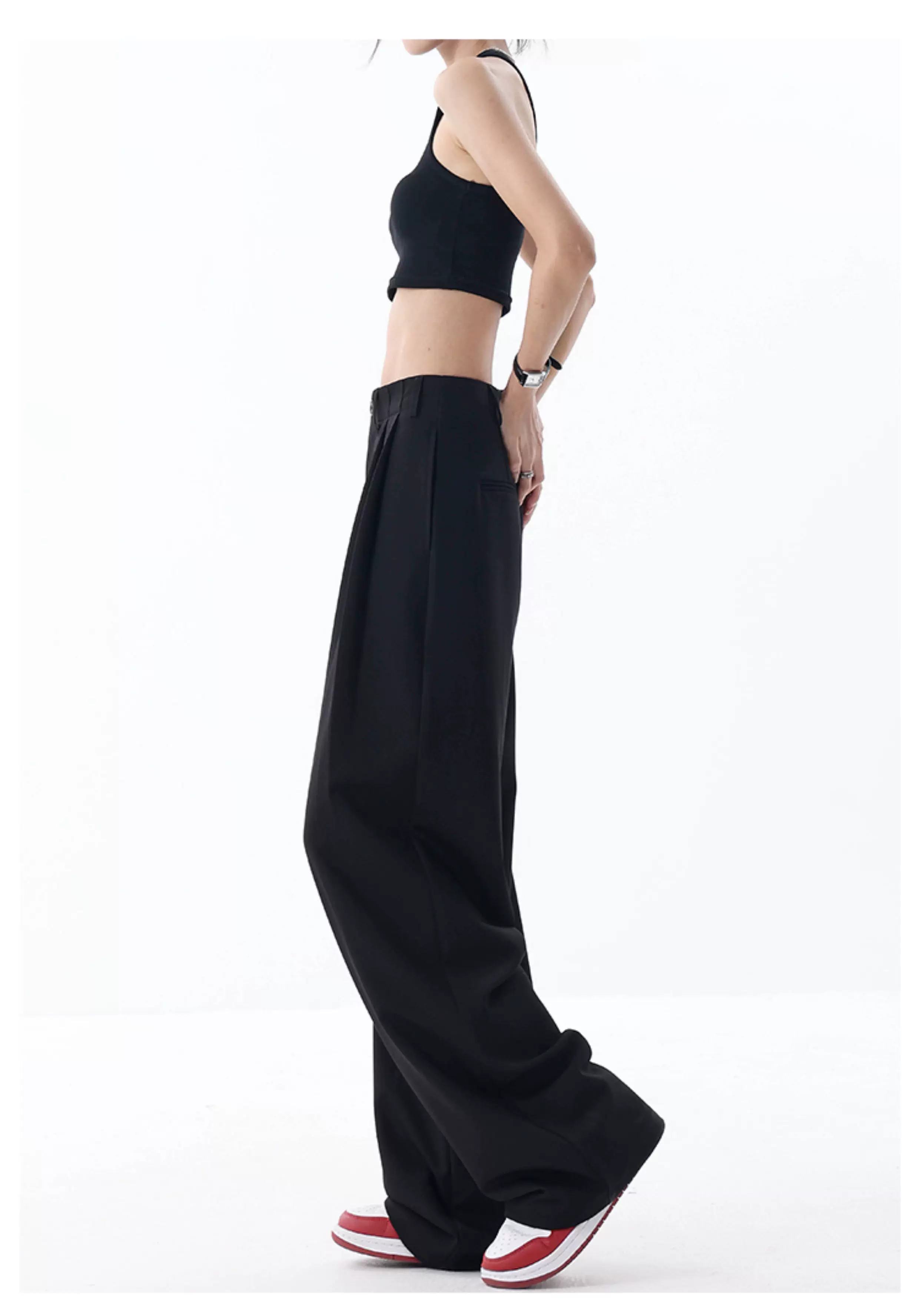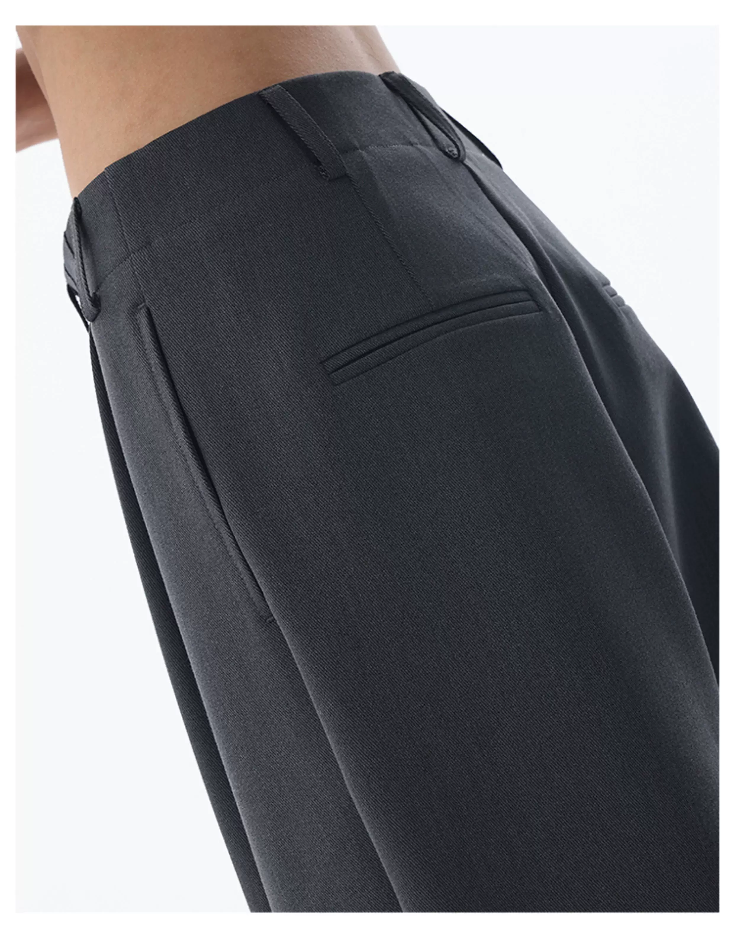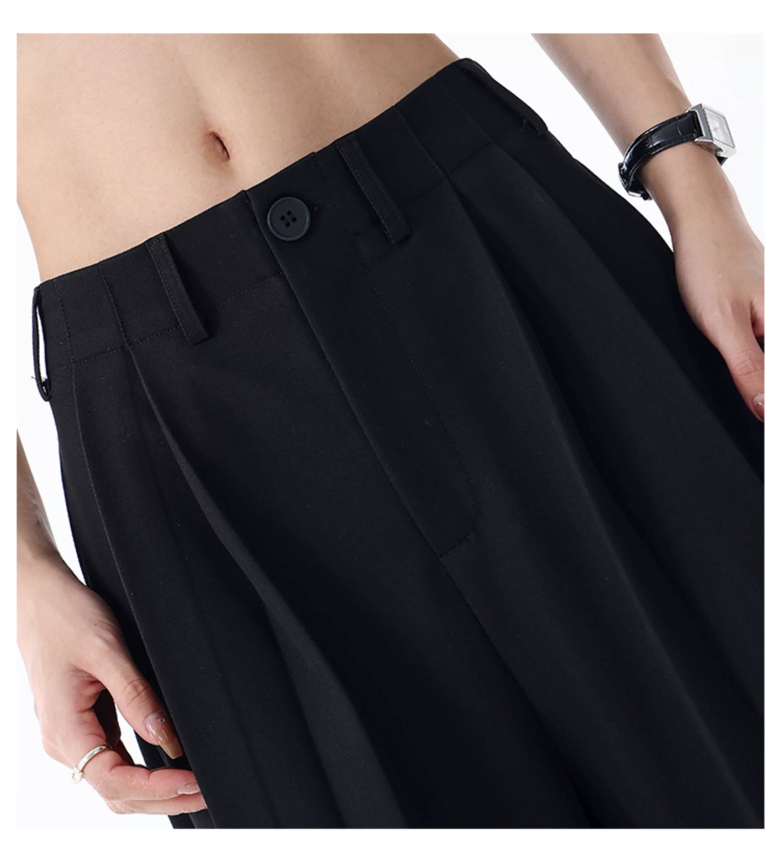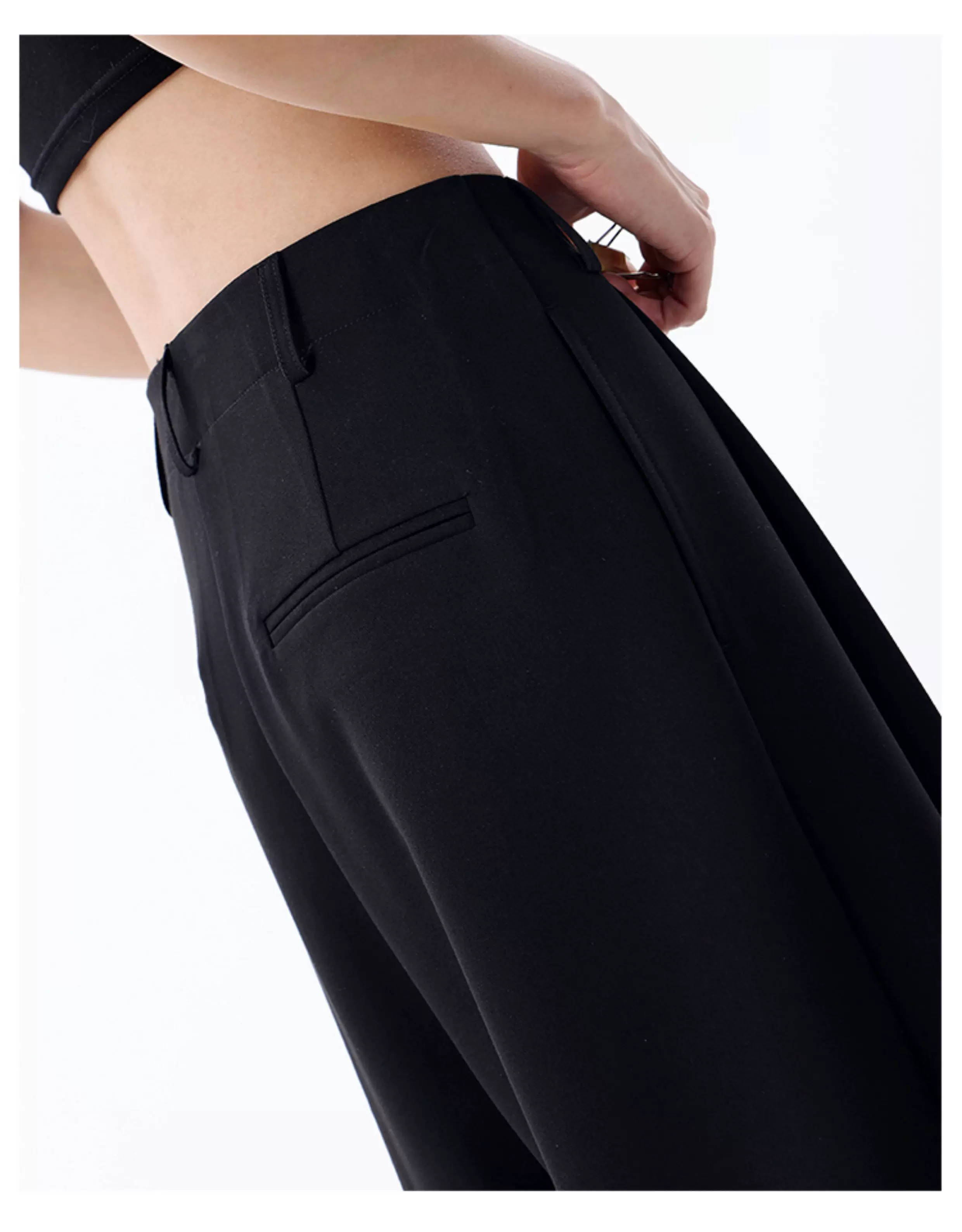 Quần vest đen thiết kế nguyên bản của KEN STUDIO dành cho nữ với kiểu xếp ly, quần ống rộng dáng rộng, thoải mái.