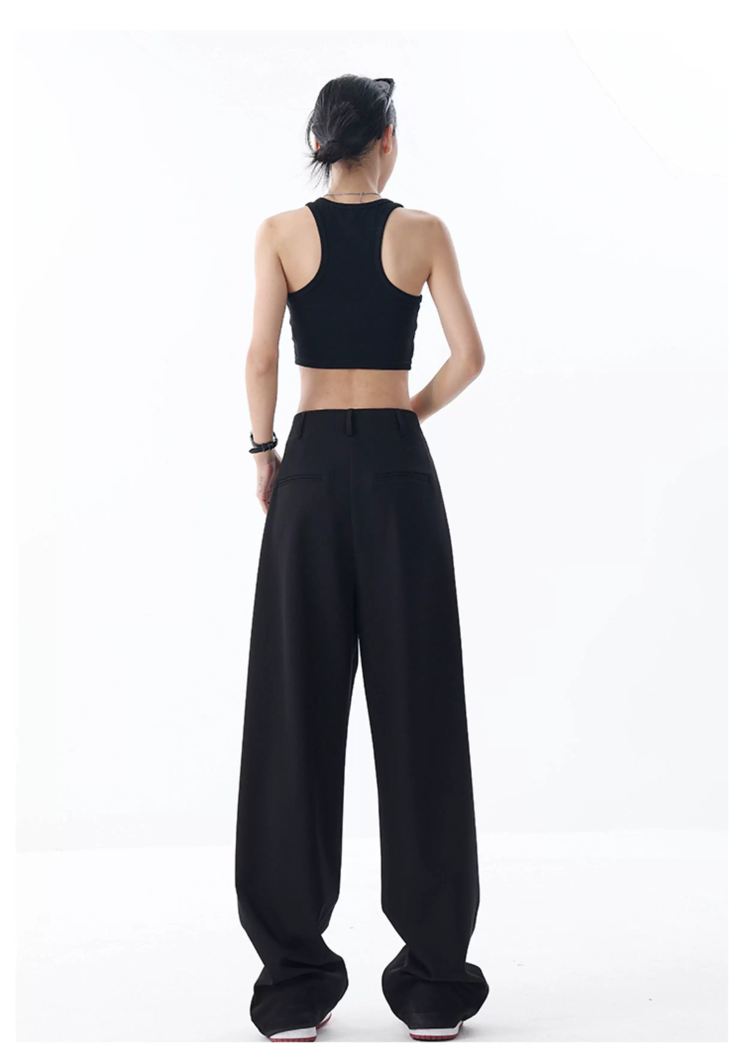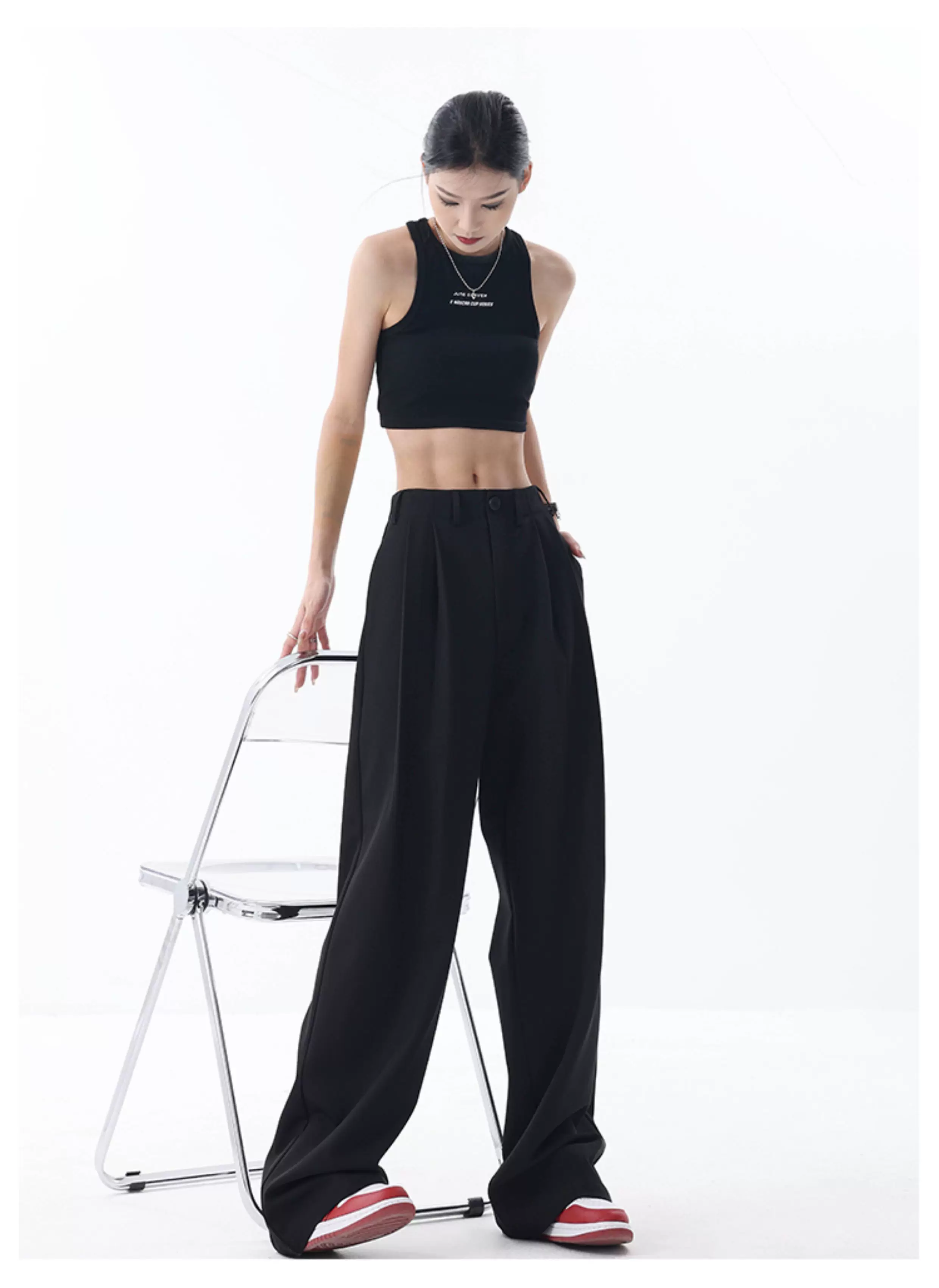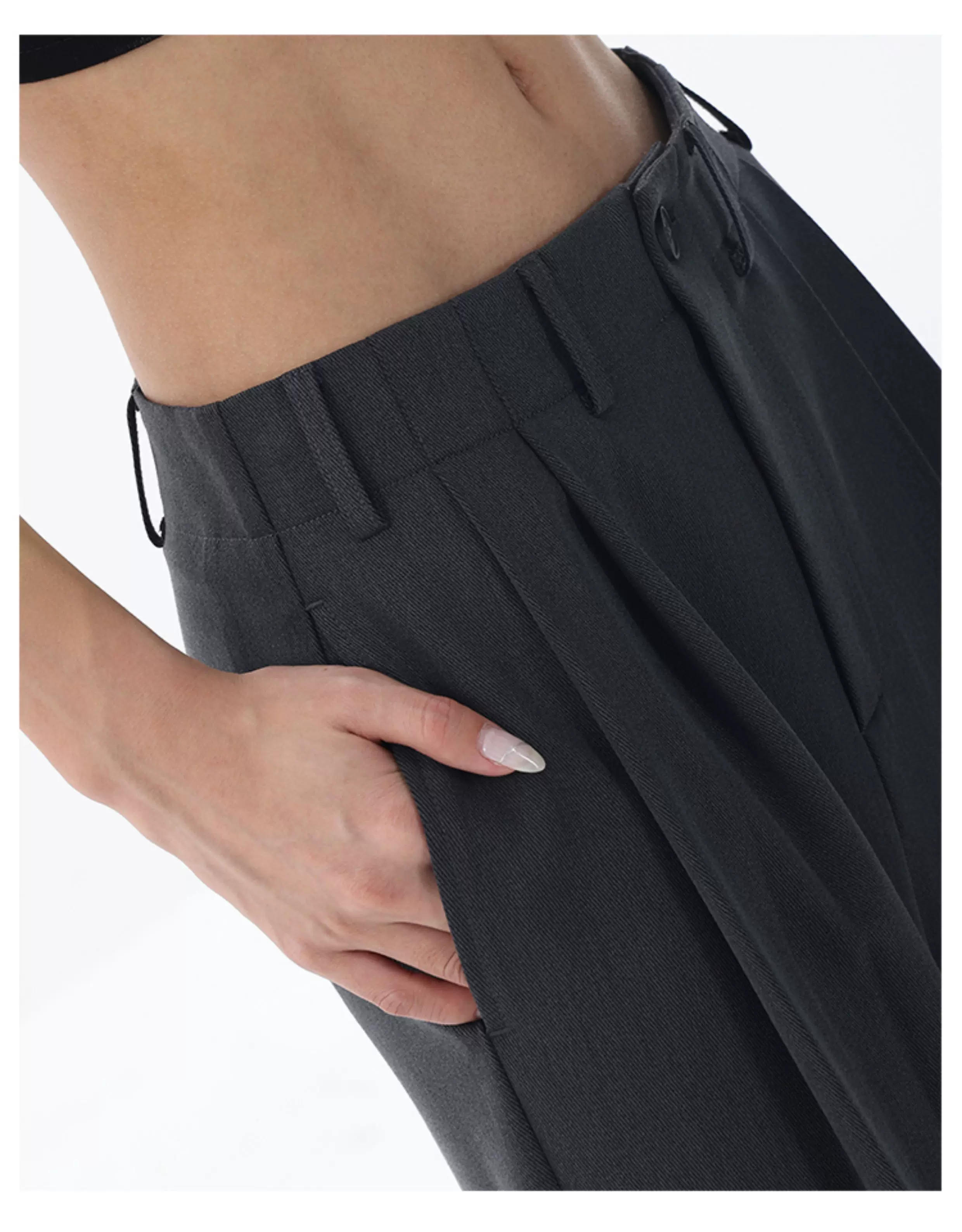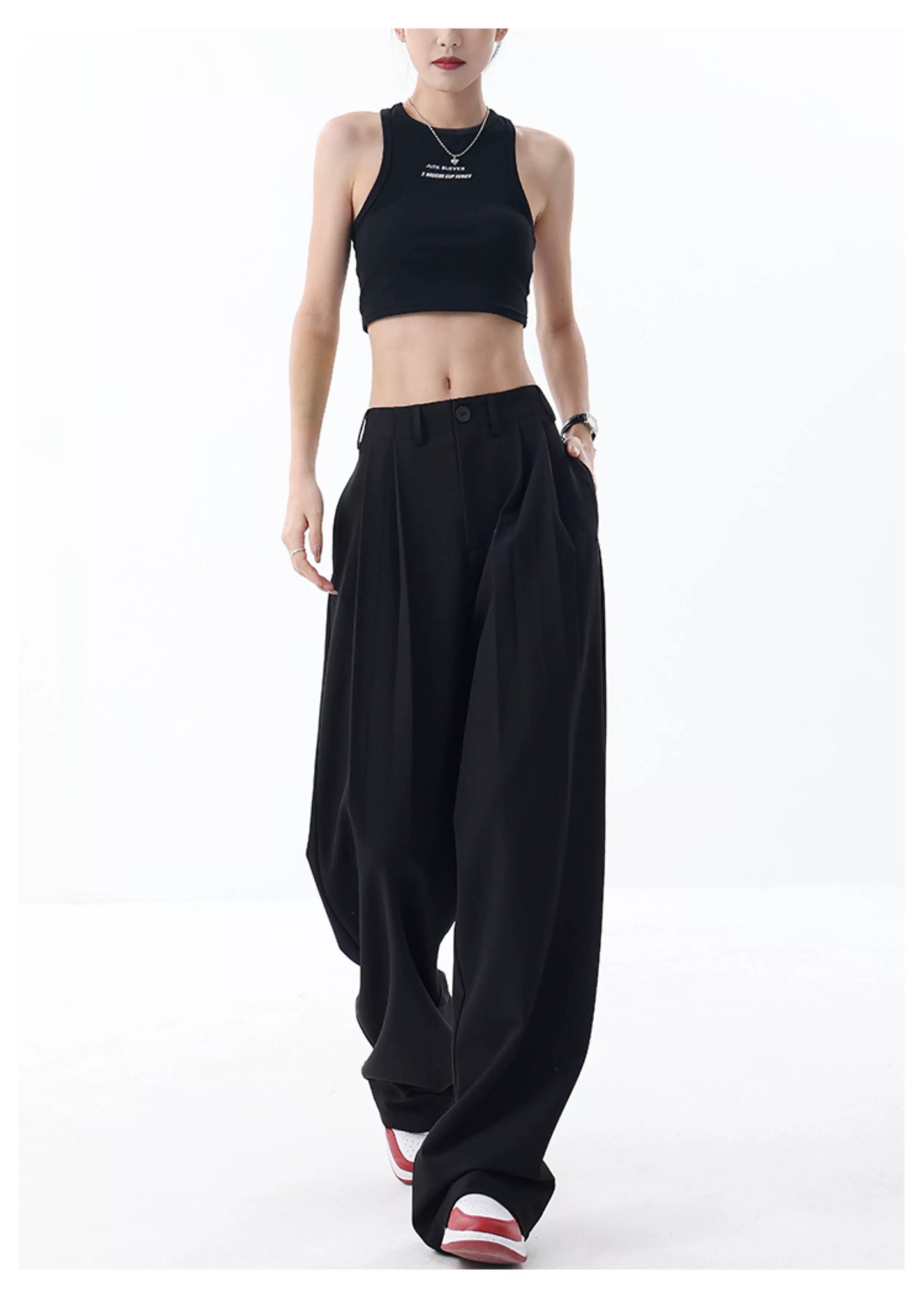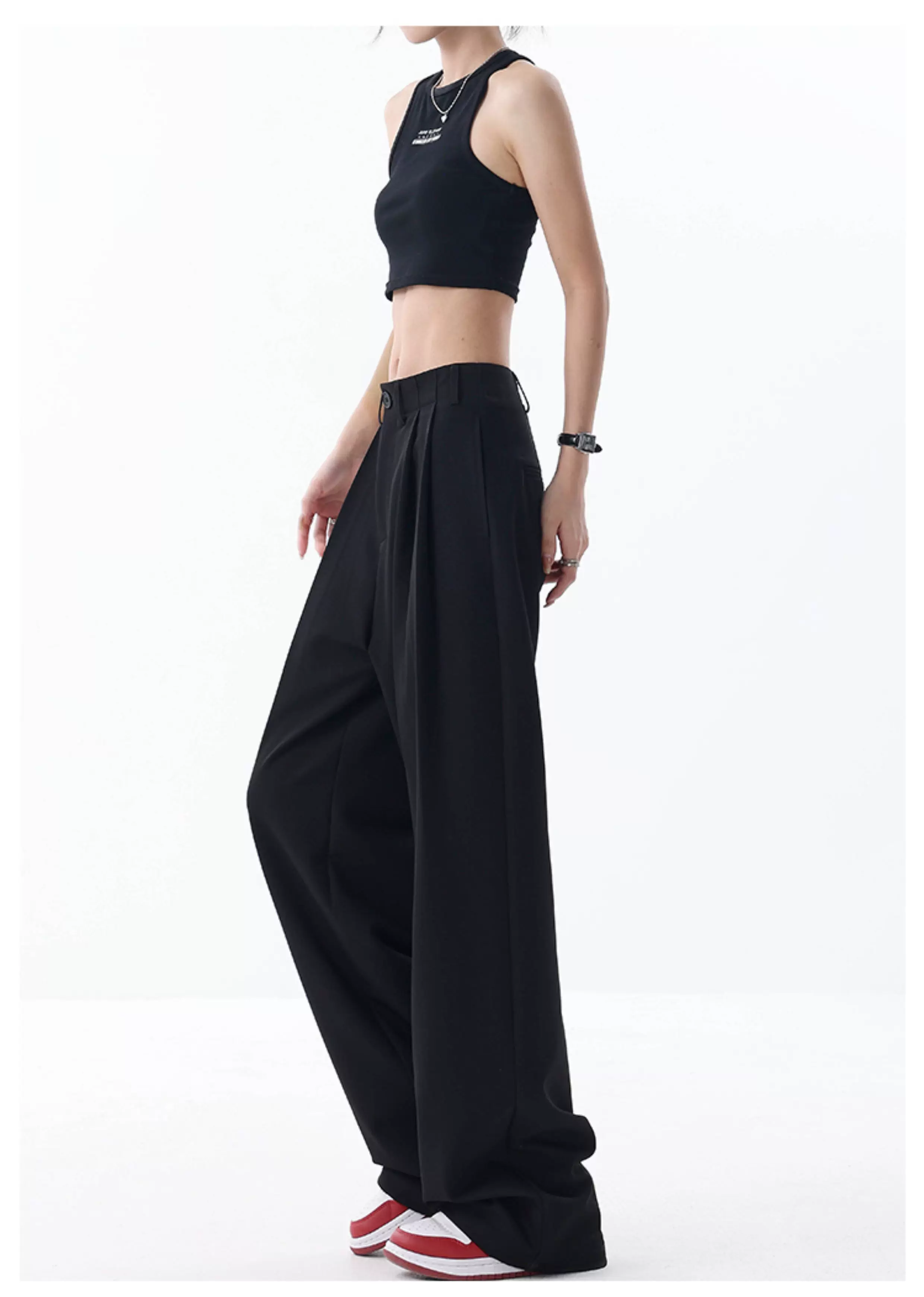 Quần vest đen thiết kế nguyên bản của KEN STUDIO dành cho nữ với kiểu xếp ly, quần ống rộng dáng rộng, thoải mái.
