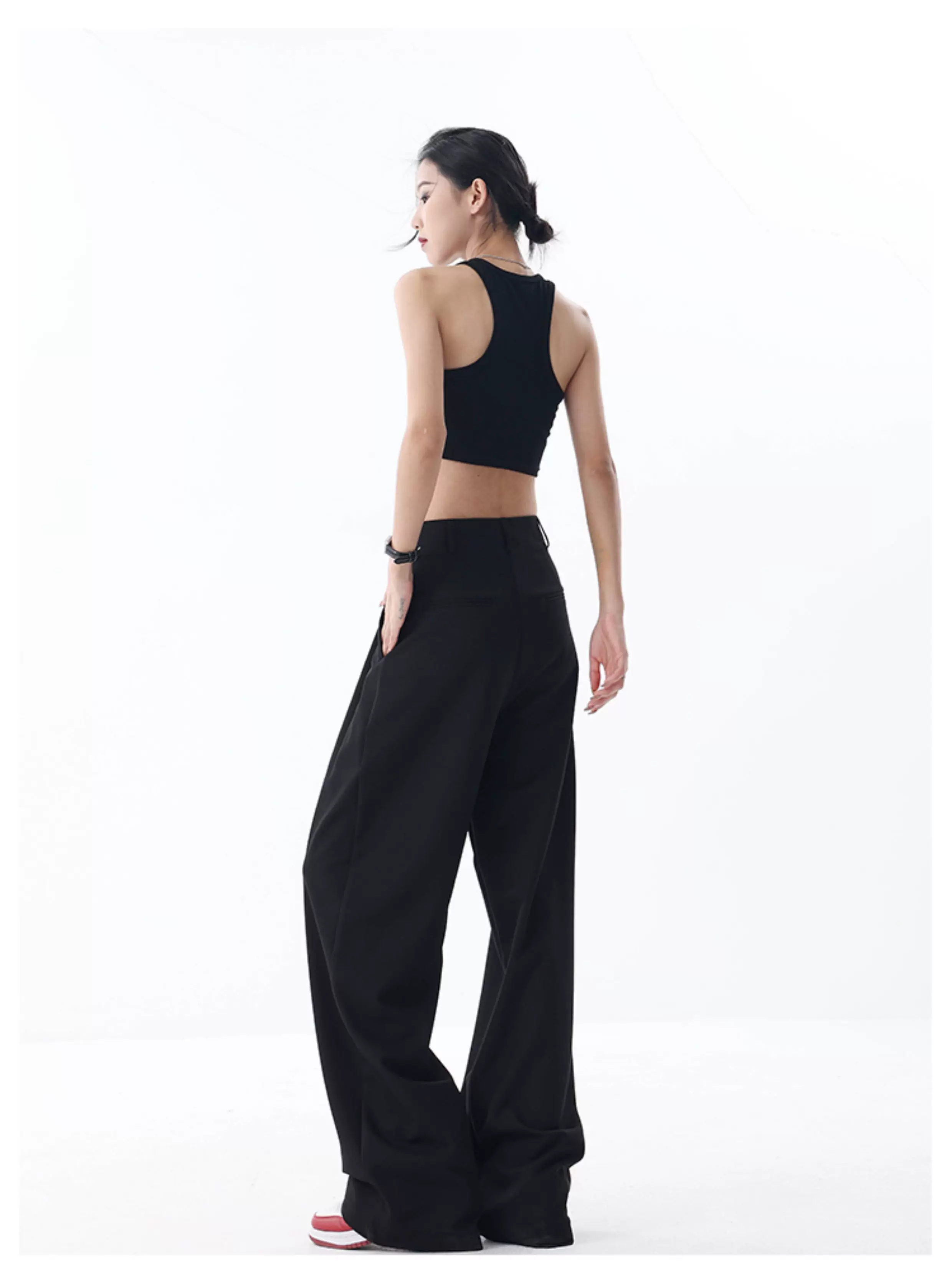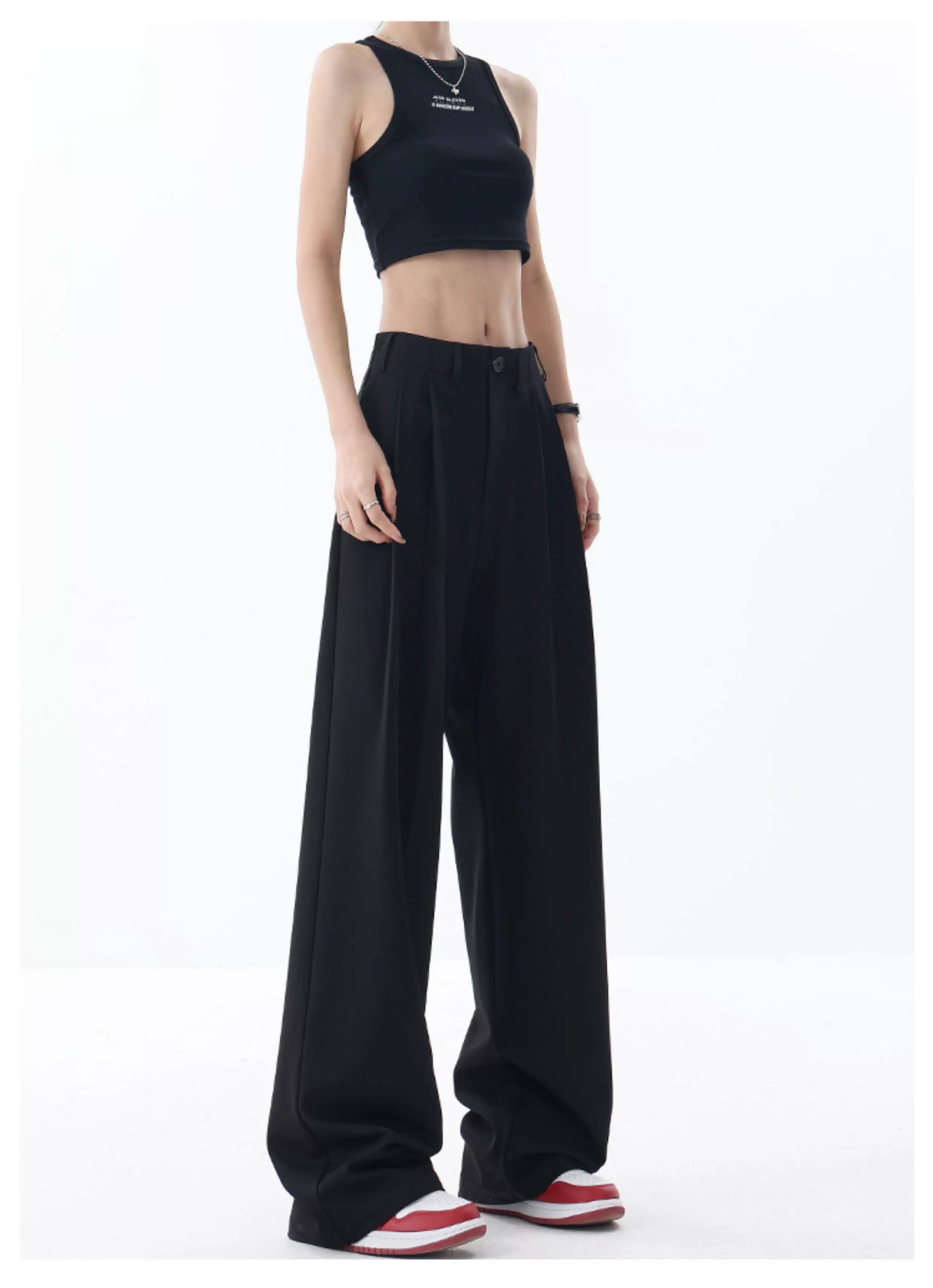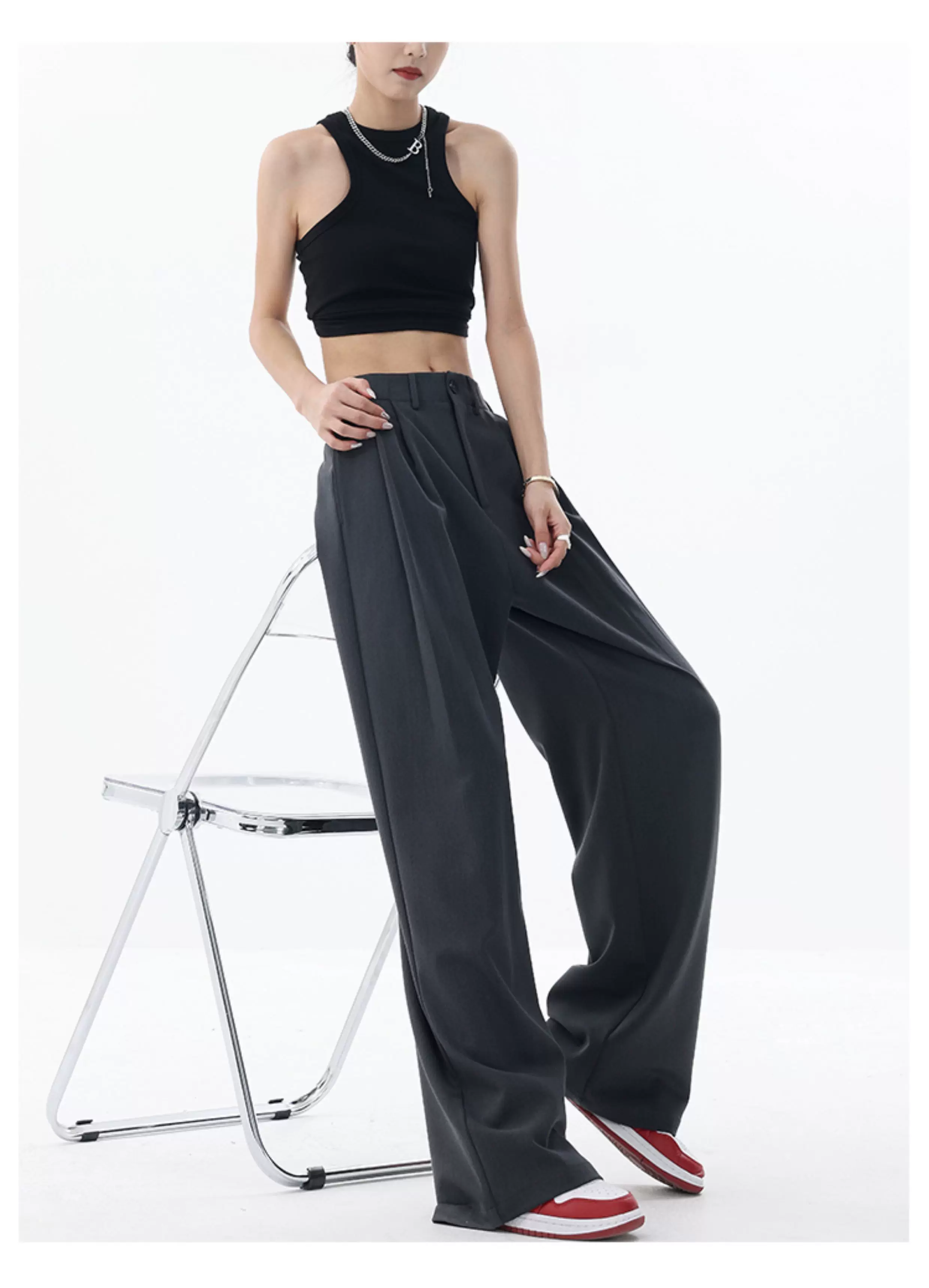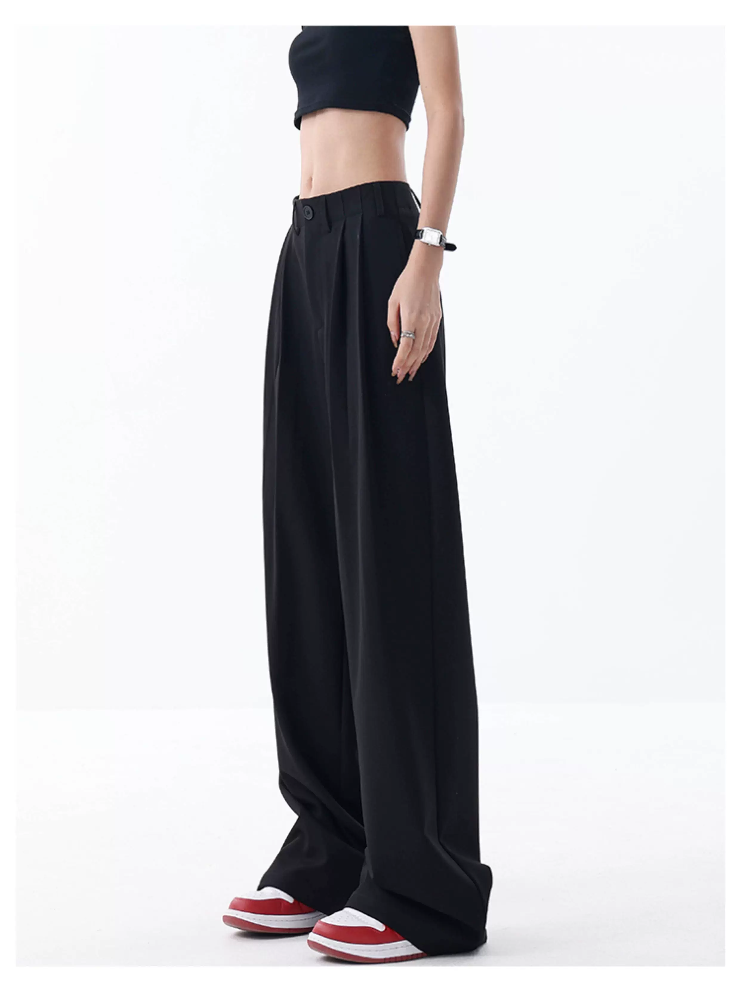 Quần vest đen thiết kế nguyên bản của KEN STUDIO dành cho nữ với kiểu xếp ly, quần ống rộng dáng rộng, thoải mái.