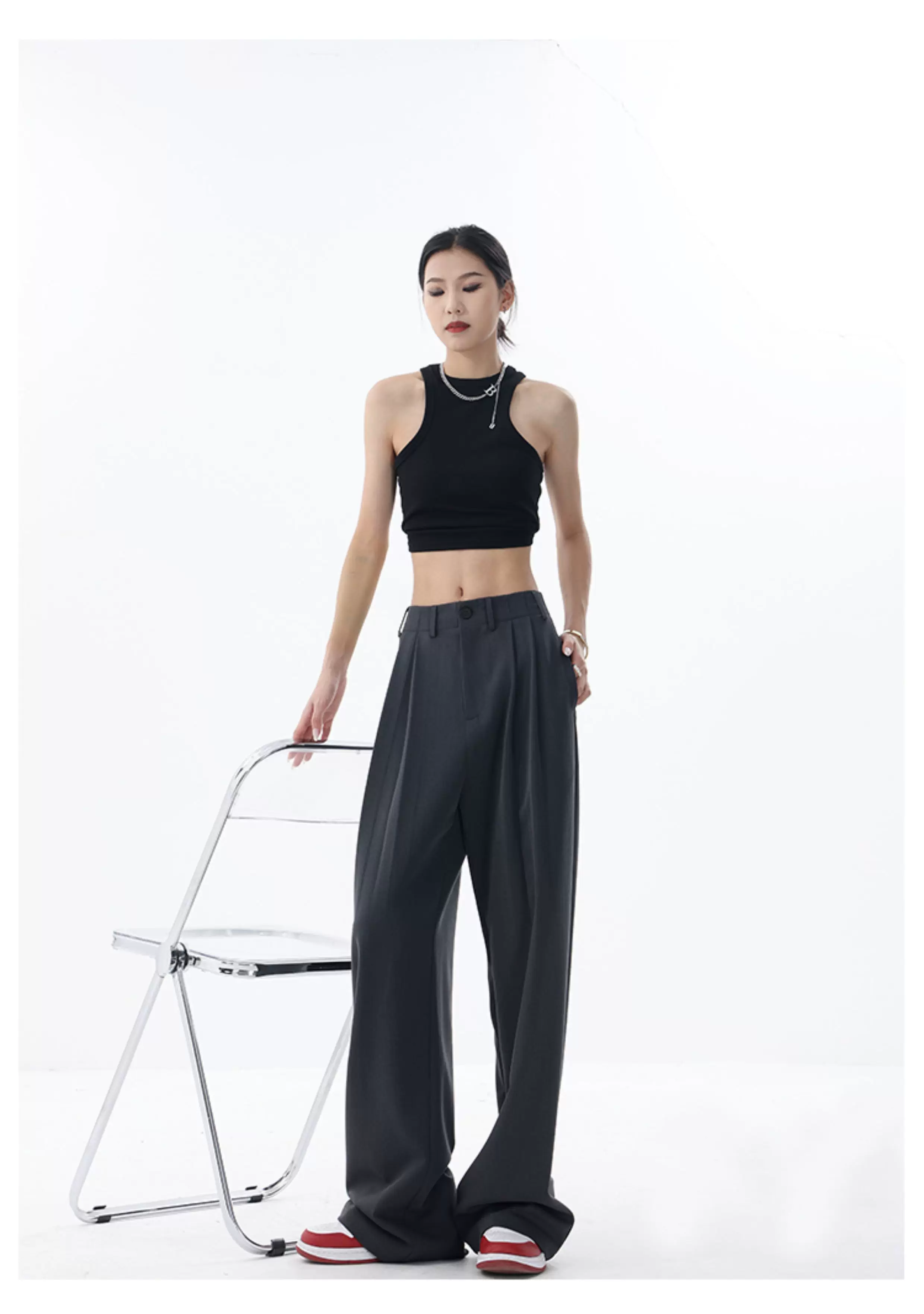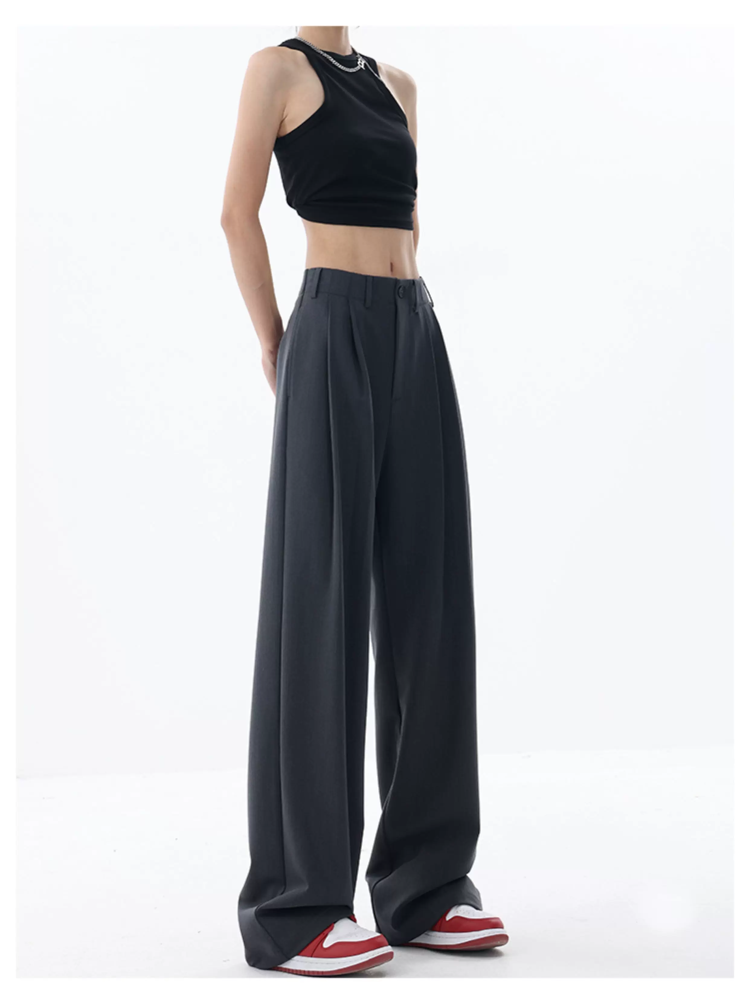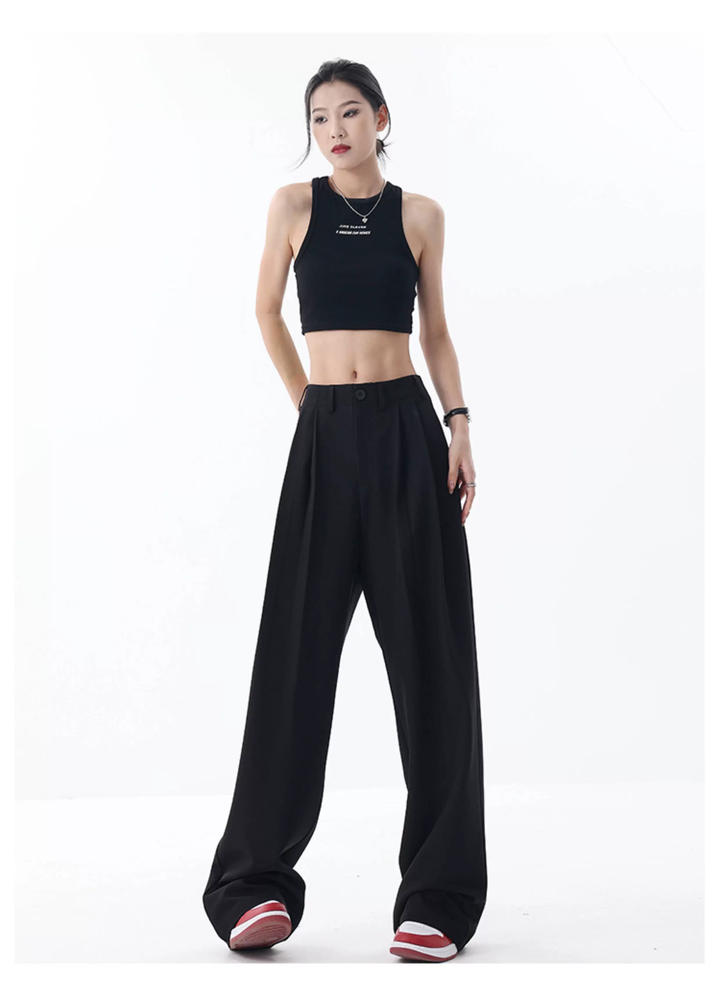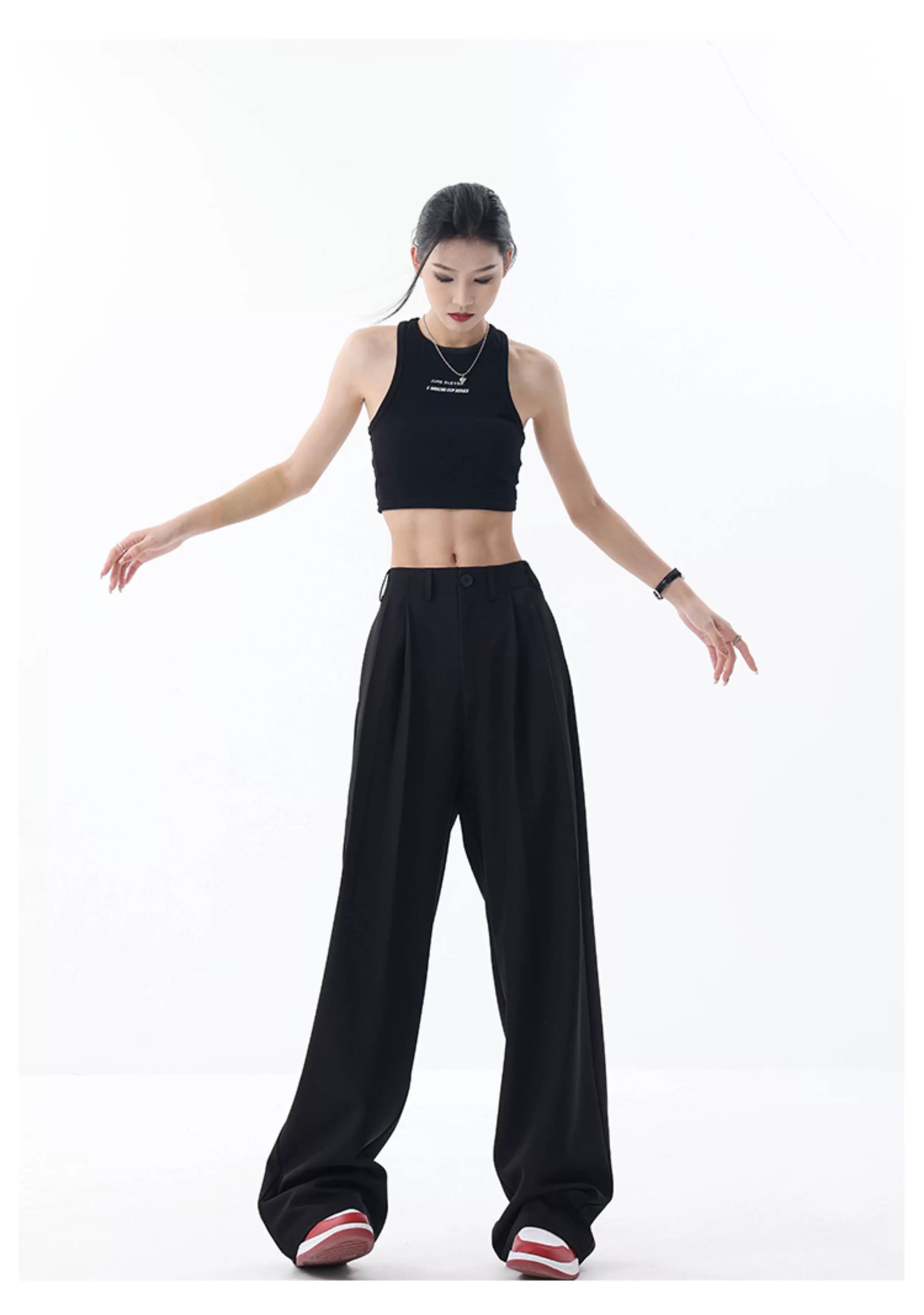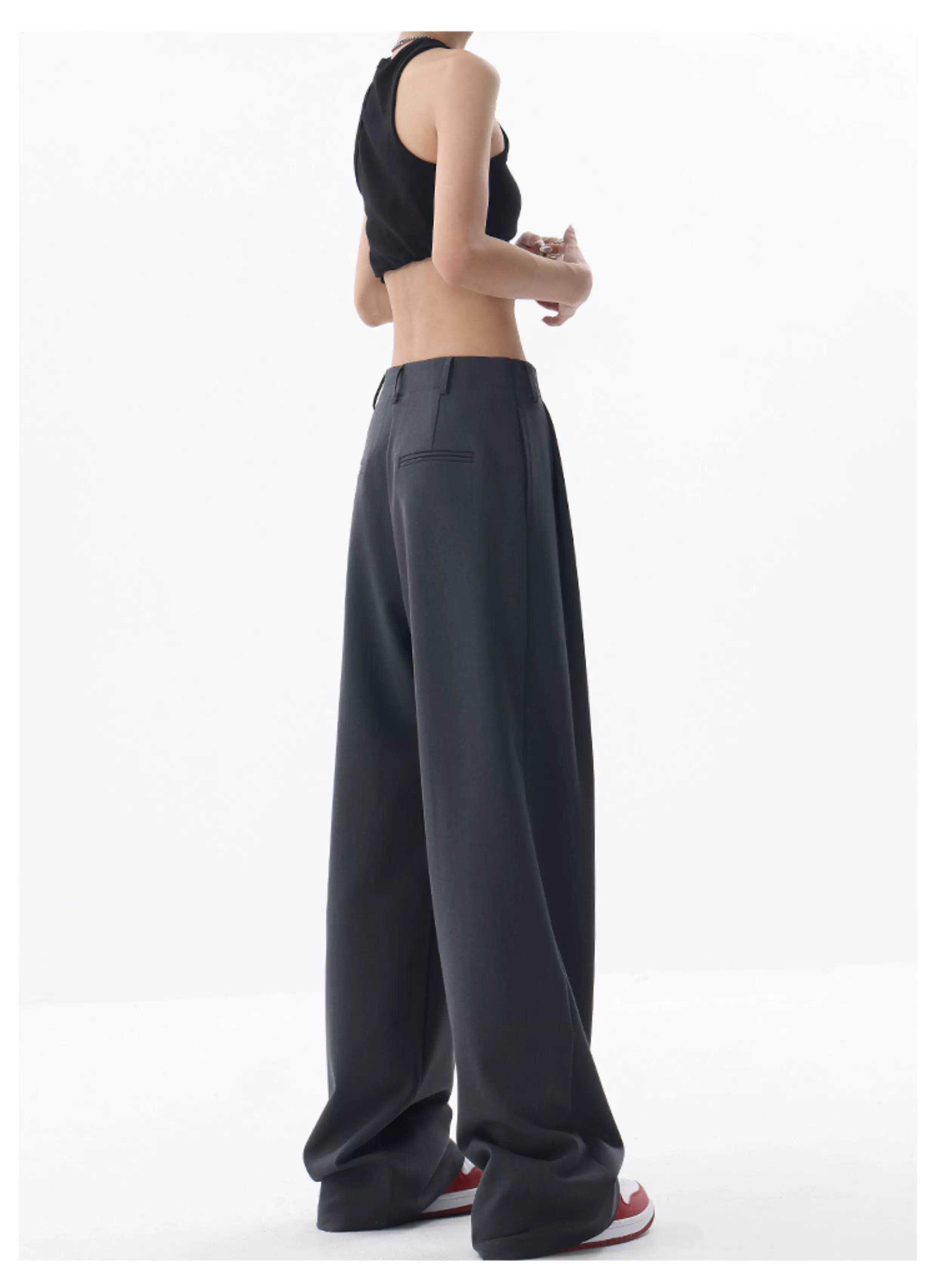 Quần vest đen thiết kế nguyên bản của KEN STUDIO dành cho nữ với kiểu xếp ly, quần ống rộng dáng rộng, thoải mái.