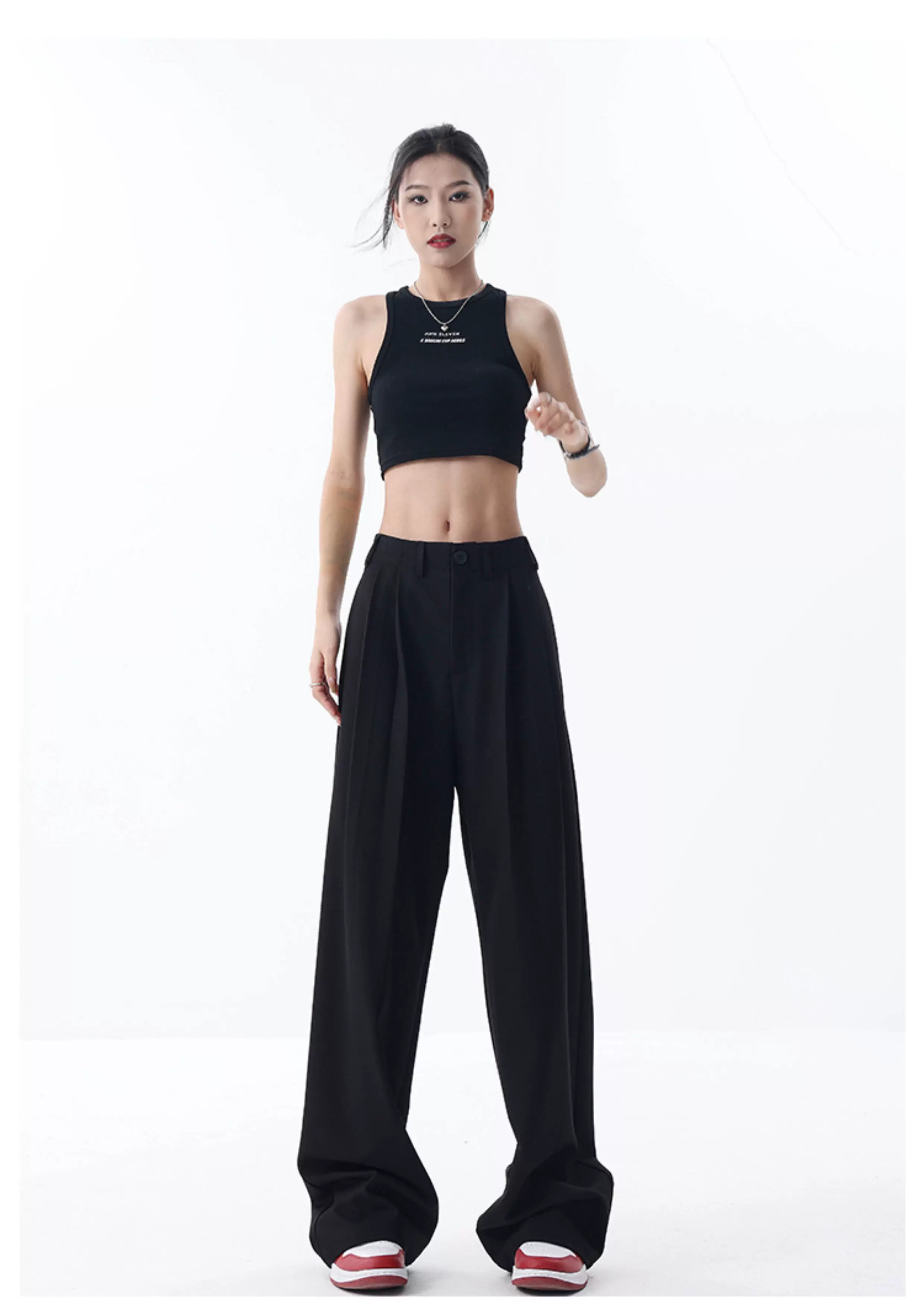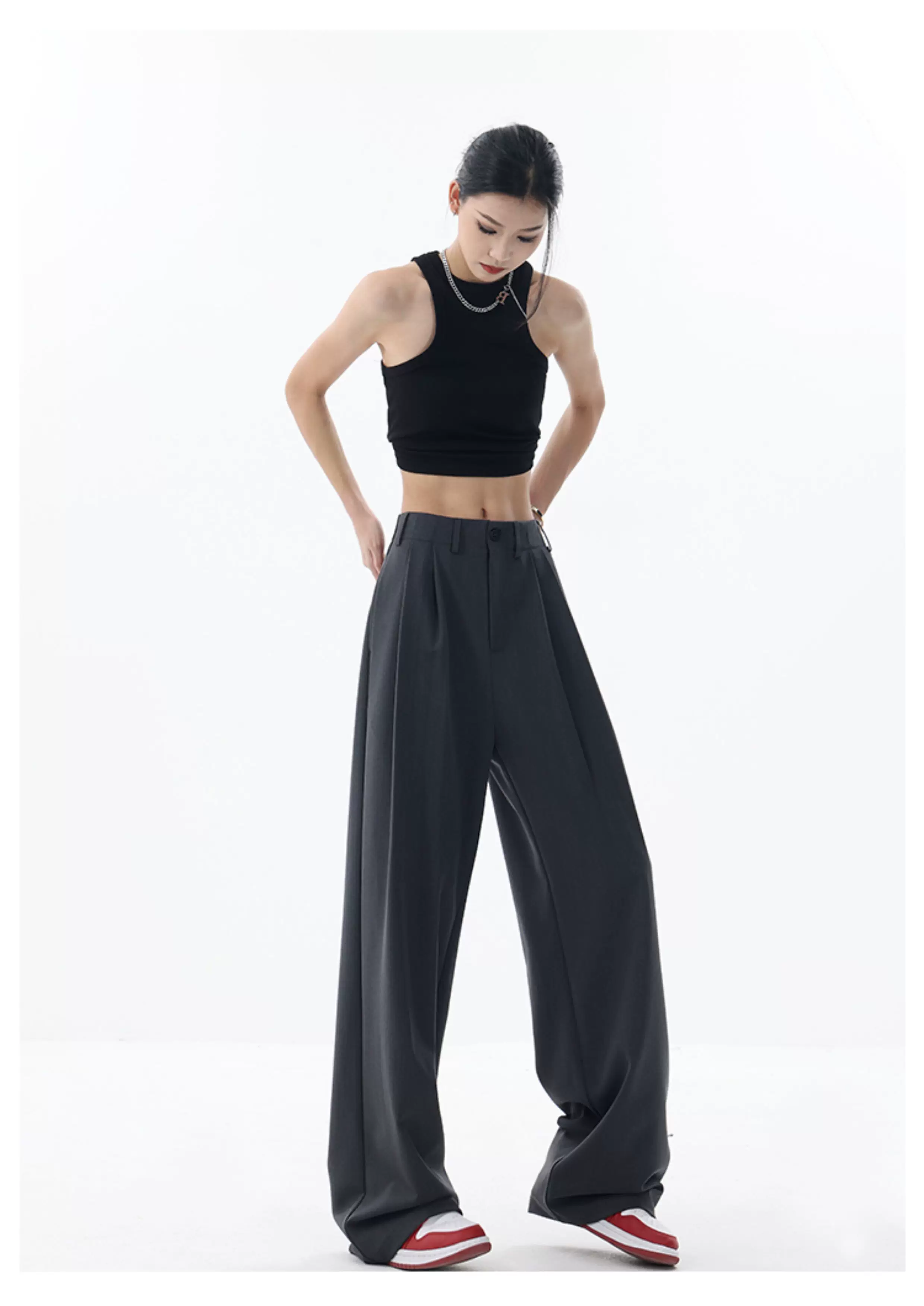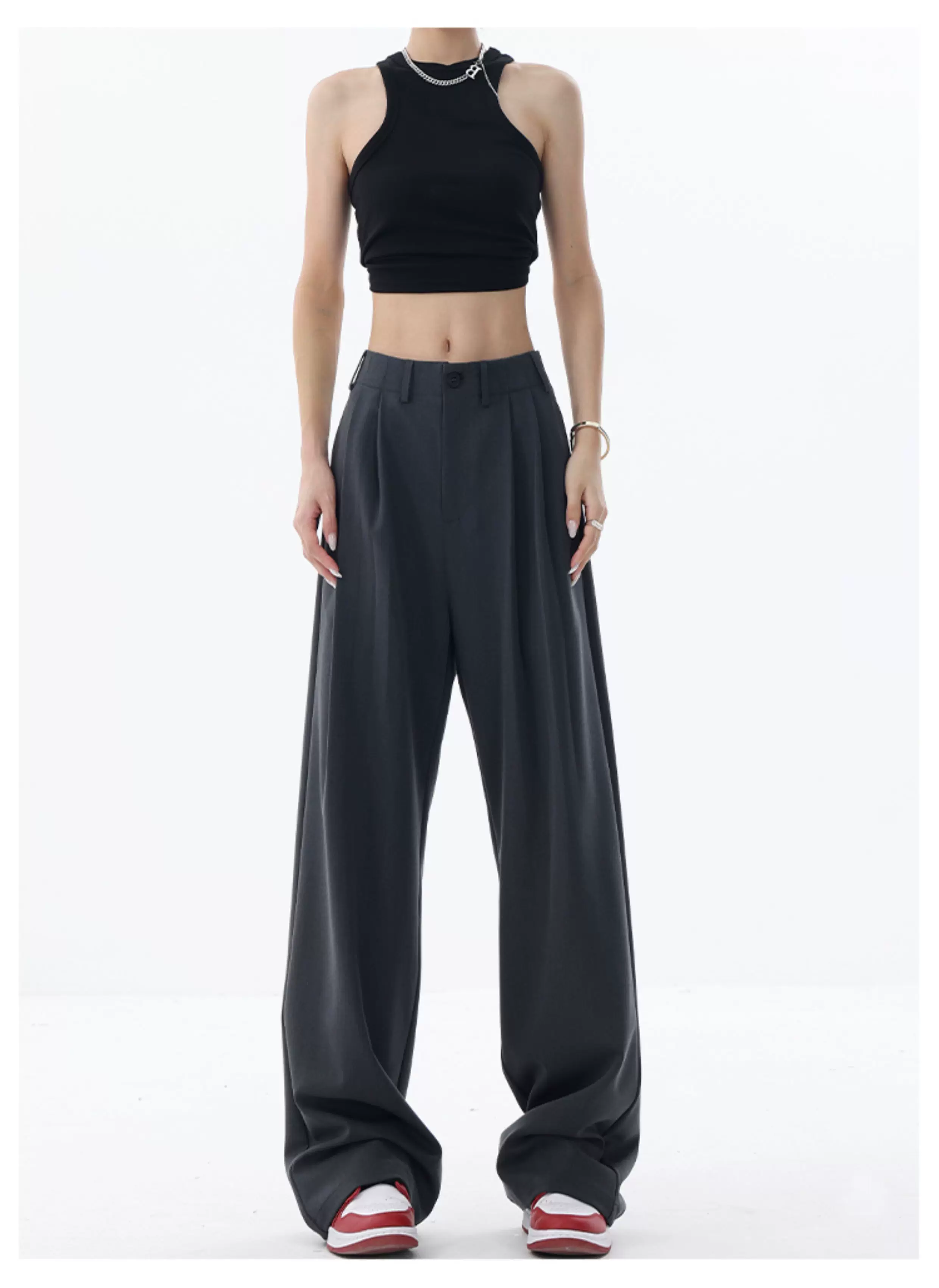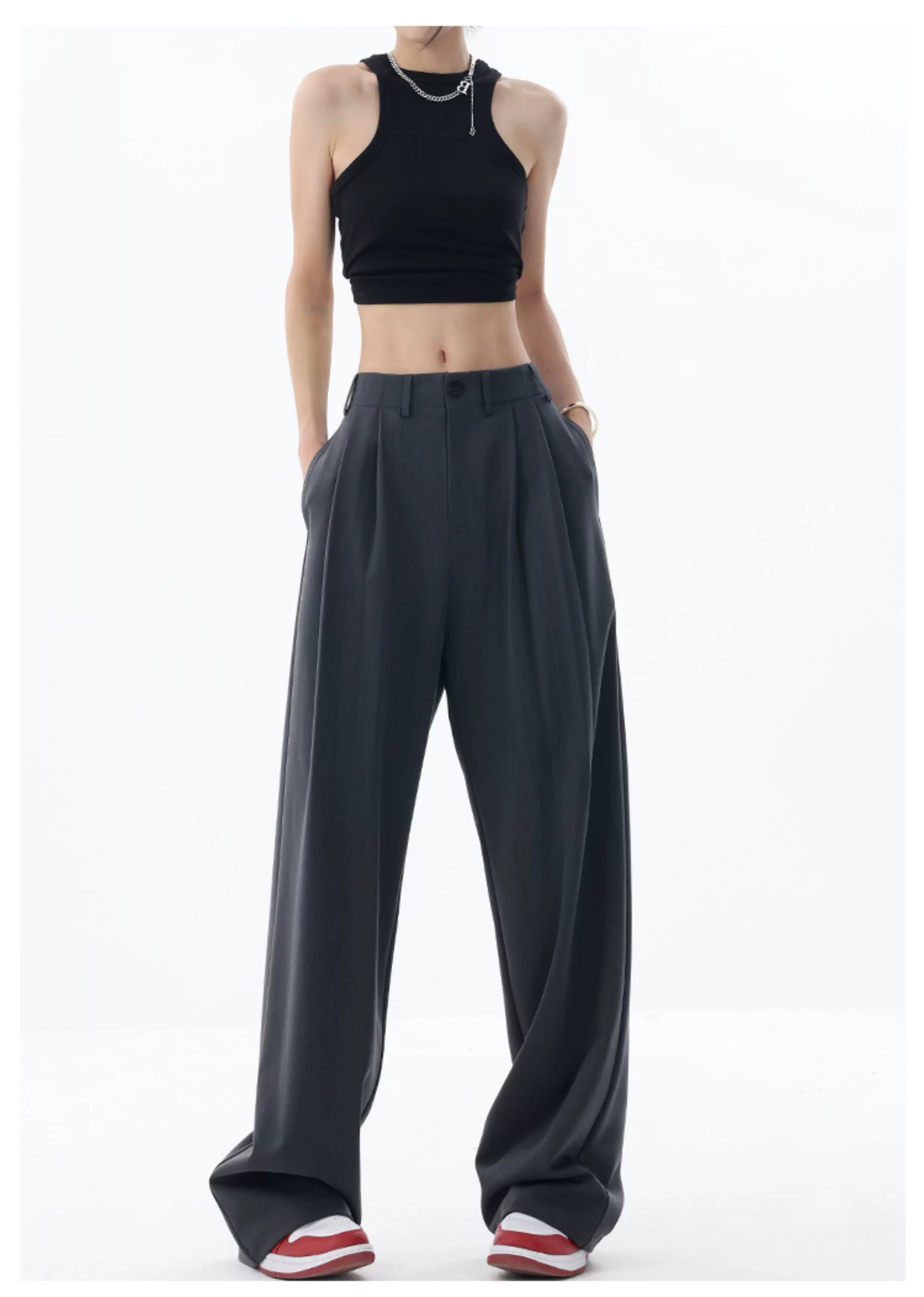 Quần vest đen thiết kế nguyên bản của KEN STUDIO dành cho nữ với kiểu xếp ly, quần ống rộng dáng rộng, thoải mái.