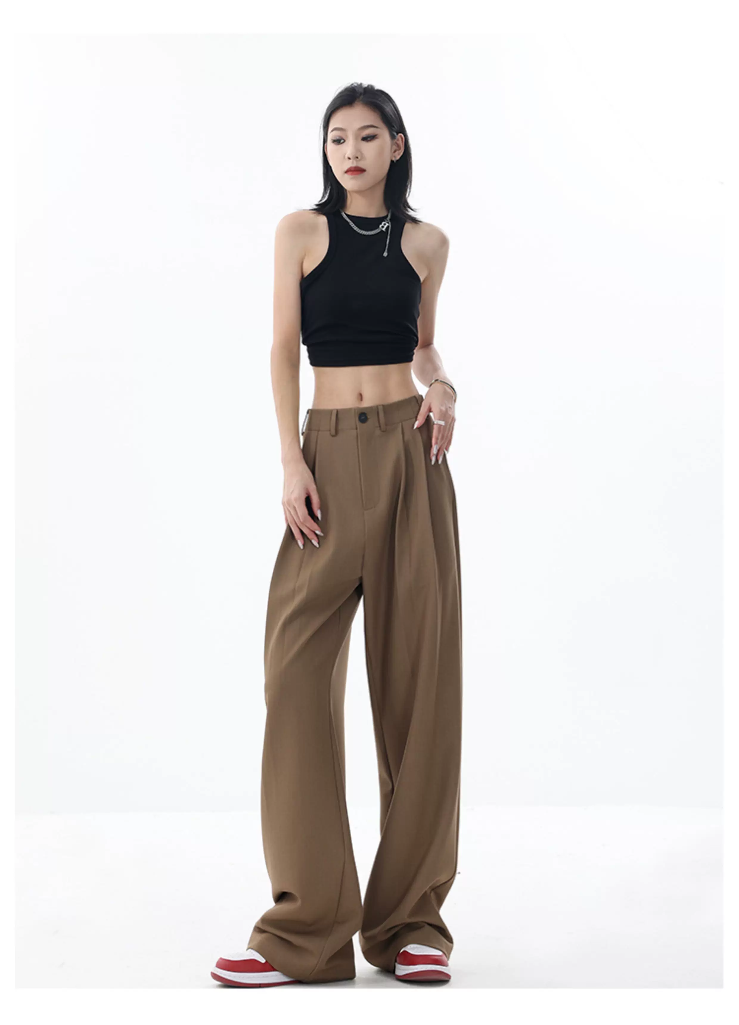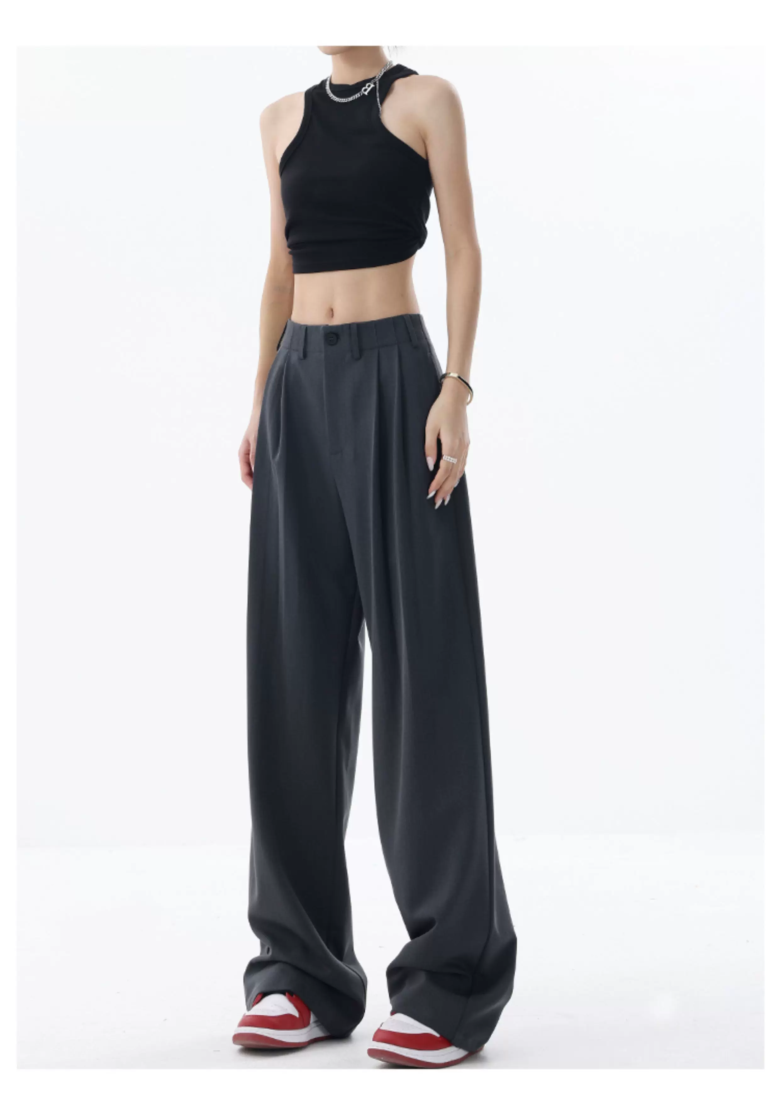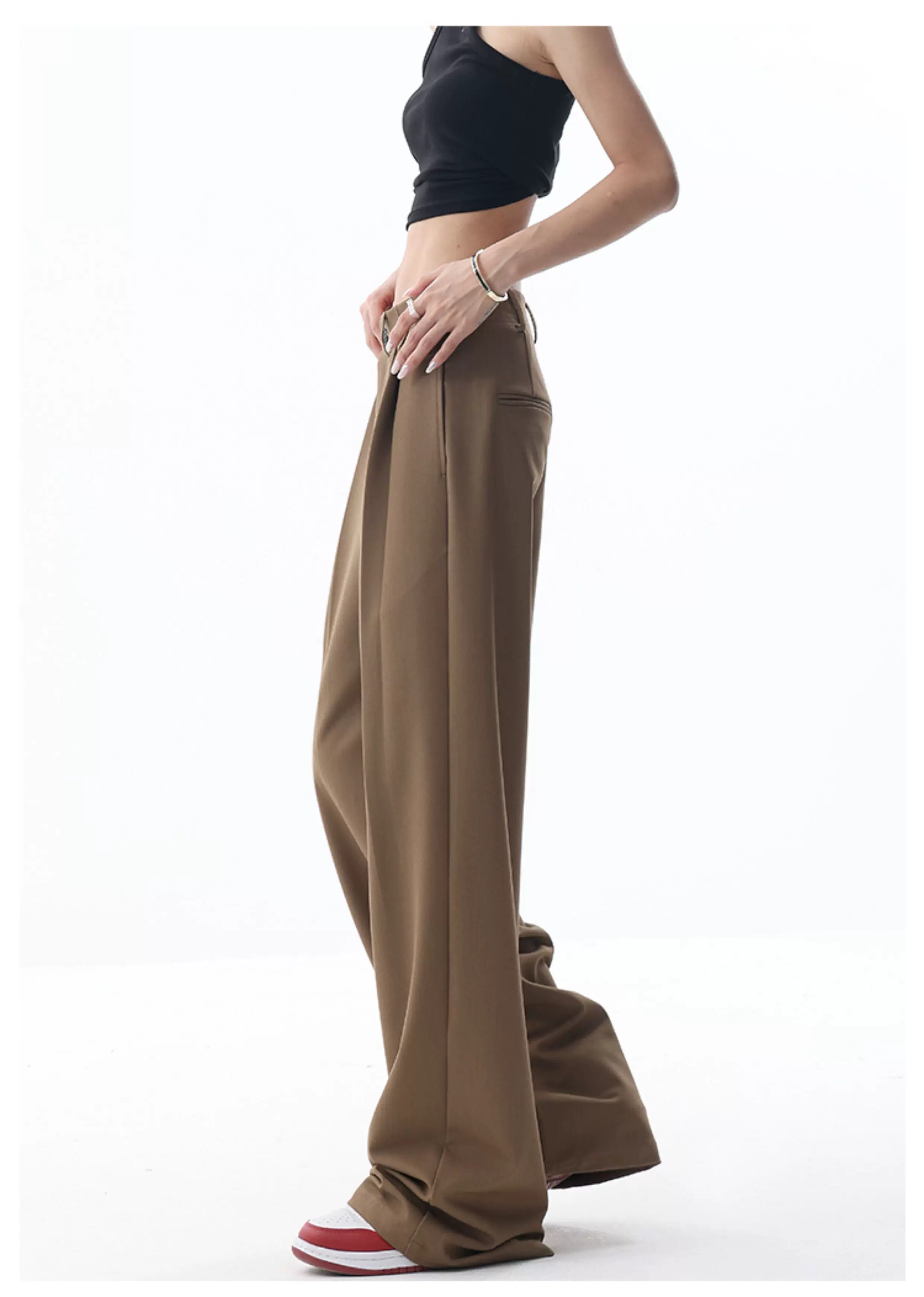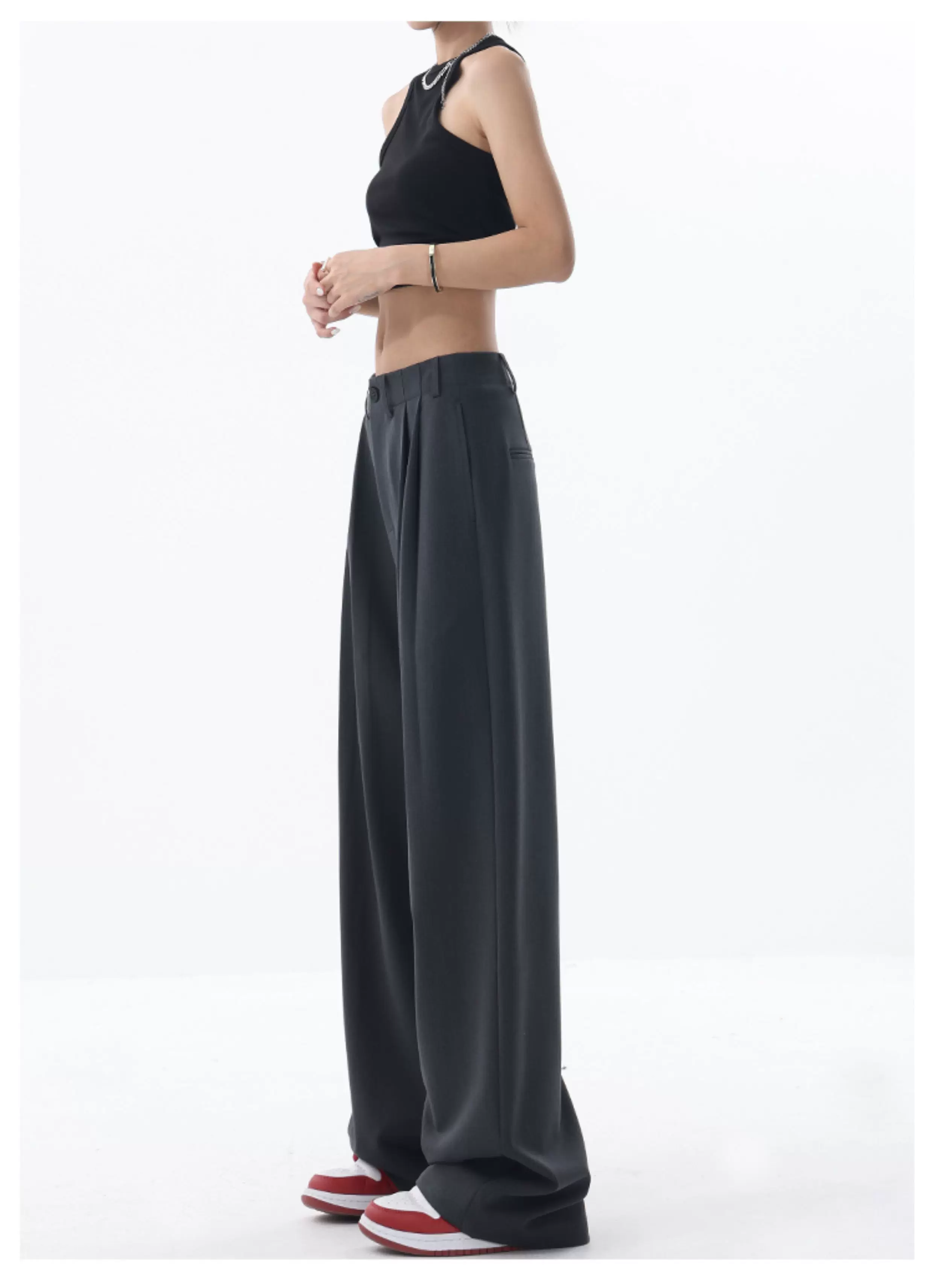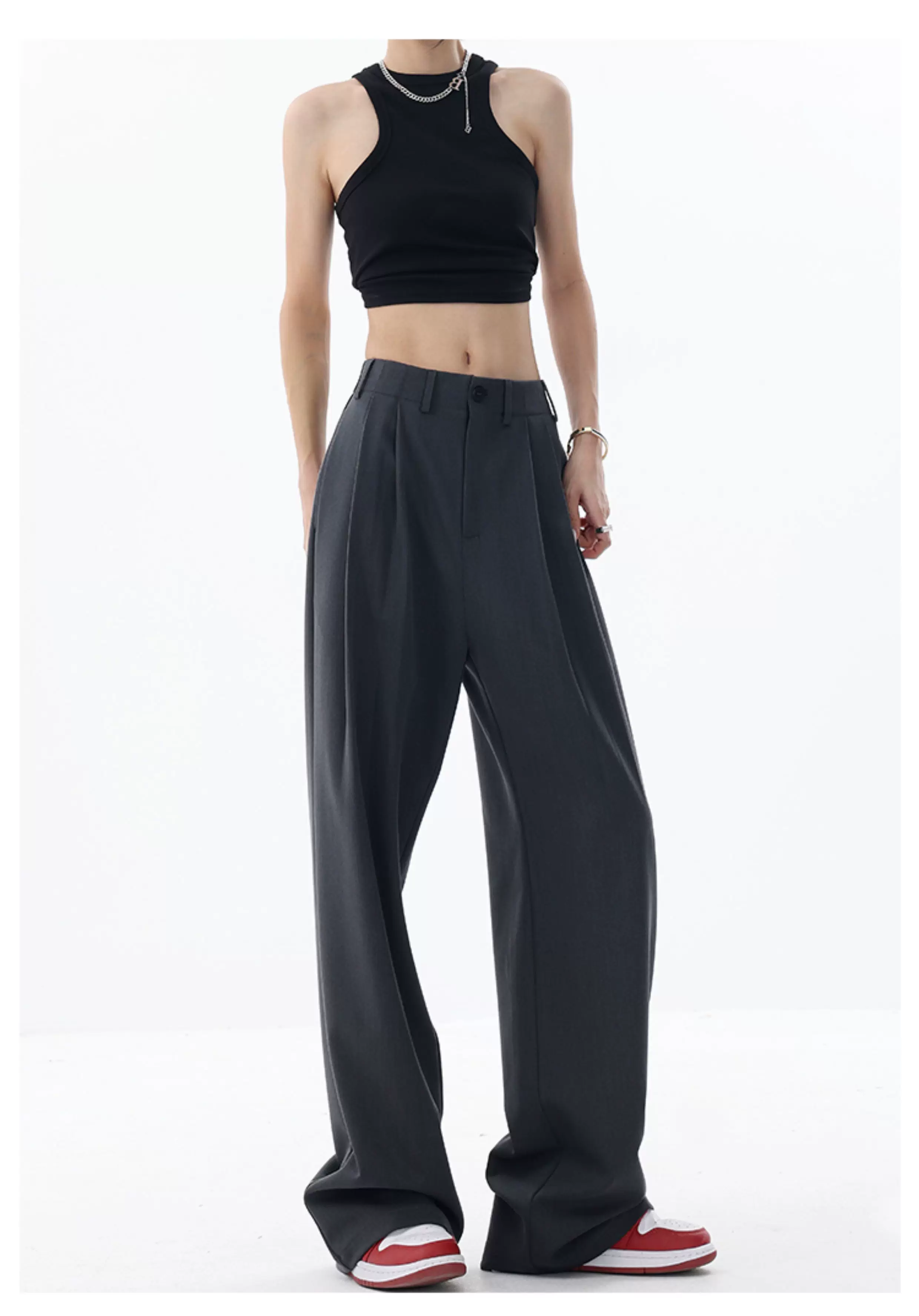 Quần vest đen thiết kế nguyên bản của KEN STUDIO dành cho nữ với kiểu xếp ly, quần ống rộng dáng rộng, thoải mái.