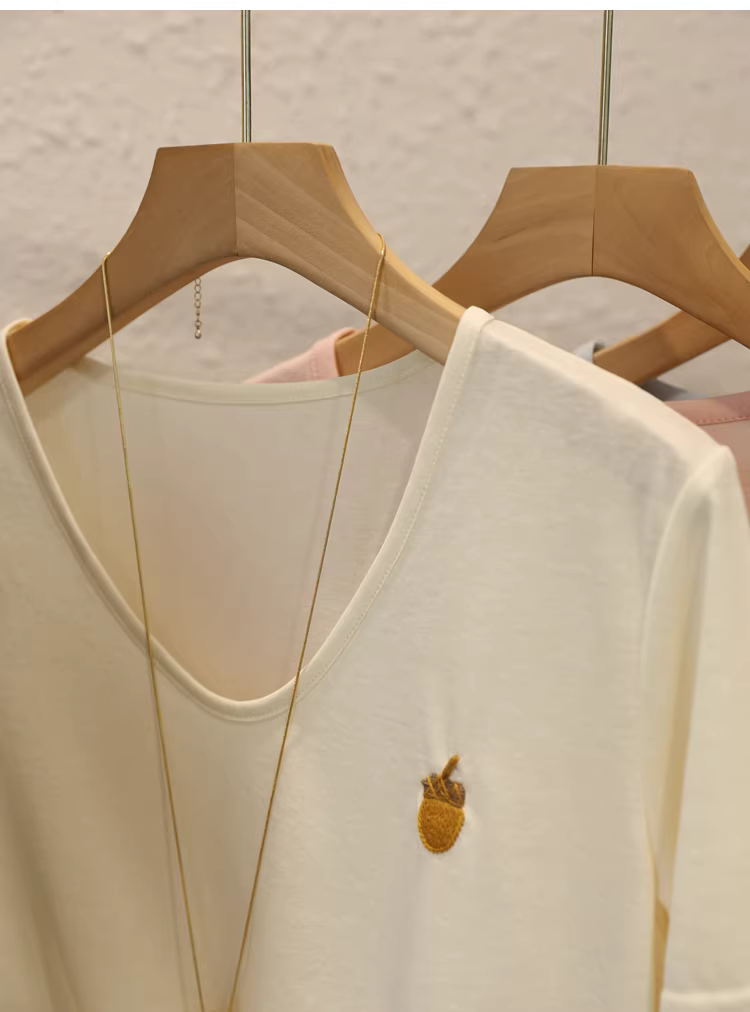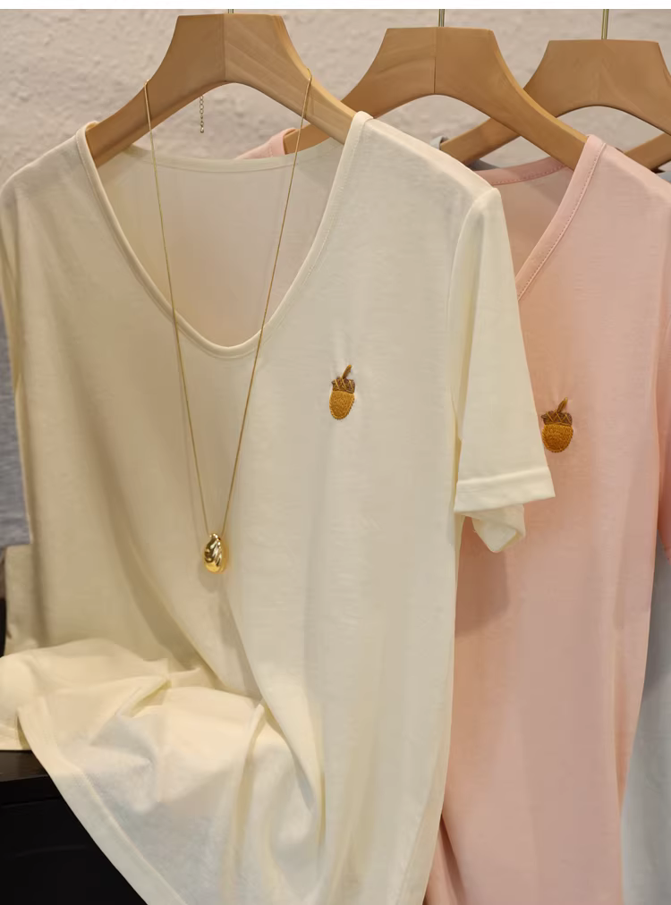 - Rất khuyến khích! Siêu thoải mái! Áo thun dáng rộng cổ chữ V thêu bằng cotton lyocell mát mẻ dành cho nữ, mới cho mùa hè.