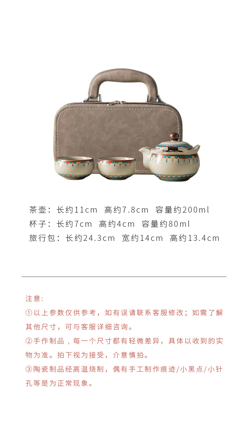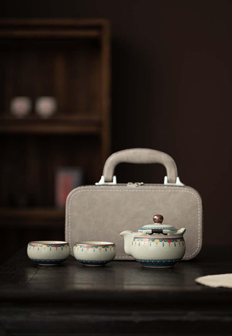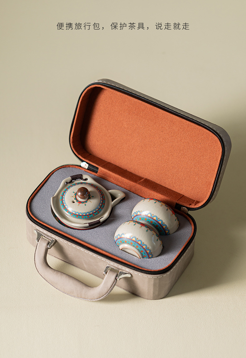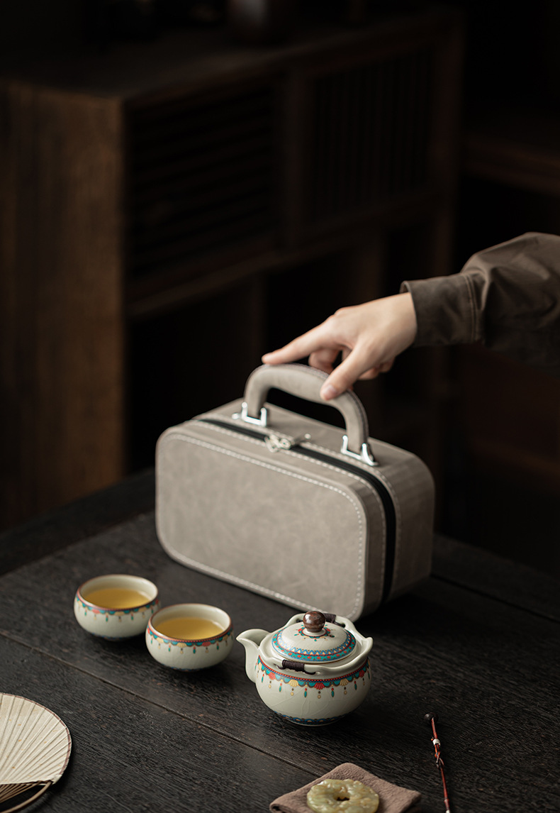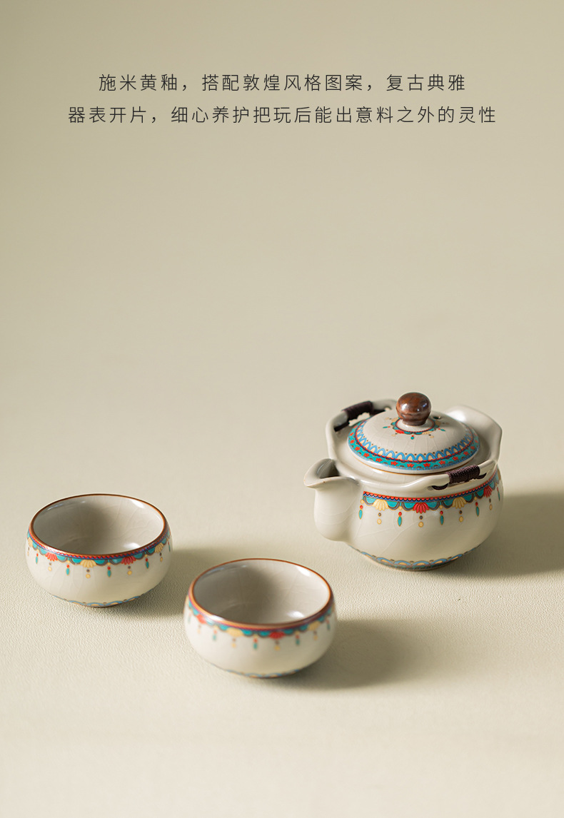 Ru Kiln Đôn Hoàng Ruyi Bộ trà du lịch một ấm hai cốc gốm cầm tay ấm trà ngoài trời pha trà cầm tay quà tặng