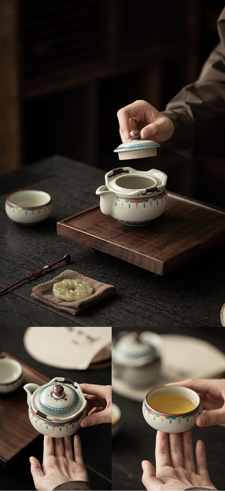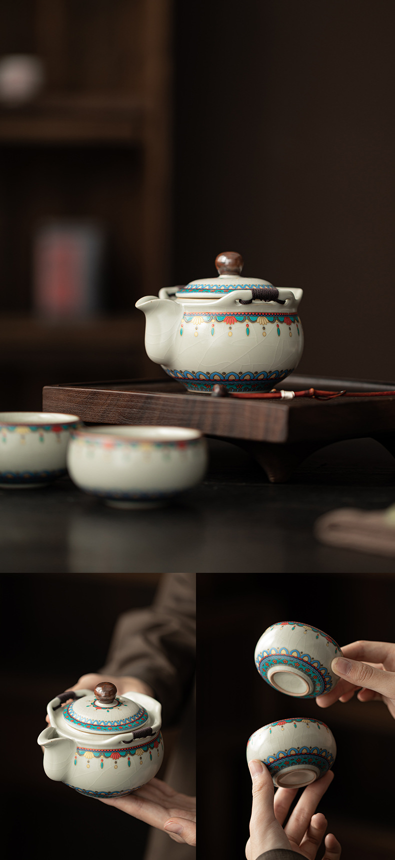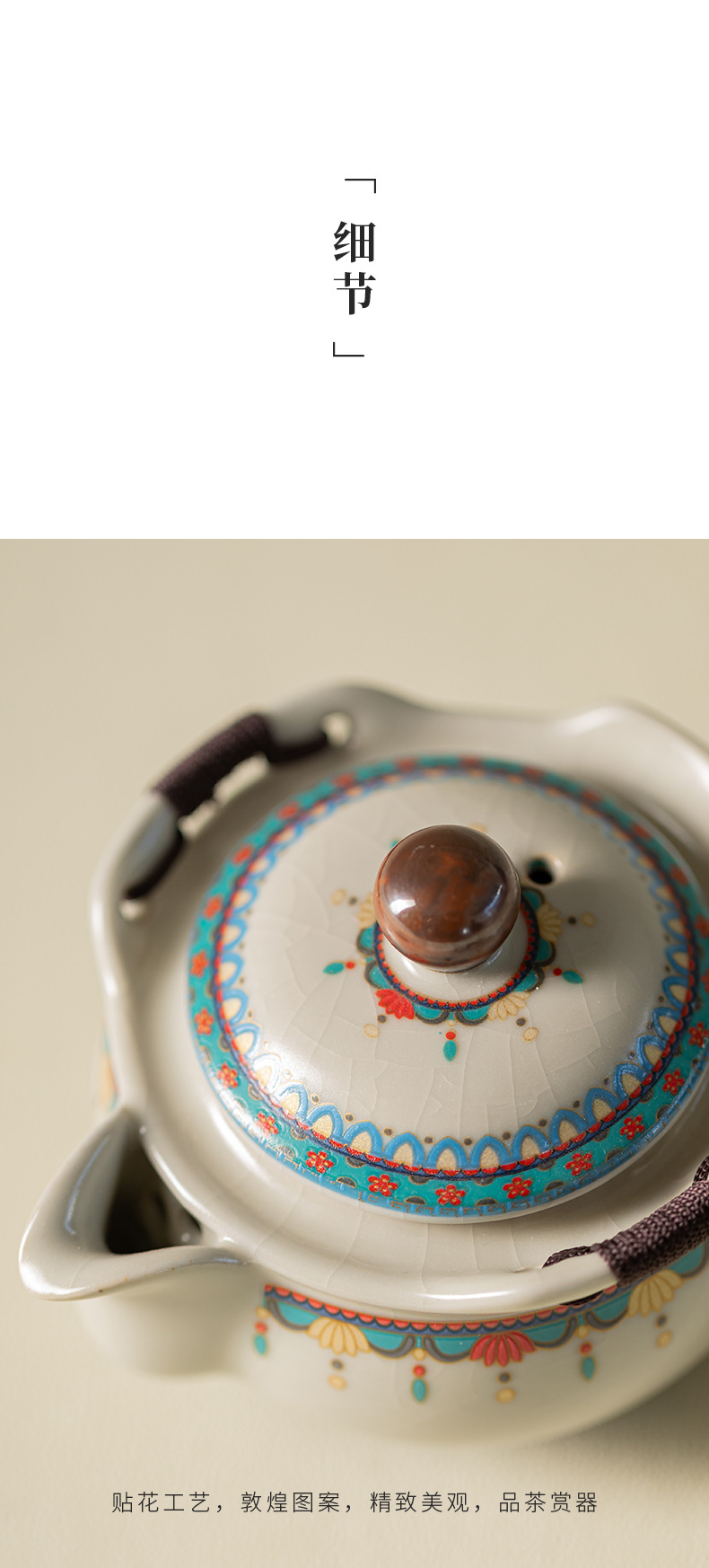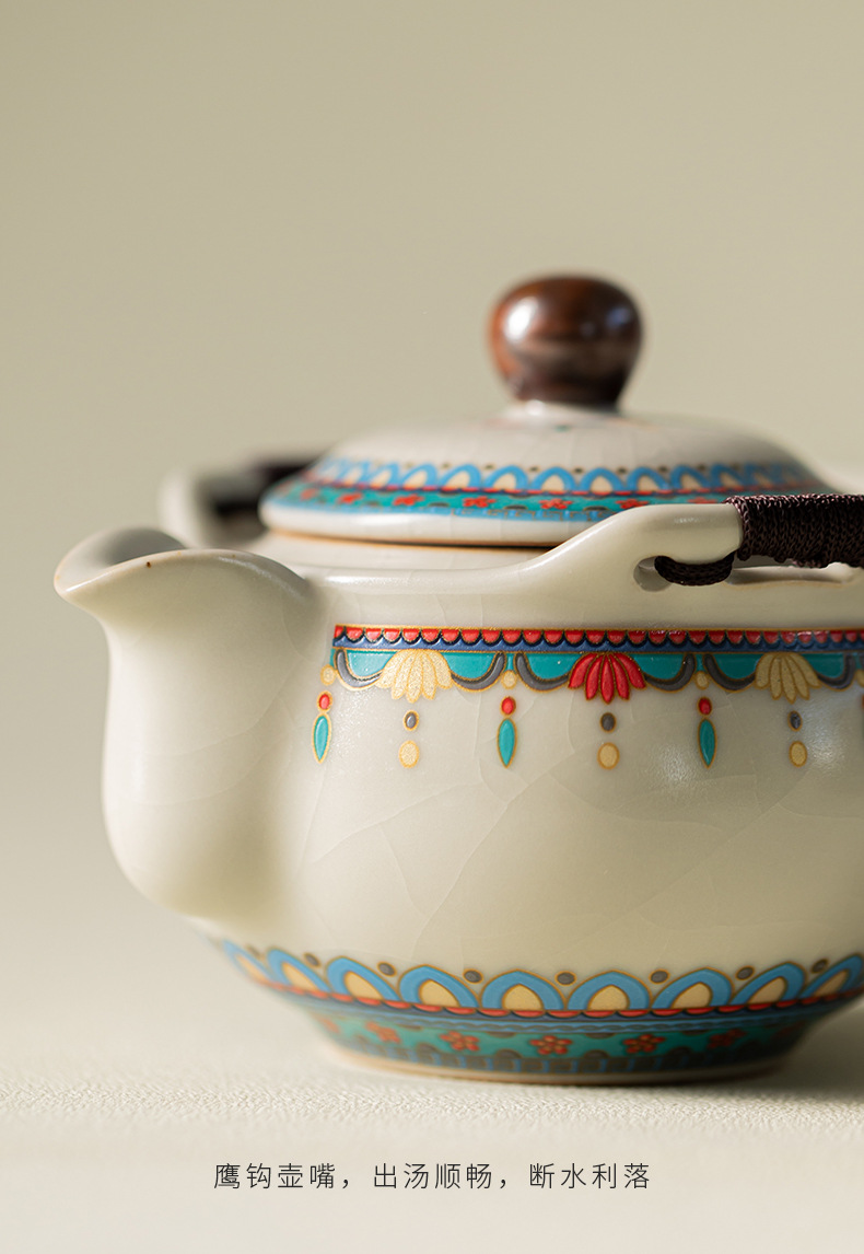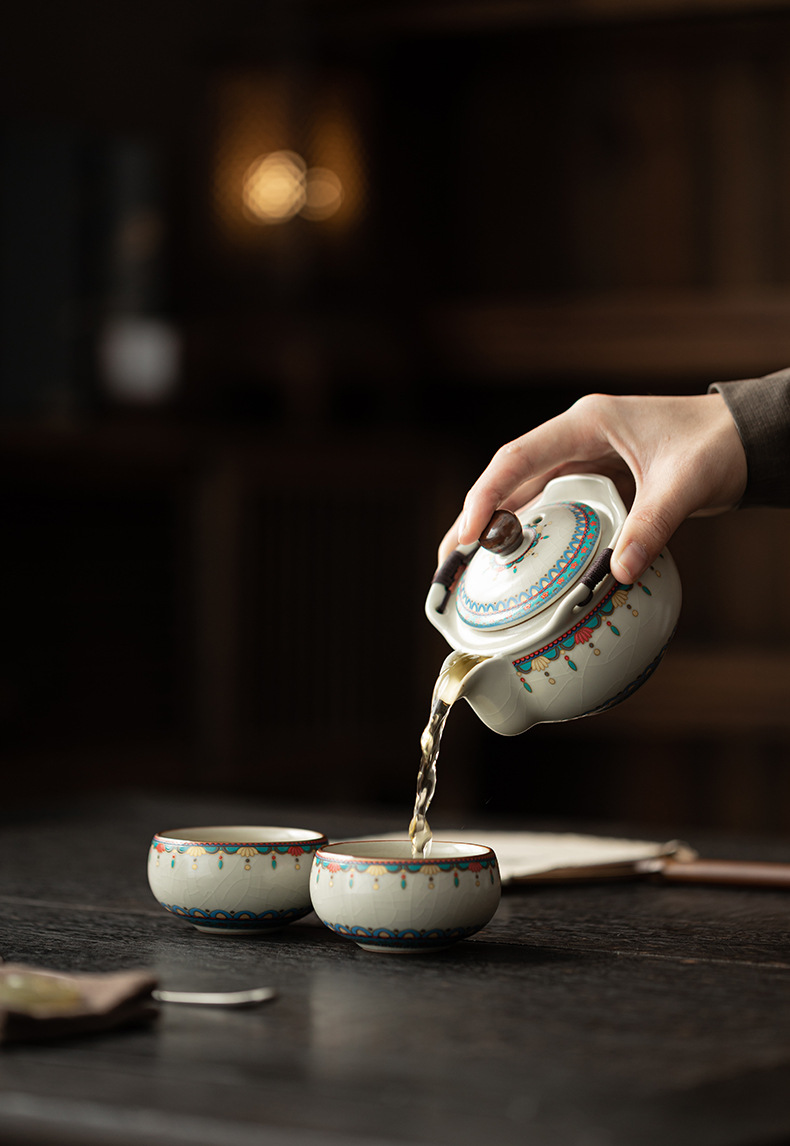 Ru Kiln Đôn Hoàng Ruyi Bộ trà du lịch một ấm hai cốc gốm cầm tay ấm trà ngoài trời pha trà cầm tay quà tặng