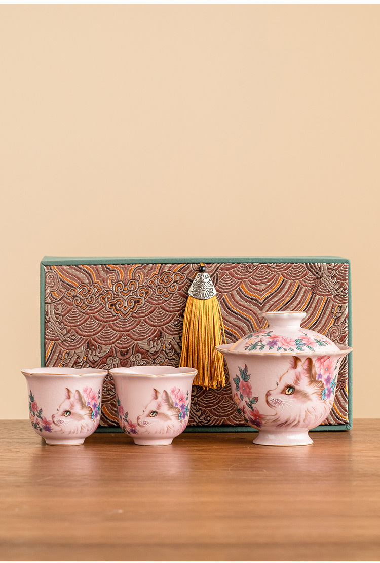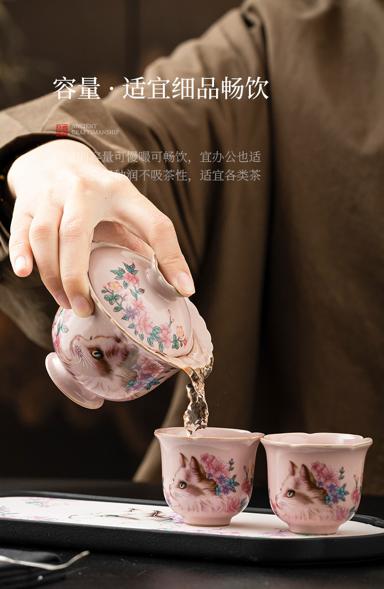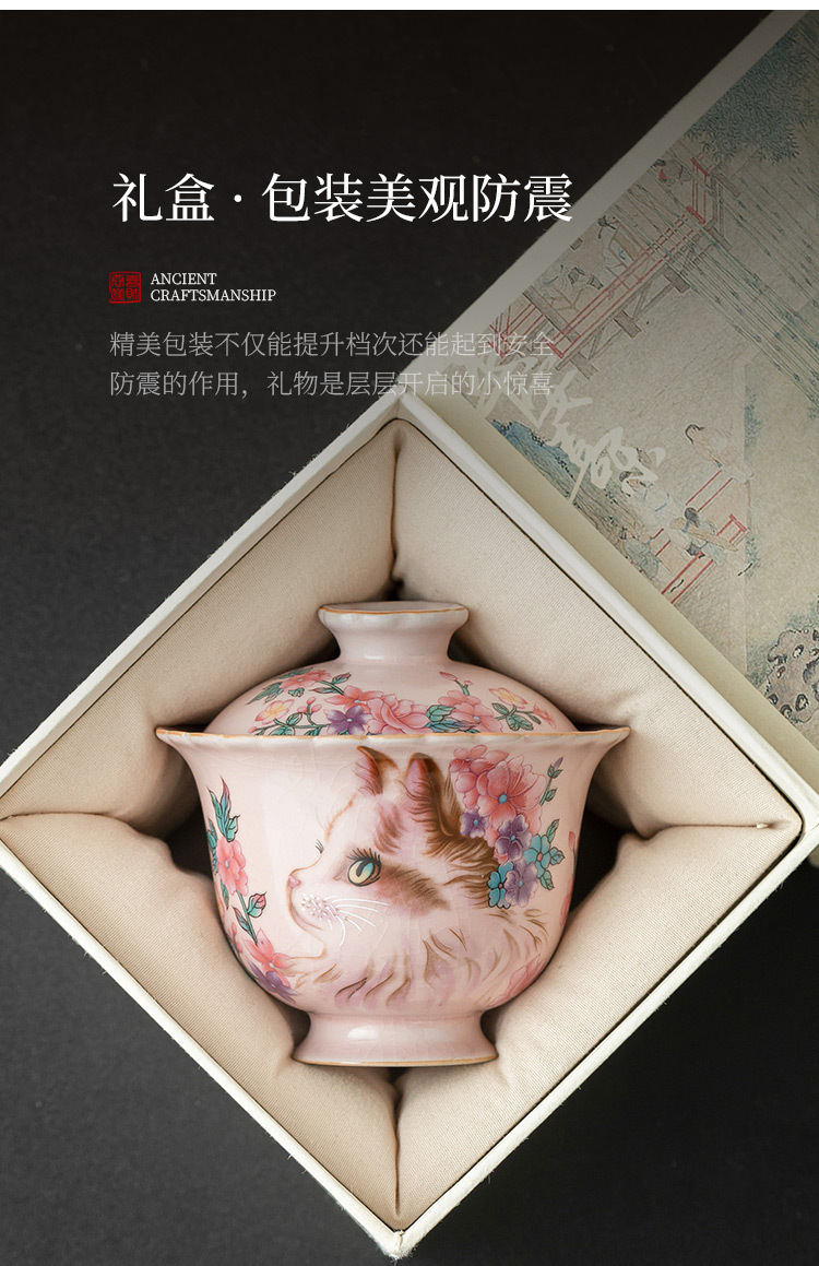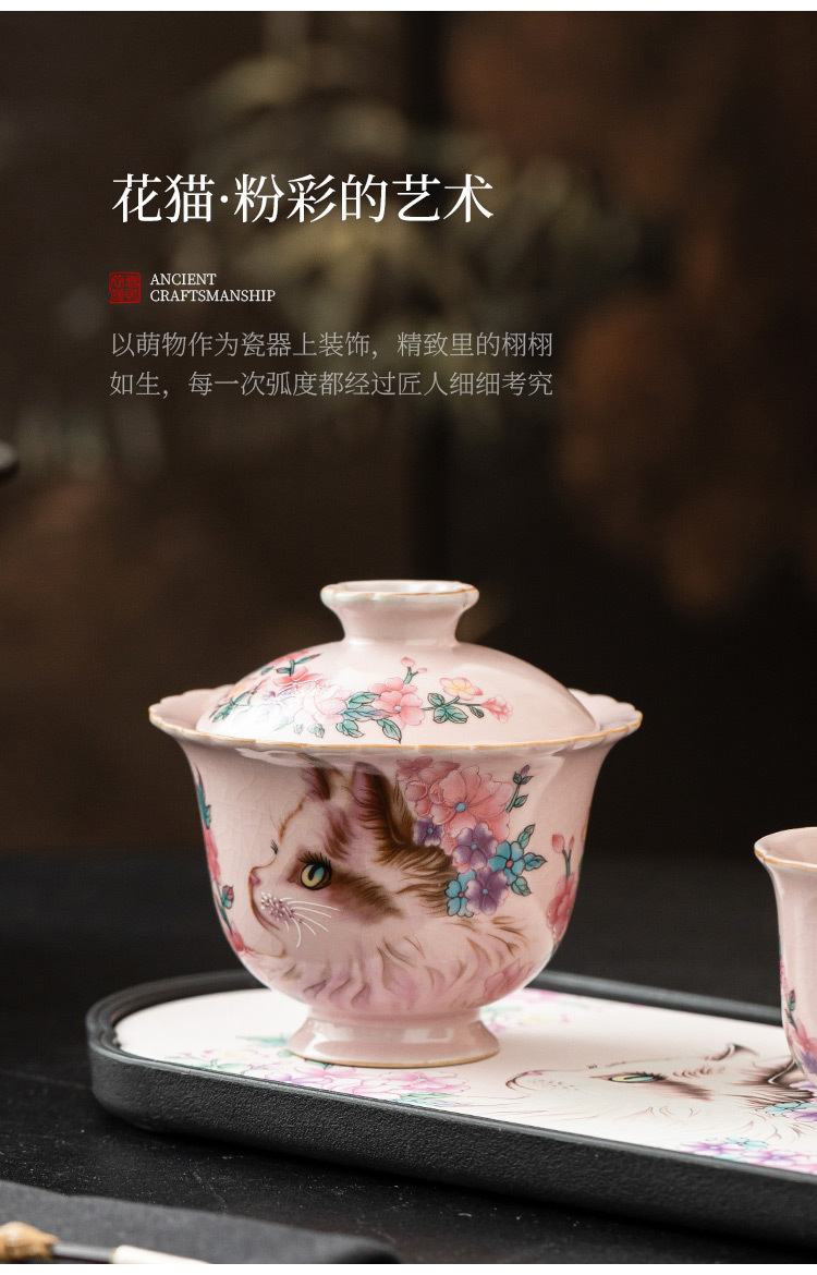 Ru Kiln Hoa Mèo Họa Tiết Hoa Miệng Bát Có Chân Cao, Tách Trà Gốm Ru Màu Hồng, Đơn Có Nắp, Bộ Pha Trà Gia Đình Cho Nữ, Kích Thước Lớn.