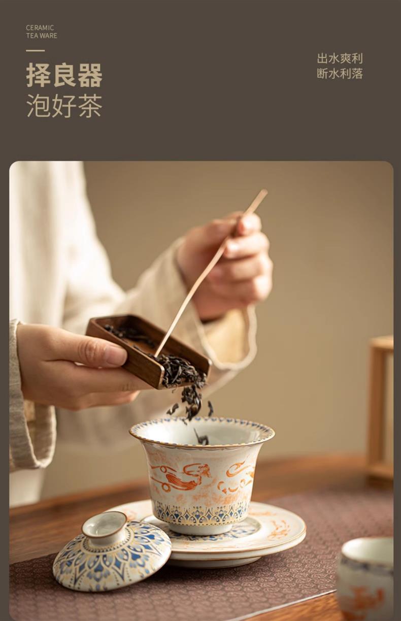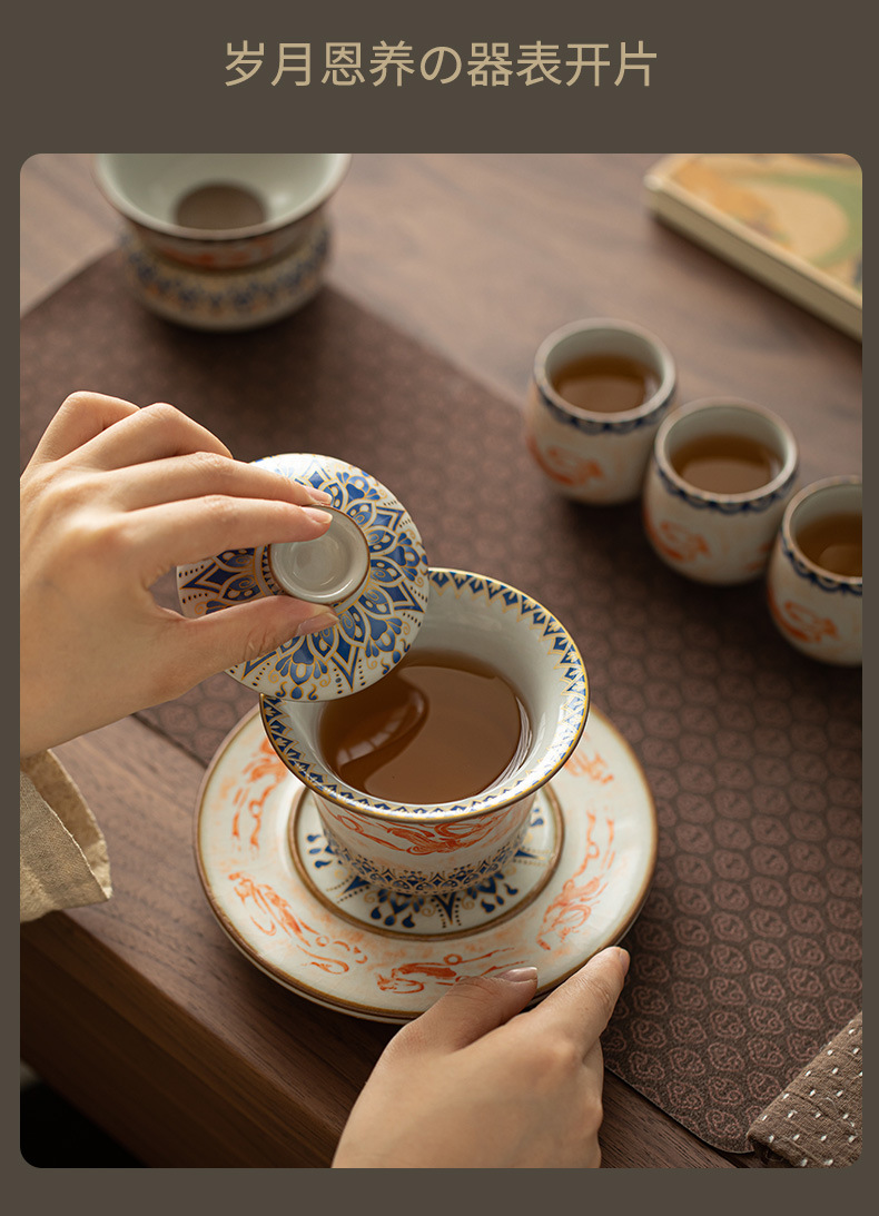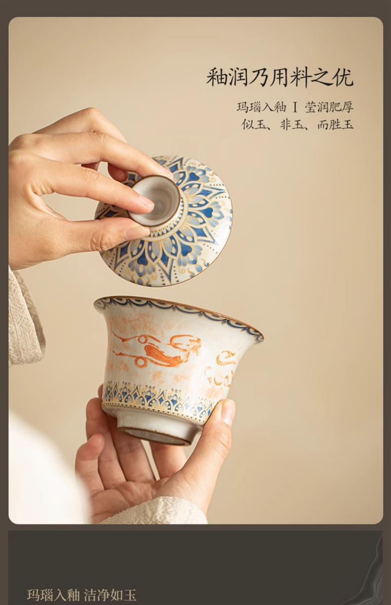 - Ruyao Đôn Hoàng Flying Sky Horseshoe Sancai Bát có nắp Bộ ấm trà Kung Fu Bộ chén trà gốm sứ gia dụng trọn bộ