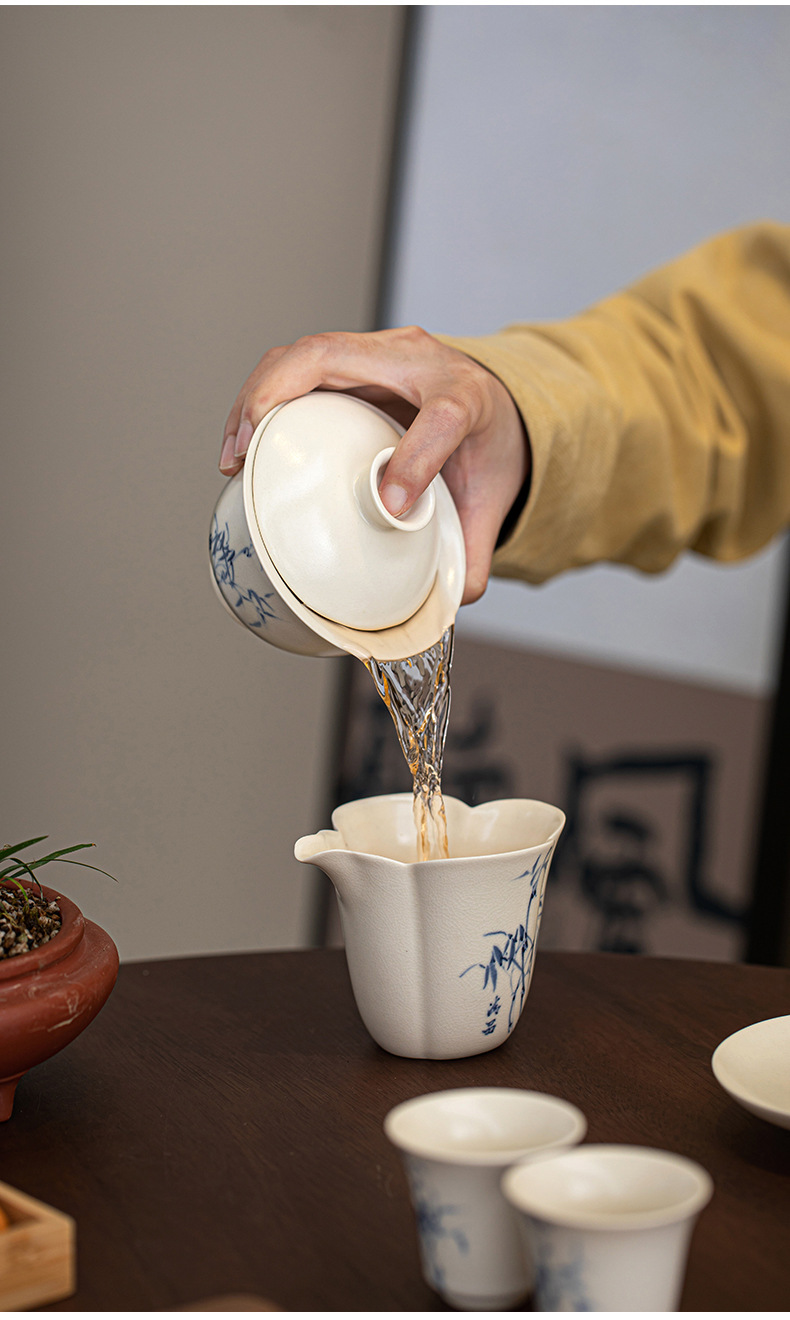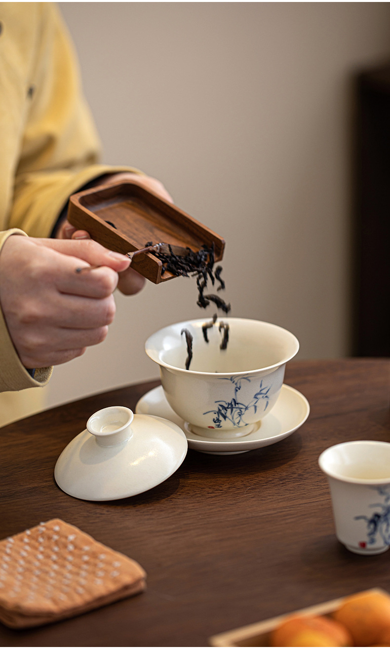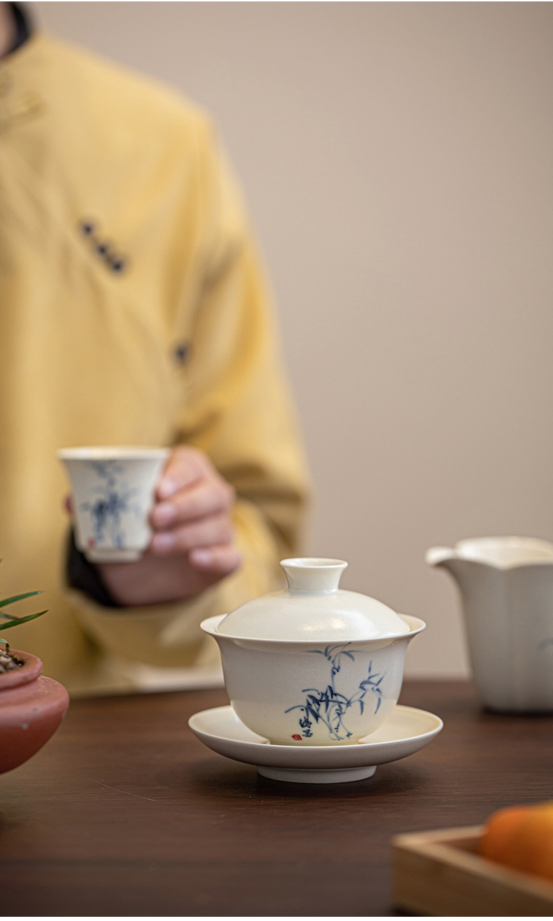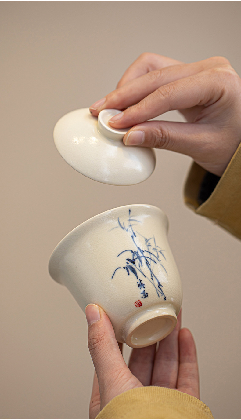 Soda tráng men hai nắp bát pha trà tre vẽ tay dụng cụ pha trà Kung Fu gia dụng bát trà sứ trắng không nóng tay