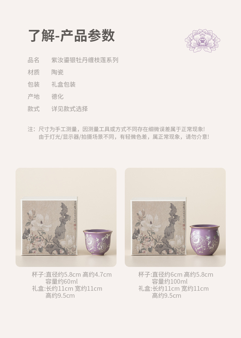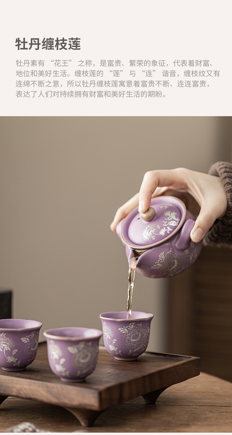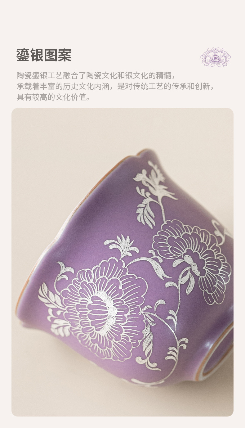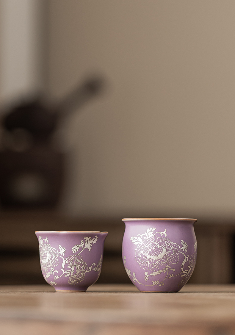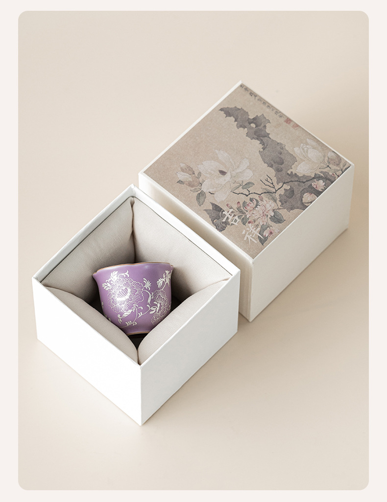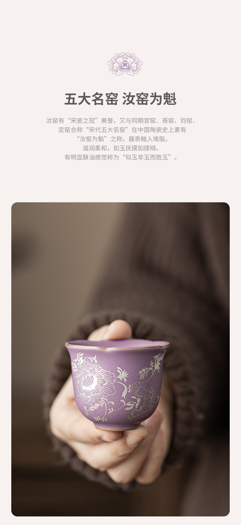 Tách trà hoa mẫu đơn bạc Ru tím Dehua, bộ ấm chén gốm sứ, tách khách, tách đơn, dành cho nữ, phong cách Kung Fu, dùng tại nhà