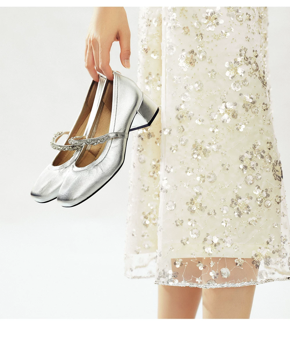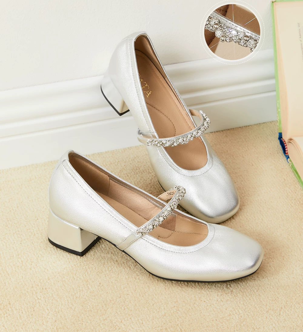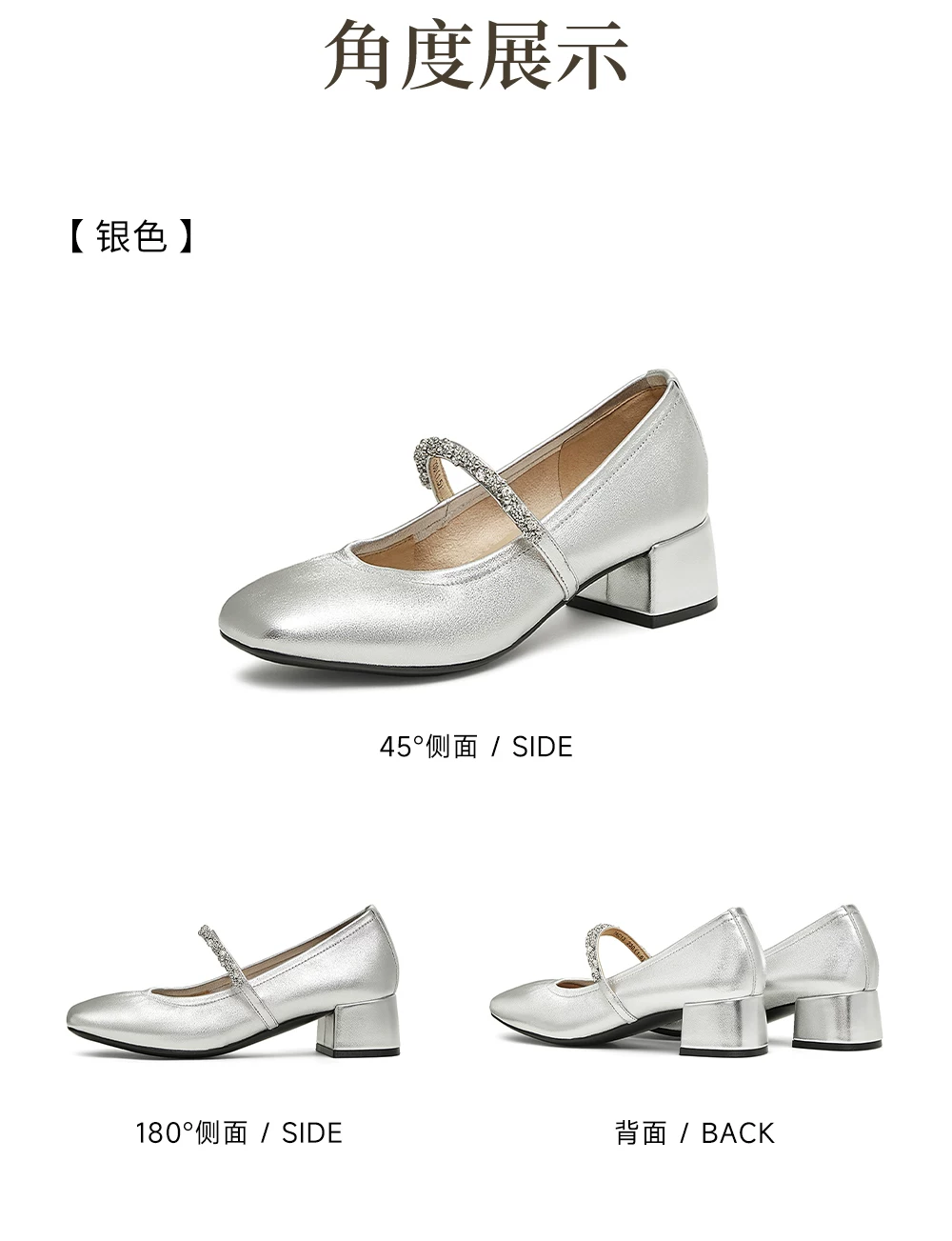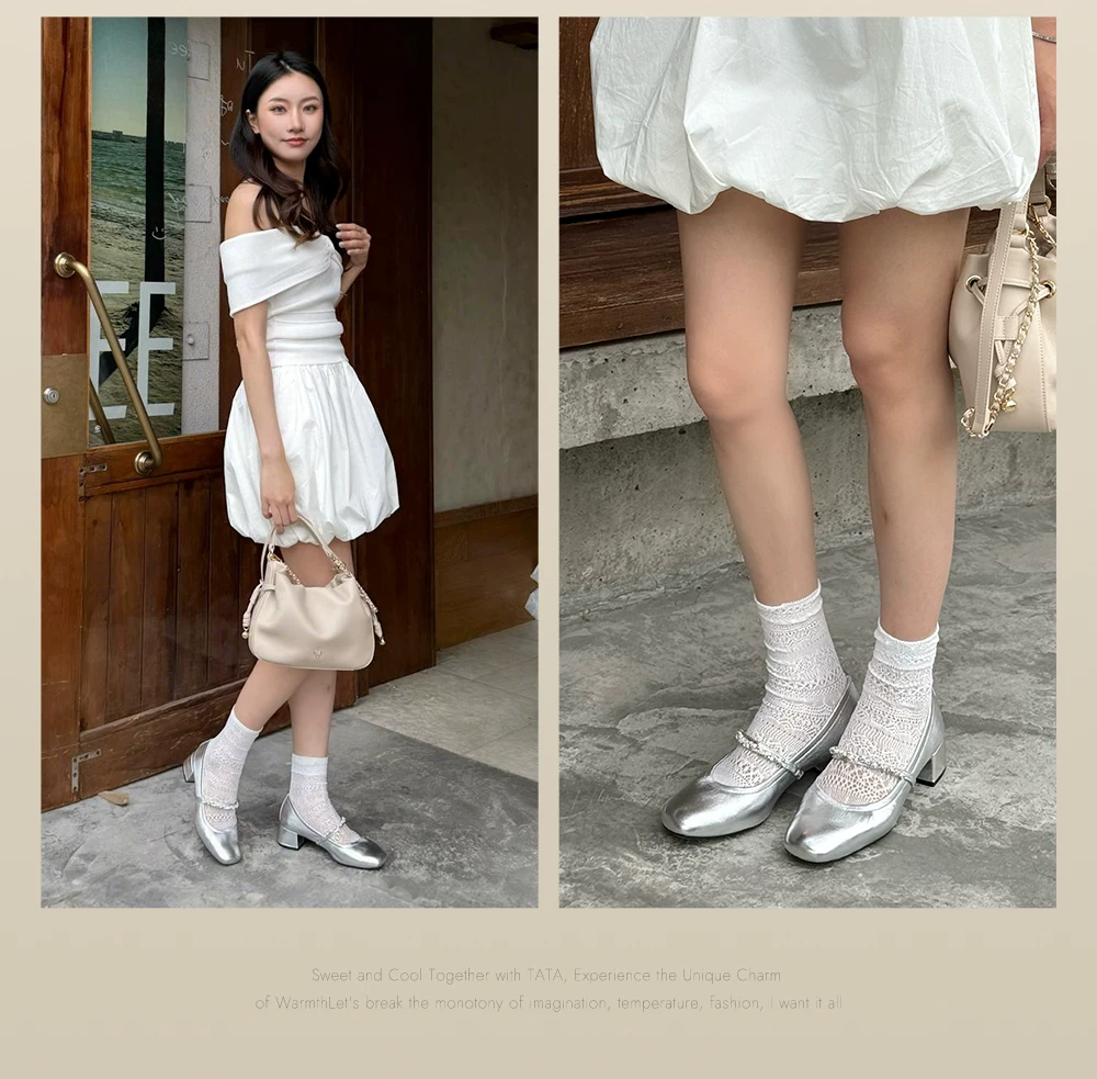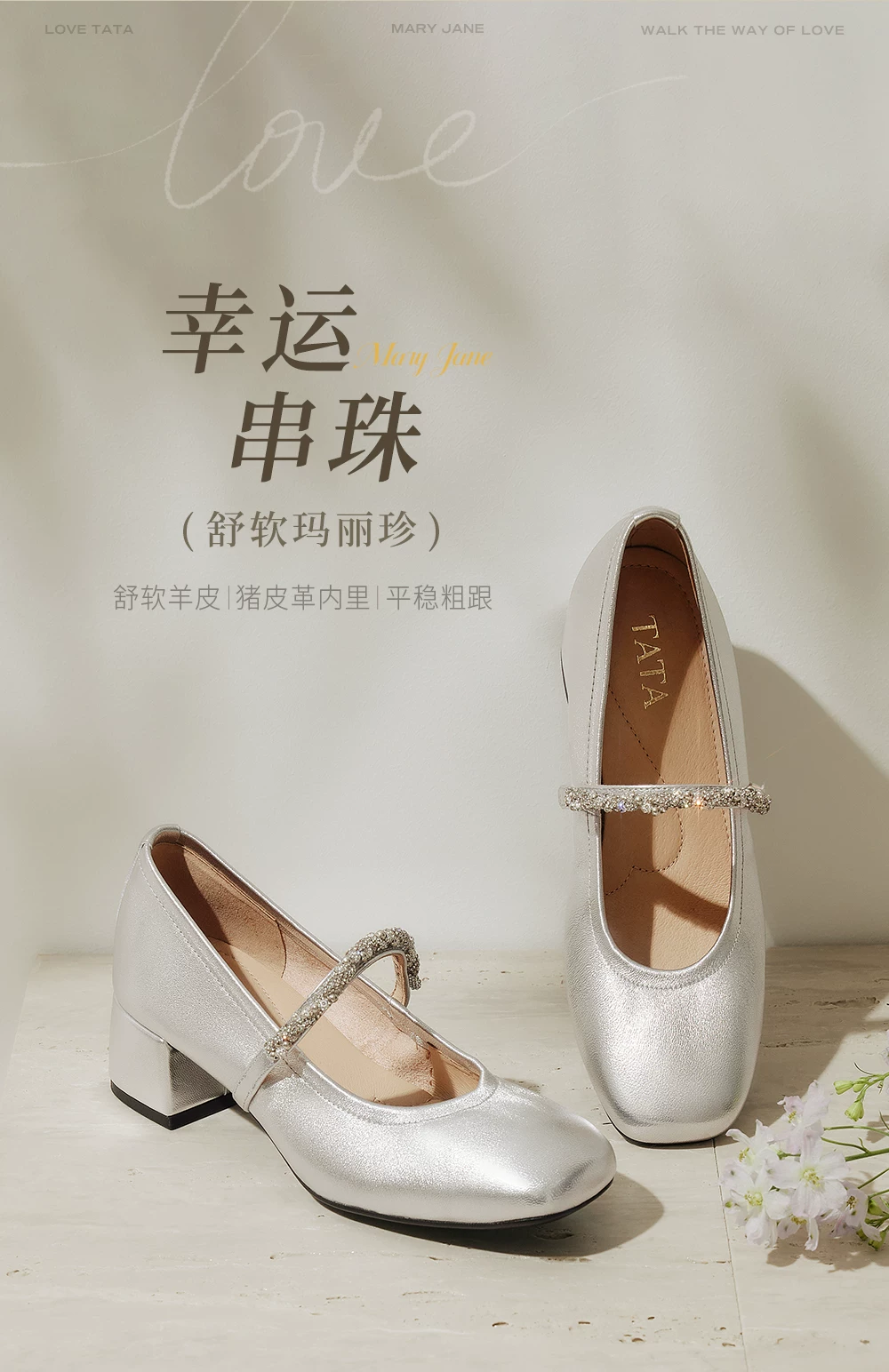 - TATA Sweetheart Mary Jane 2025 giày nữ mới da cừu gót nhọn giày đơn màu bạc giày da nhỏ 7AC13AQ5