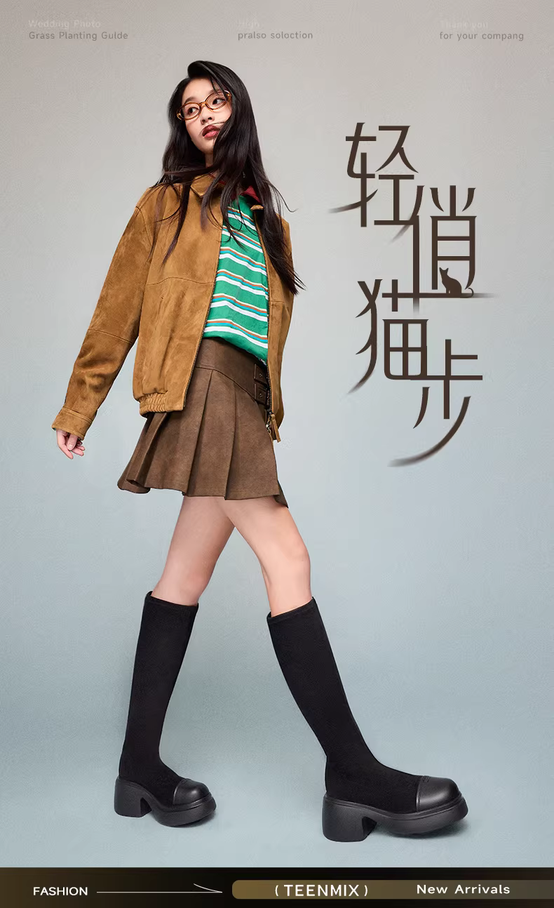 Tianmeiyi retro đế dày tăng chiều cao lót lông cừu co giãn thời trang giày bốt nữ cao cổ mùa đông mẫu mới CPB81DG4