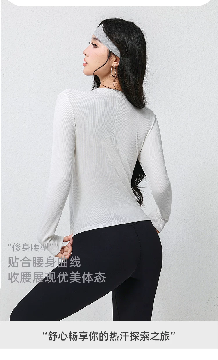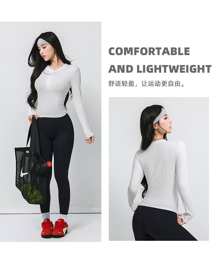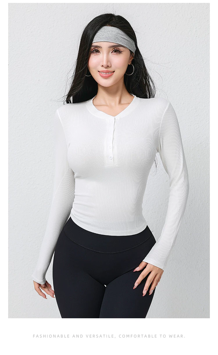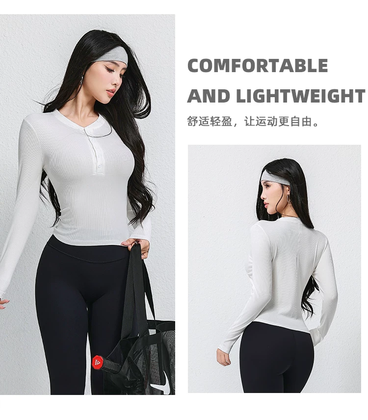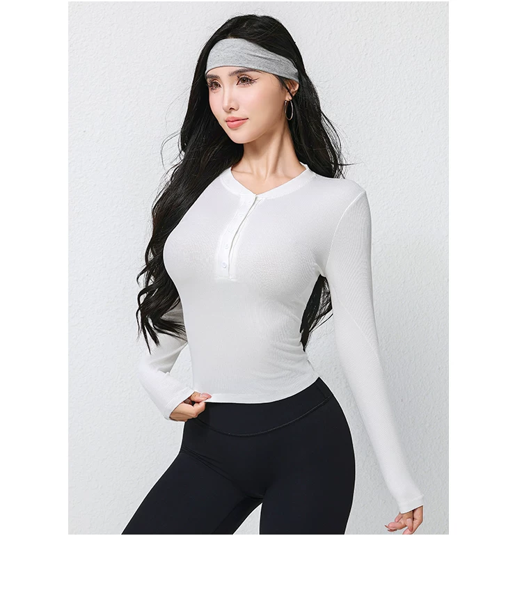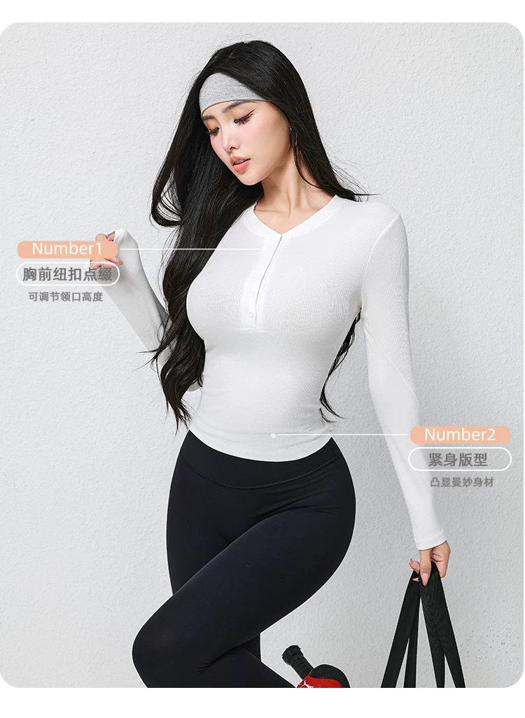 - Trang phục tập yoga mới mùa thu dành cho nữ, áo thun dài tay, cổ Henry cổ điển, dáng ôm, trang phục tập thể dục chạy bộ