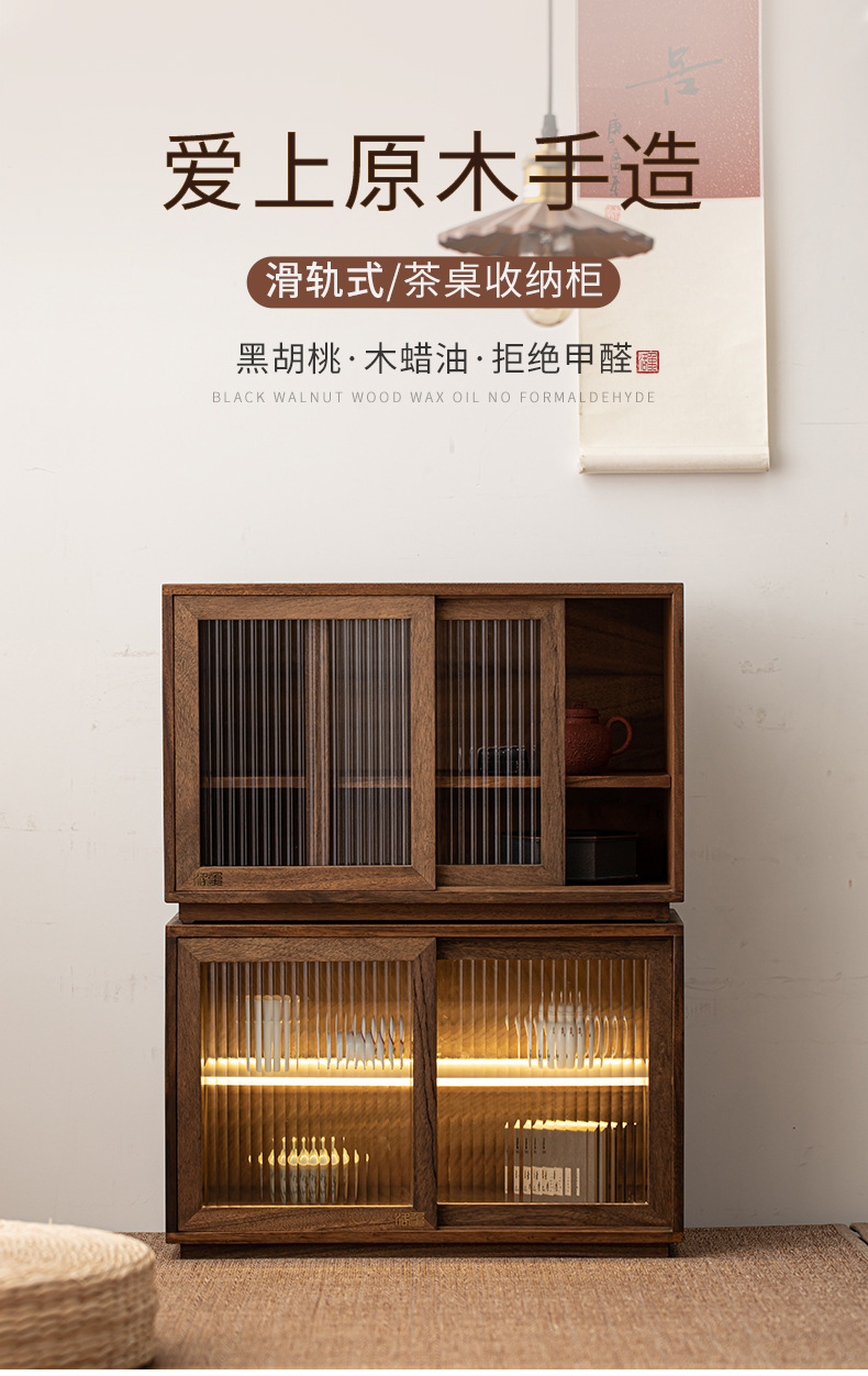 Tủ đựng đồ để bàn gỗ óc chó, đèn cảm ứng, cửa trượt chống bụi, Tủ Đựng Đồ Kiểu Trung Quốc mới, Bộ trà, giá để cốc