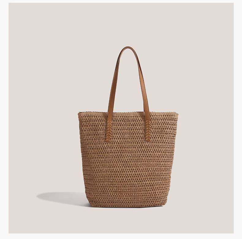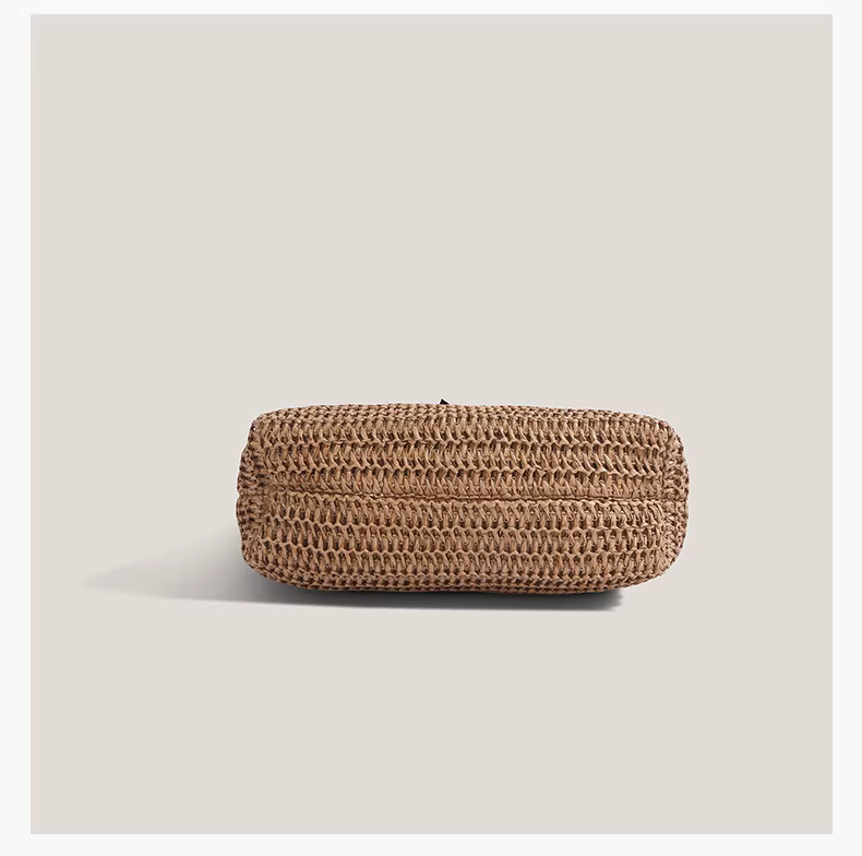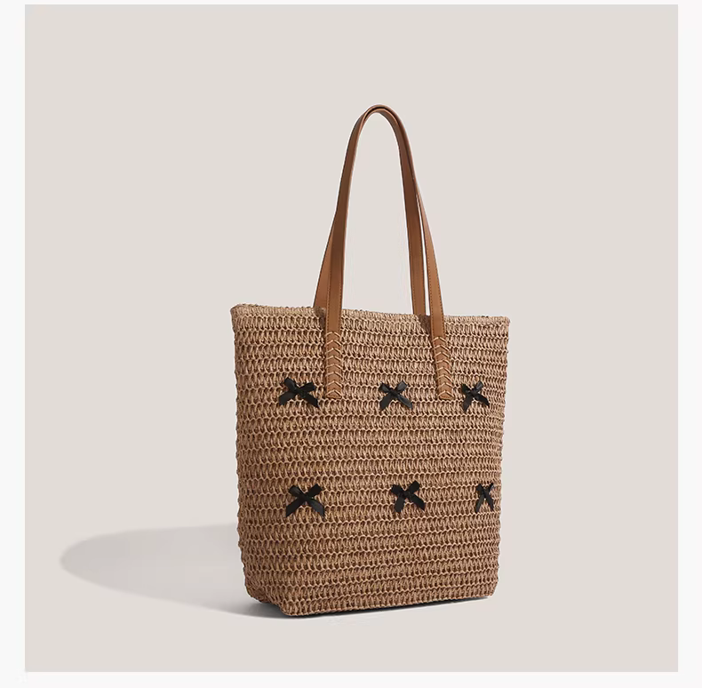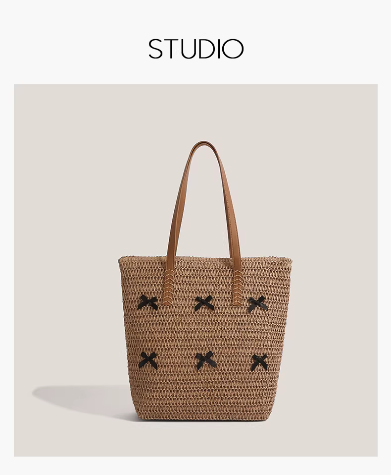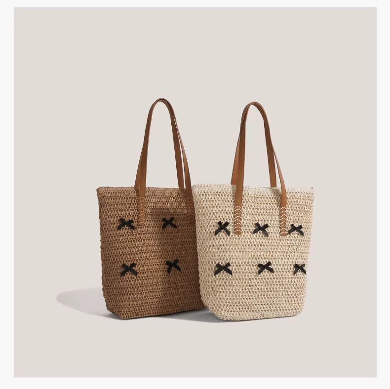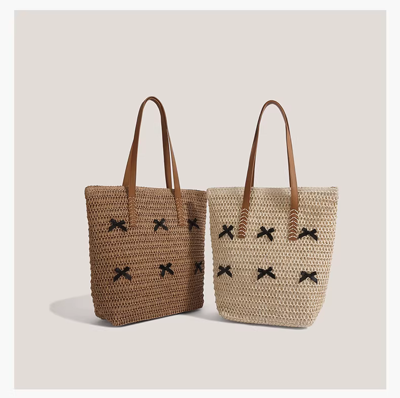 Túi cói thắt nơ dành cho nữ, mẫu mới hè 2025, phong cách nghỉ dưỡng, túi tote cỡ lớn, kiểu retro