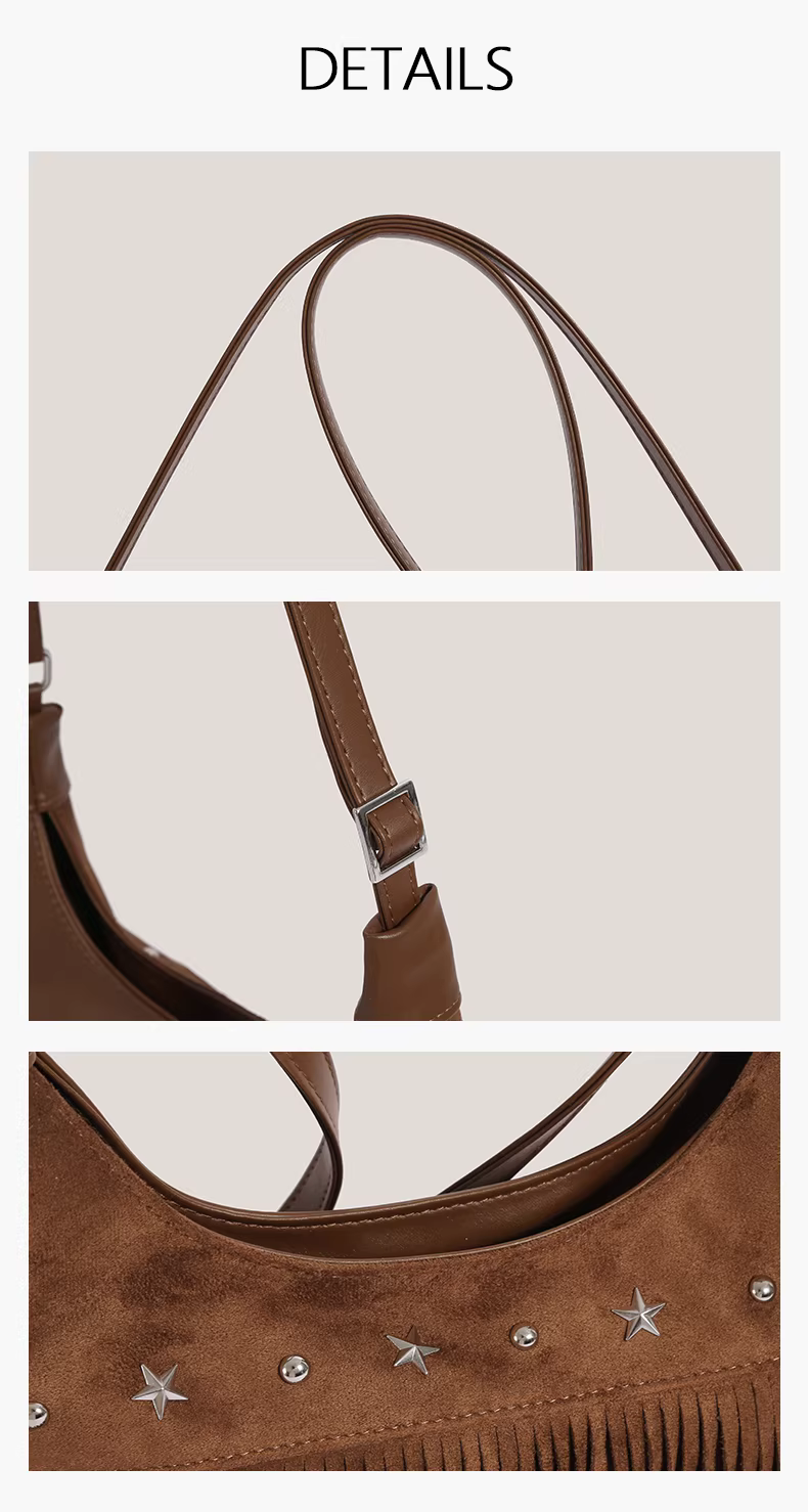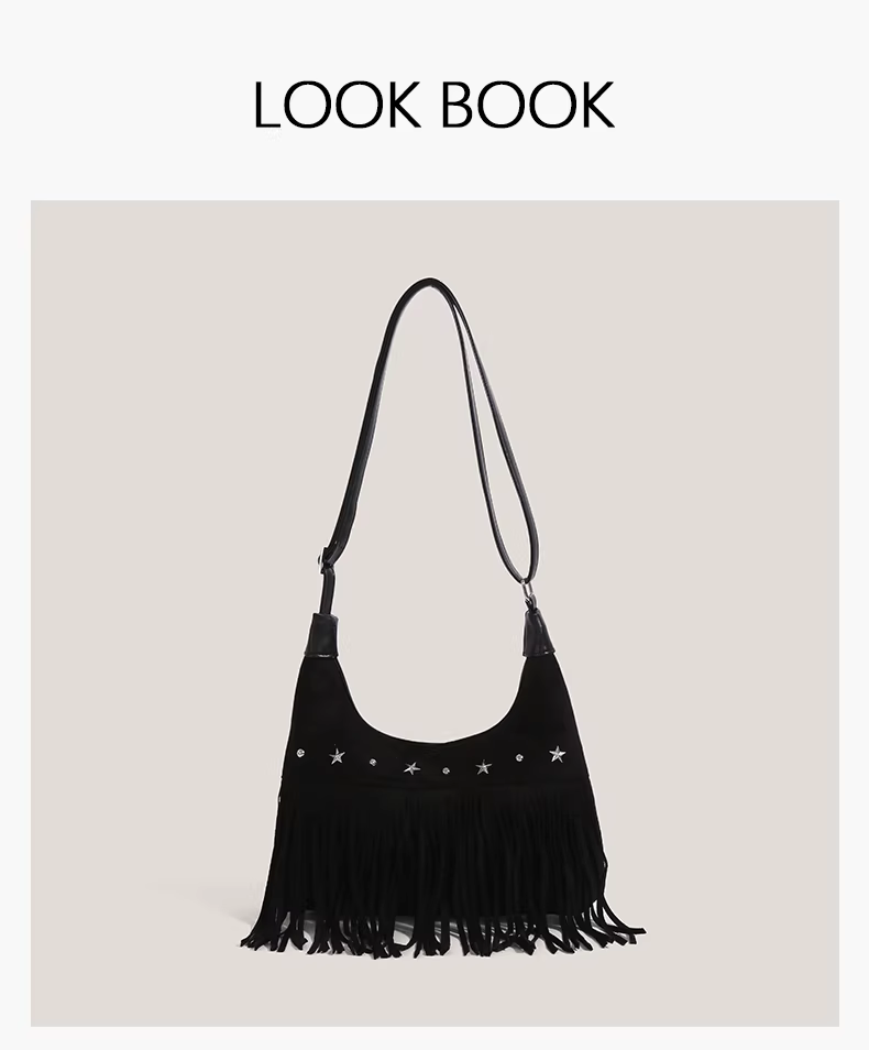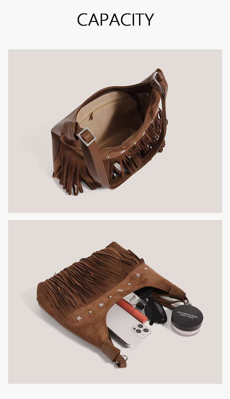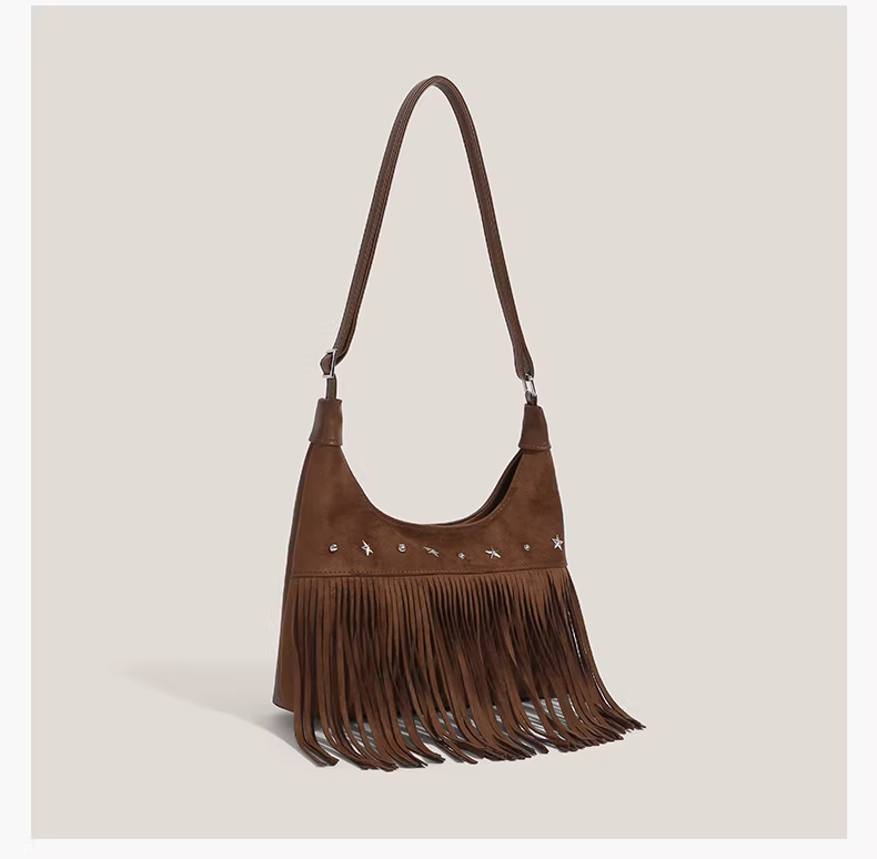 - Túi xách da lộn mờ kiểu retro dành cho nữ, mẫu mới thu đông 2025, đa năng, đeo vai, đeo chéo, phong cách boho, có tua rua