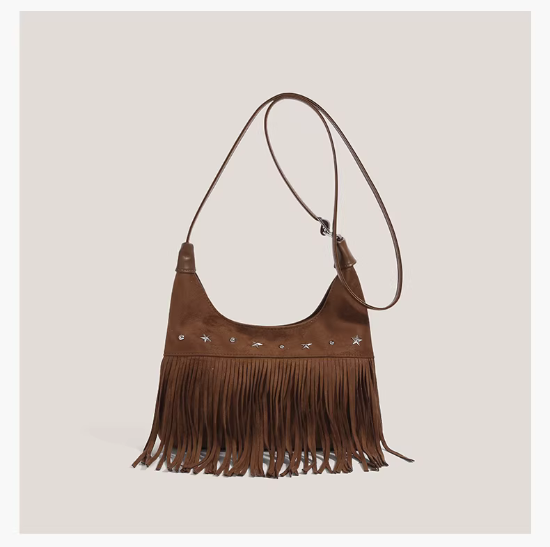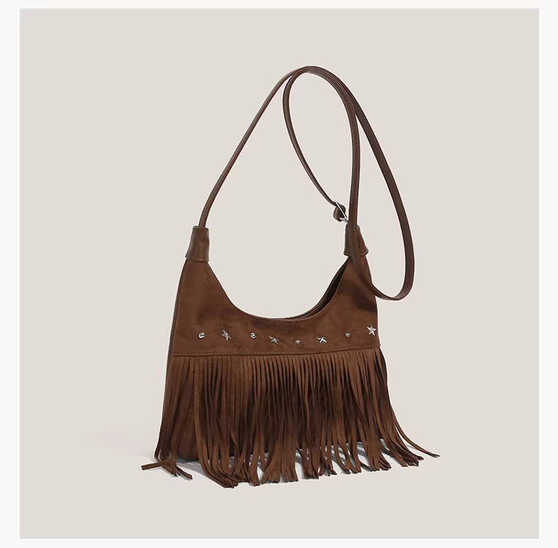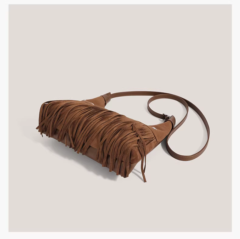 Túi xách da lộn mờ kiểu retro dành cho nữ, mẫu mới thu đông 2025, đa năng, đeo vai, đeo chéo, phong cách boho, có tua rua