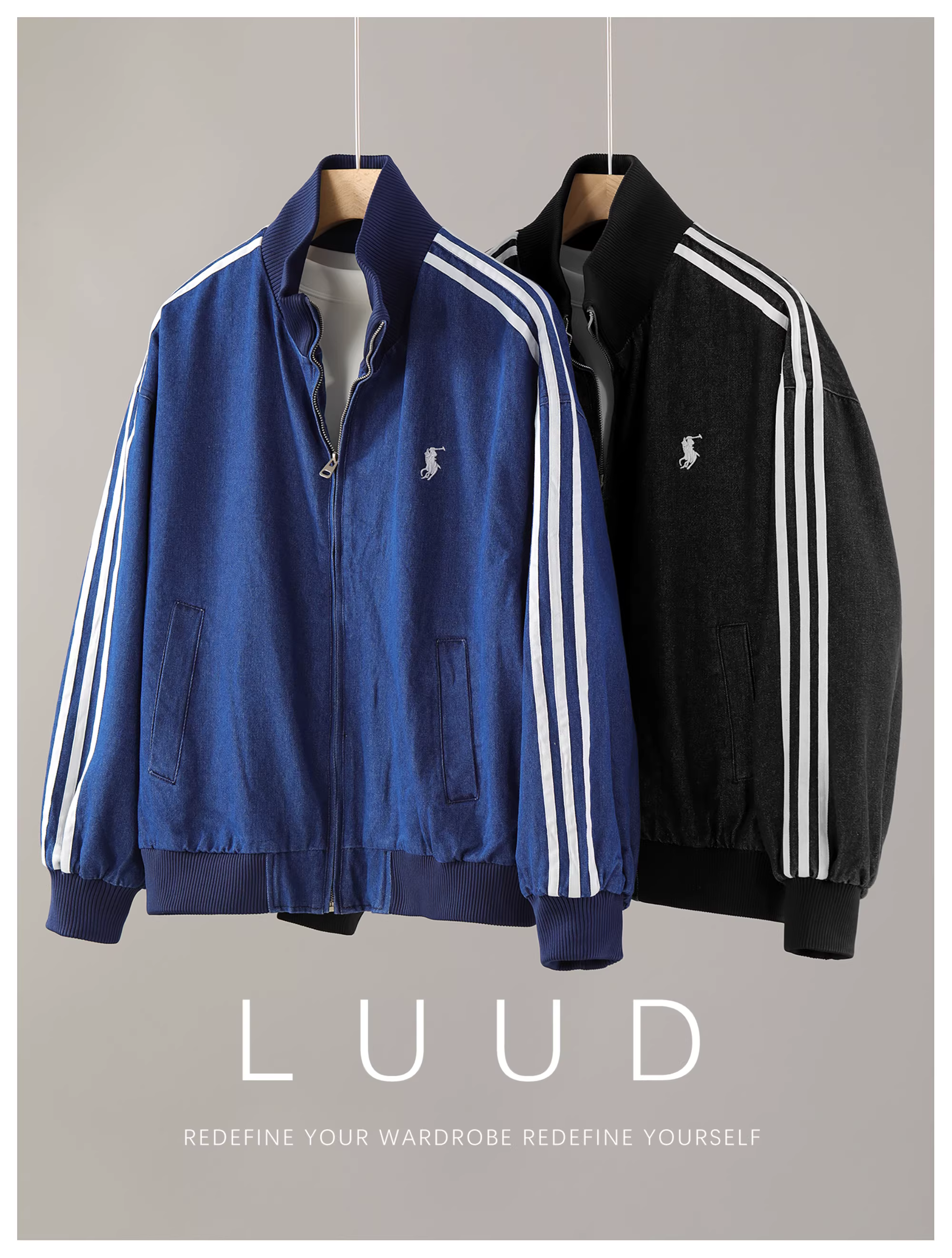 Ưu đãi đặc biệt: Áo khoác denim ba sọc phong cách thể thao cổ điển Mỹ, thêu họa tiết hiệp sĩ, phối vải dệt kim và cổ đứng cao.