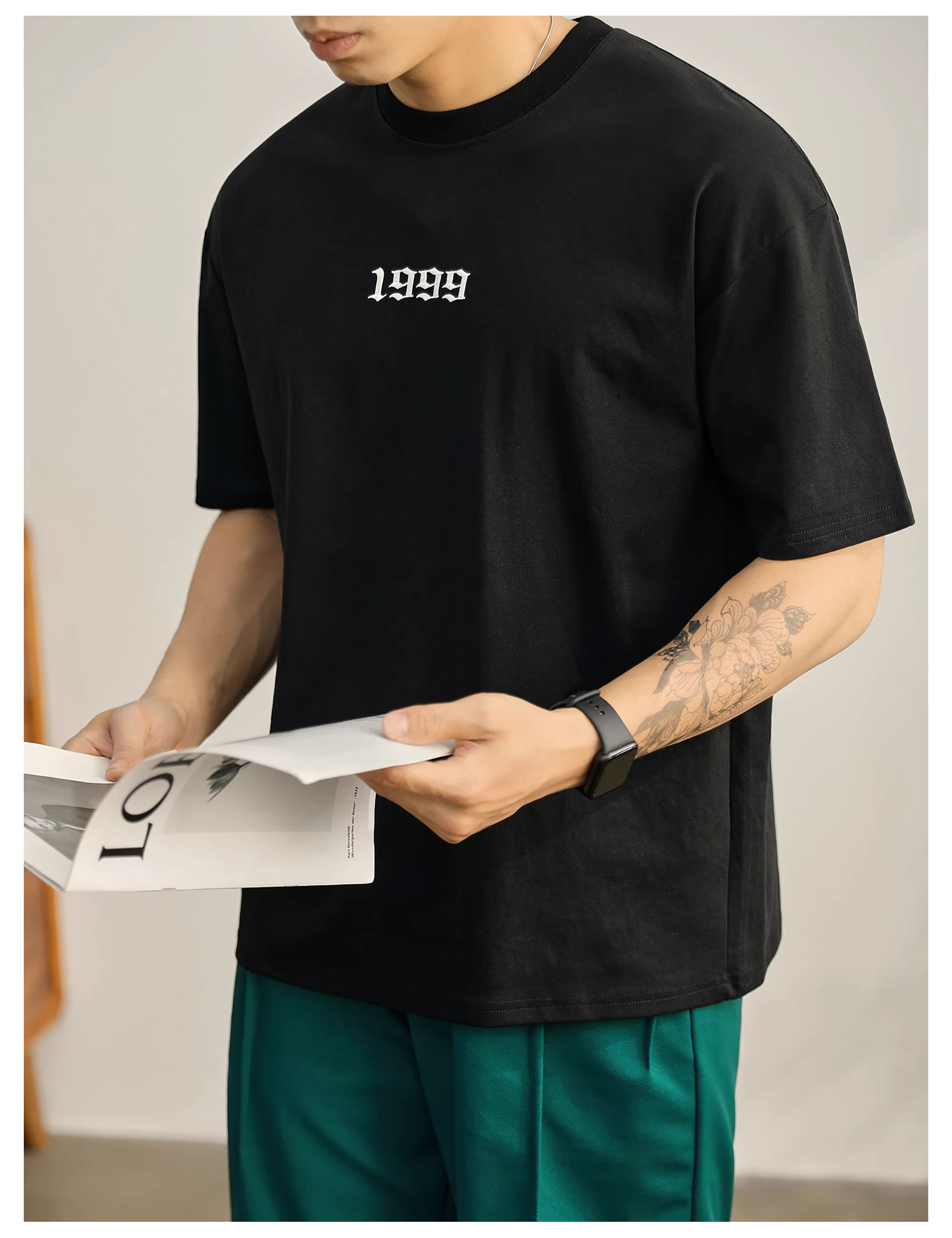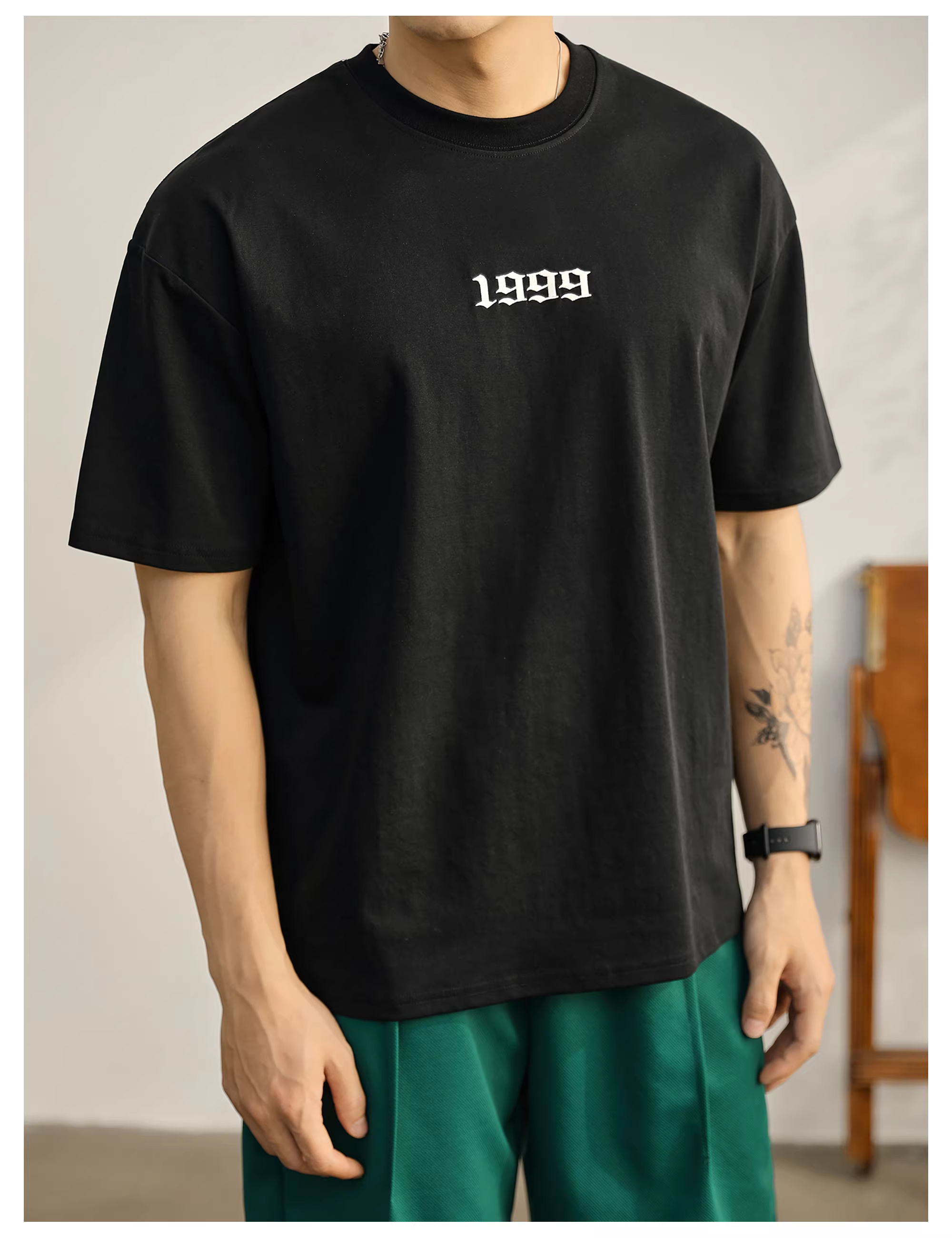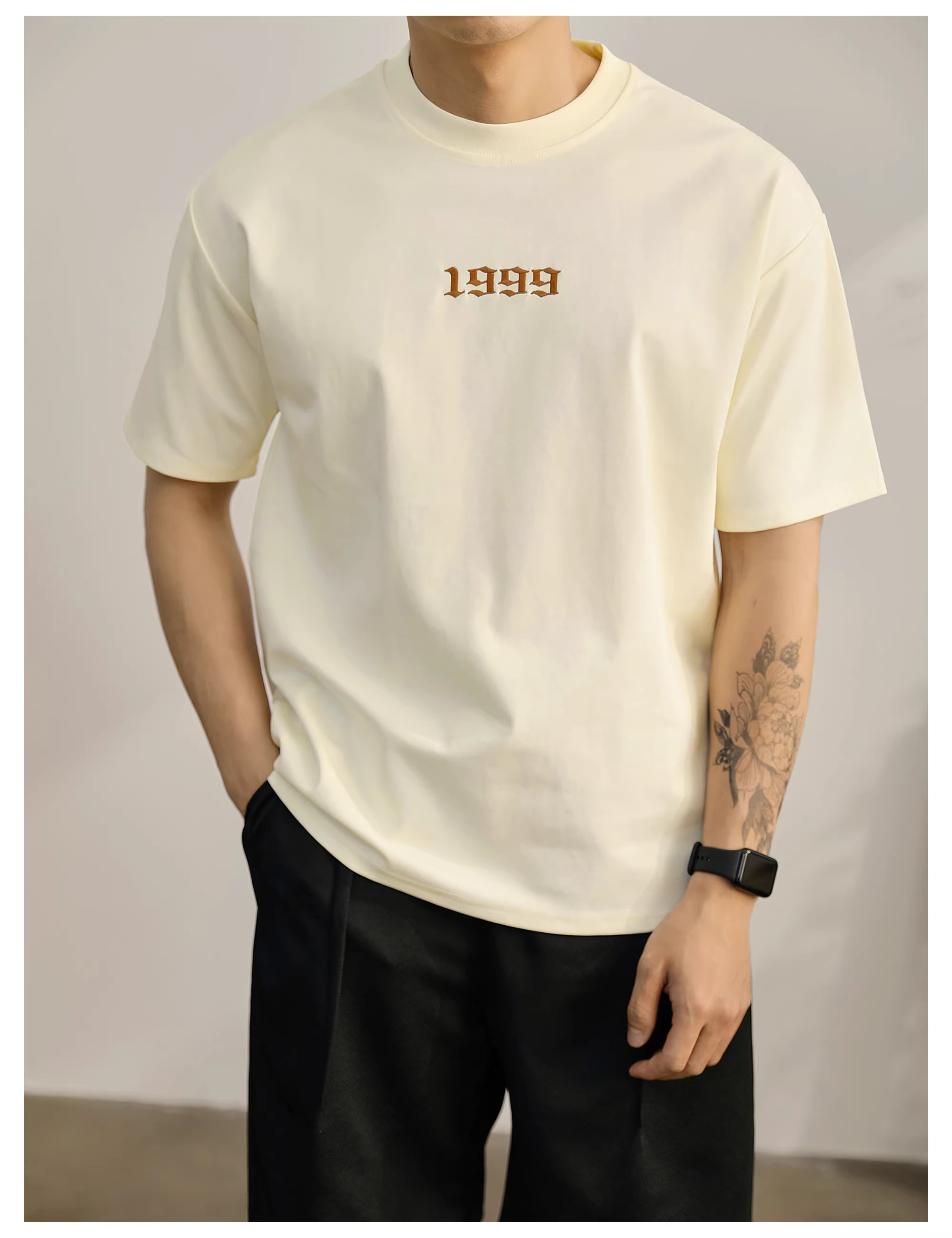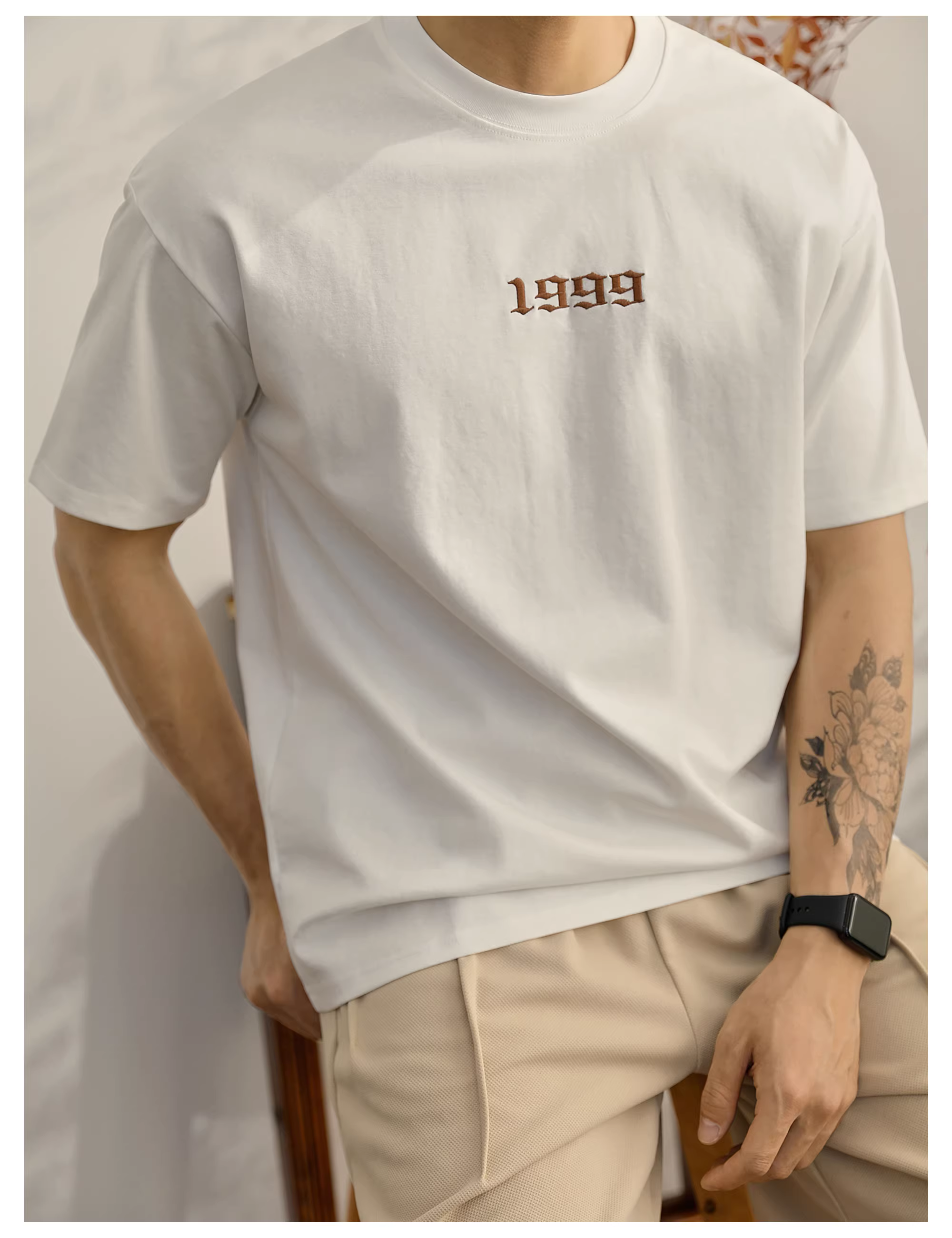 Ưu đãi đặc biệt: Áo thun nam tay ngắn cổ tròn thêu họa tiết đơn giản 1999, thời trang mùa hè chất liệu cotton, kiểu dáng hơi xuông vai.