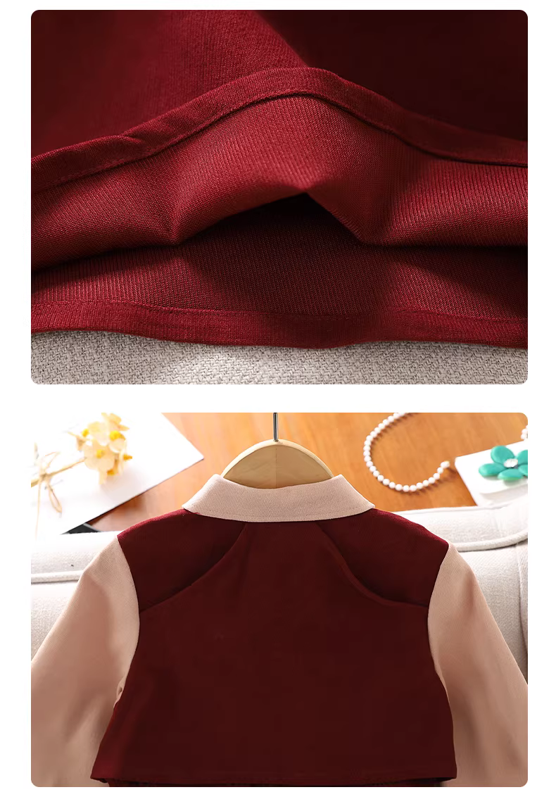 - Váy áo kiểu nữ sinh 2025 kiểu mới giả hai mảnh dành cho bé gái lớn màu đỏ phong cách preppy mùa xuân