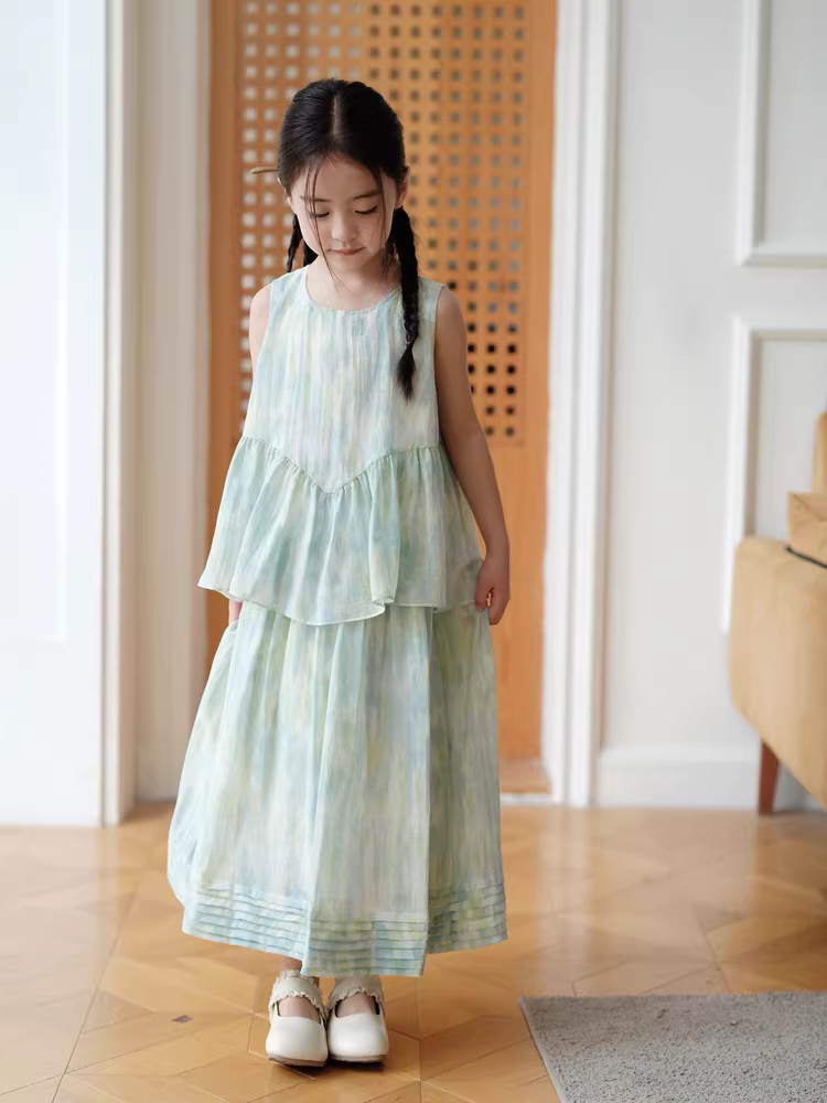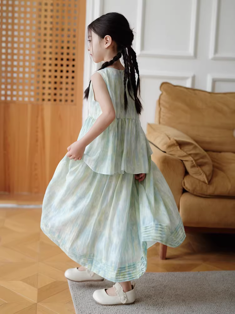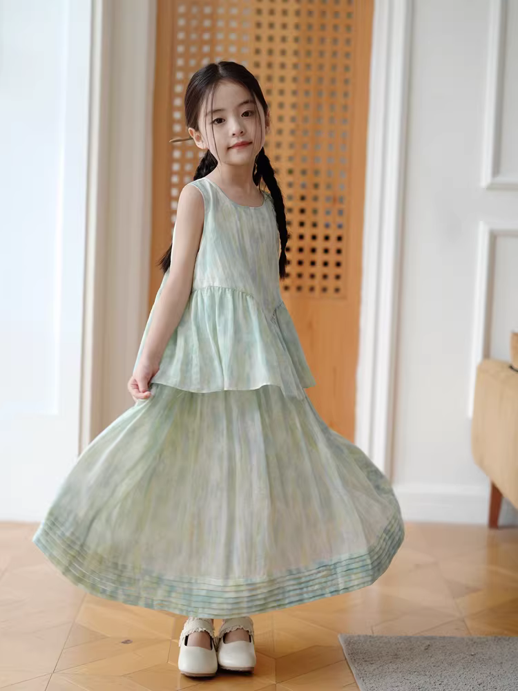 - Váy bé gái phong cách Trung Hoa, bộ hai mảnh tươi mát, váy voan trẻ em, mùa hè 2025, trang phục công chúa trẻ em thanh lịch không tay